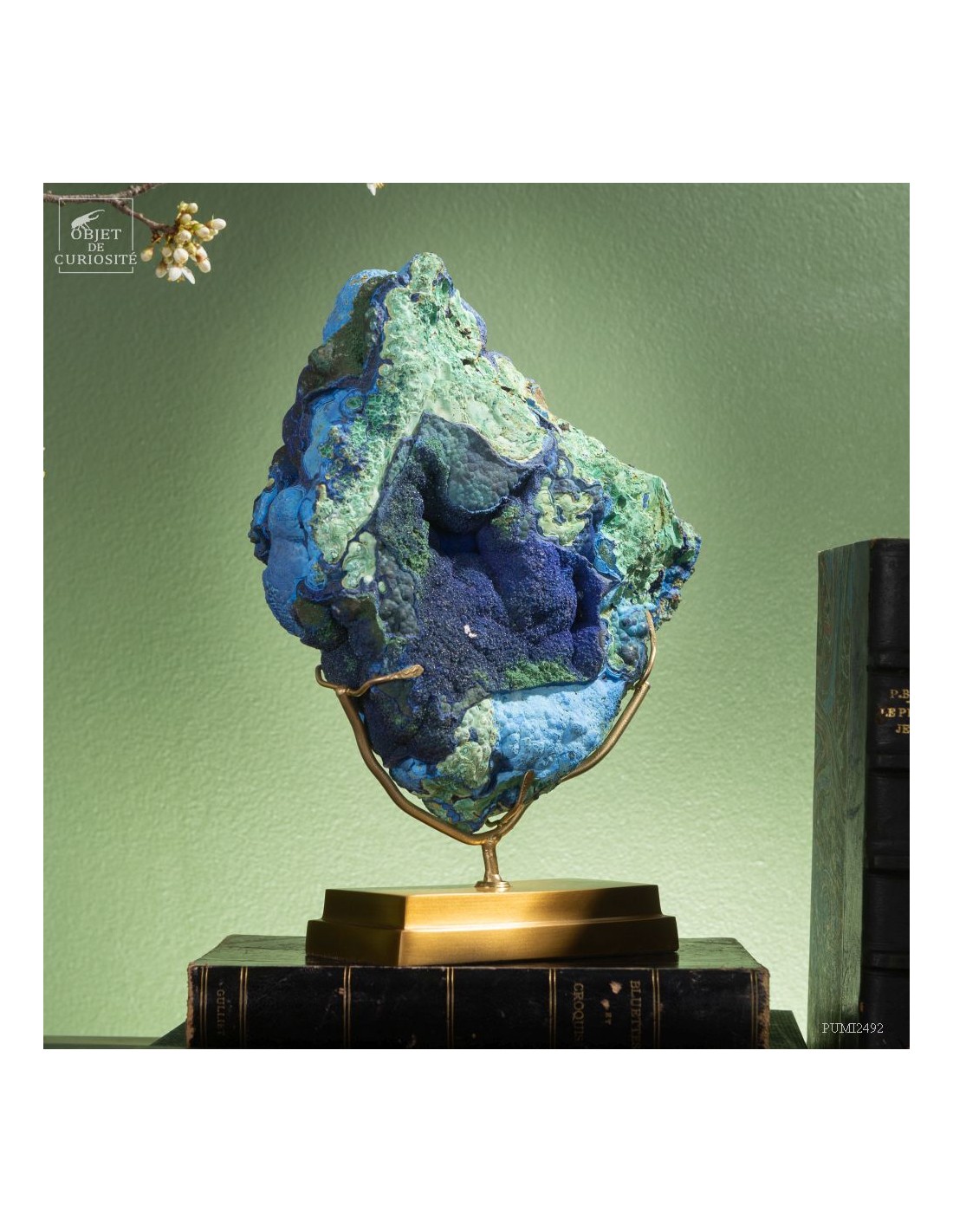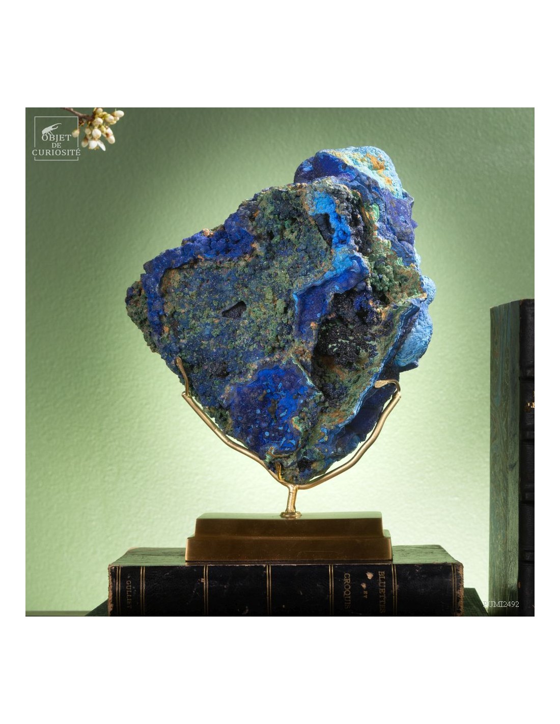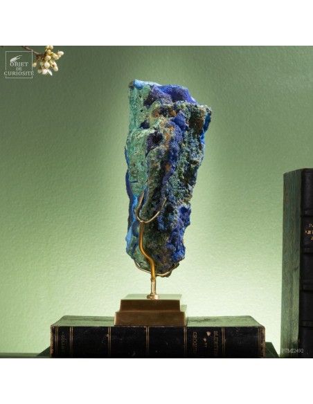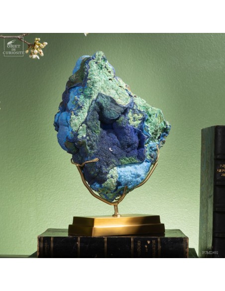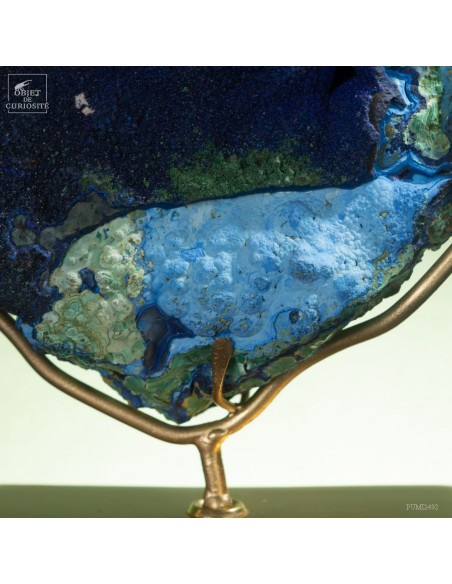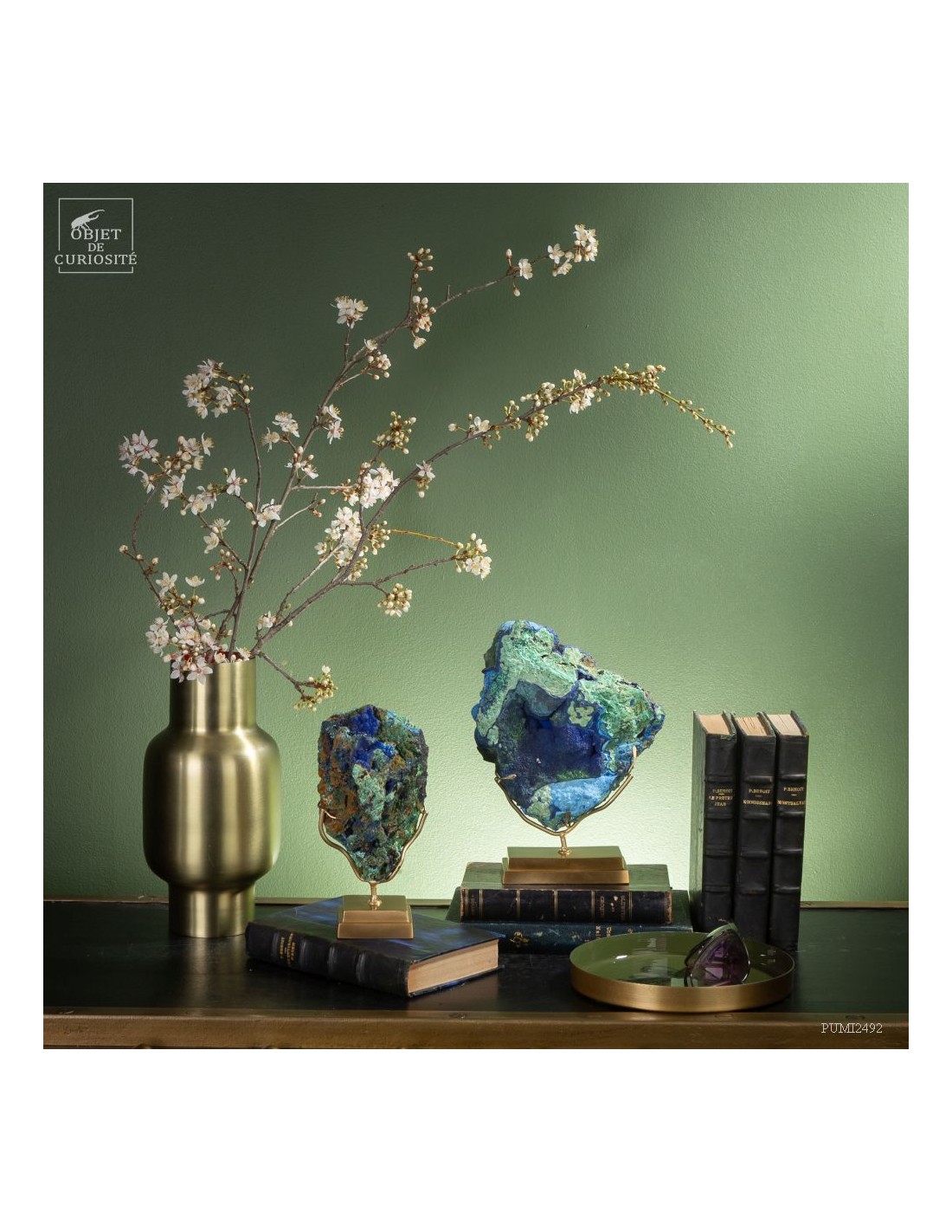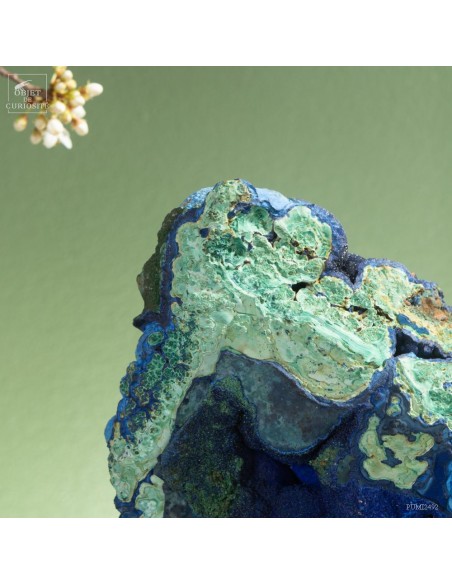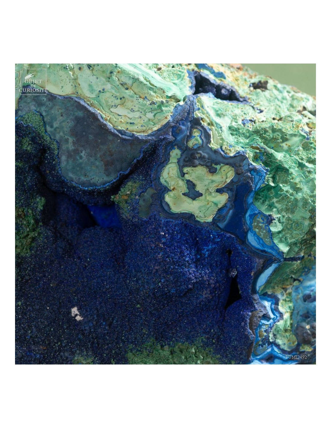 Deux couleurs éclatantes : ces deux minéraux sont souvent trouvés ensemble a proximité de veines de cuivre. L'Azurite, incroyablement bleue, est en fait en carbonate de cuivre, et peut dans certains cas évoluer vers la Malachite, intensément verte. Ces deux minéraux ont été utilisés comme pigments pour la peinture dès le 27ème siècle avant J.C. par les Egyptiens!