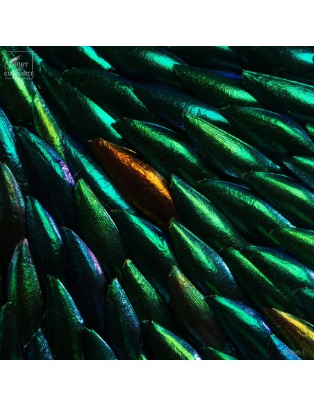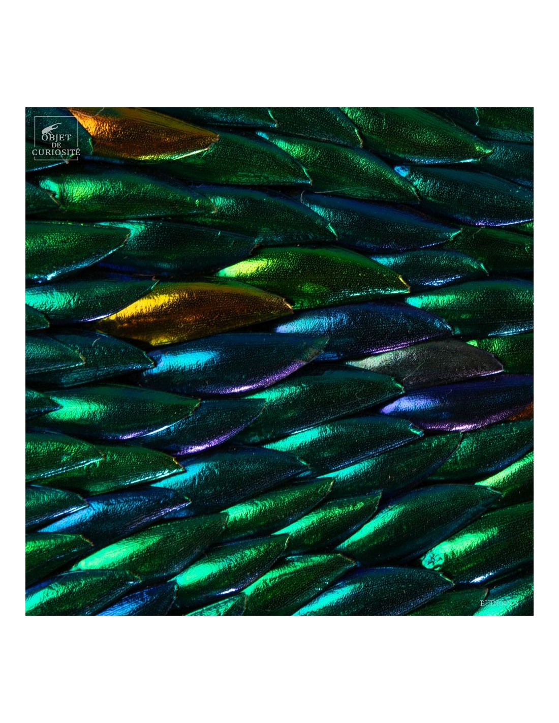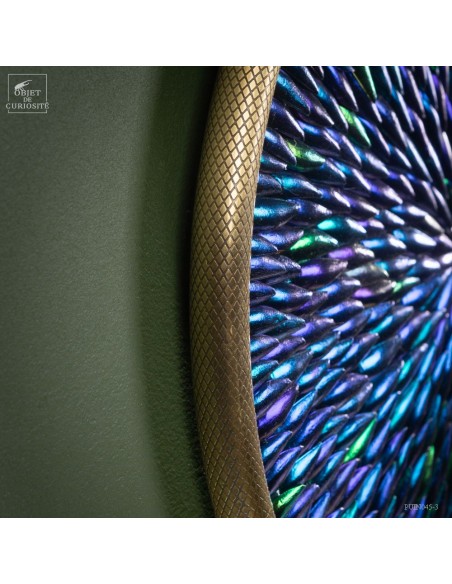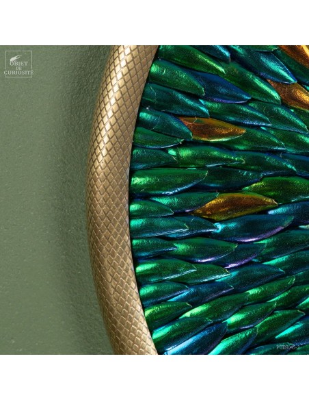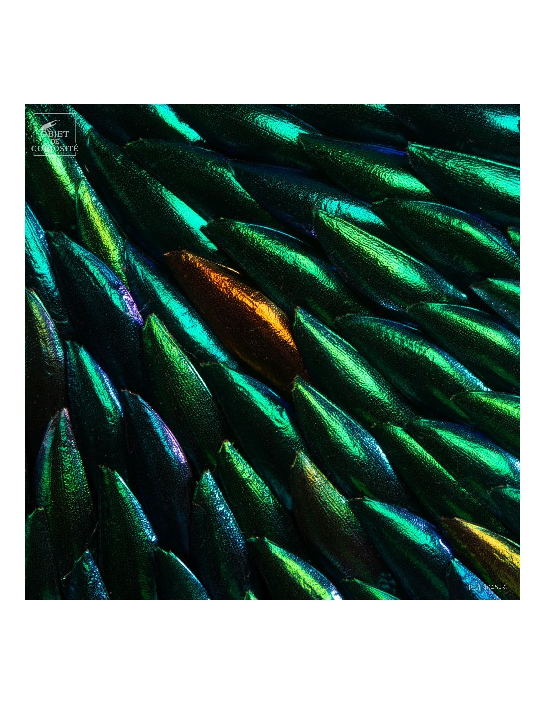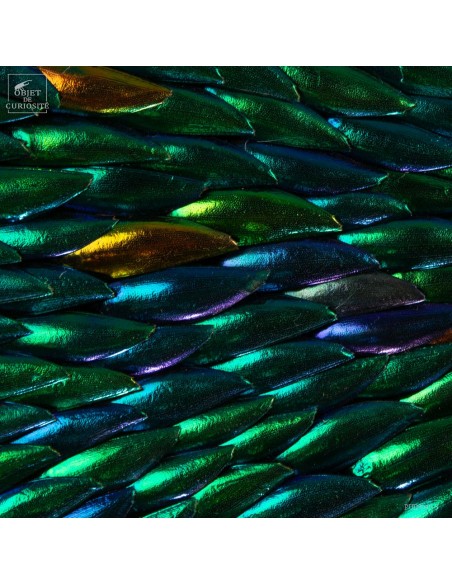 Une curieuse matière faite d'élytres (carapaces) d'insectes-bijoux de Thaïlande - Sternoceras Aequisignata- Le support en laiton satiné fait ressortir les incroyables couleurs iridescentes allant du bleu au vert de ces scarabées de la famille des Buprestes. Ils passent leur vie larvaire ( 2 ans) dans les troncs d'arbre, et leur vie d'adultes est courte (3 semaines). Ils sont donc concentrés sur une reproduction rapide. C'est pourquoi les prélèvements des collectionneurs n'ont pas d'impact significatif, pour l'instant. Le cadre en laiton gravé d'un motif de peau de lézard rajoute à l'élégance de cet objet.