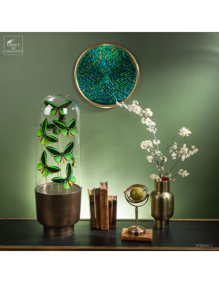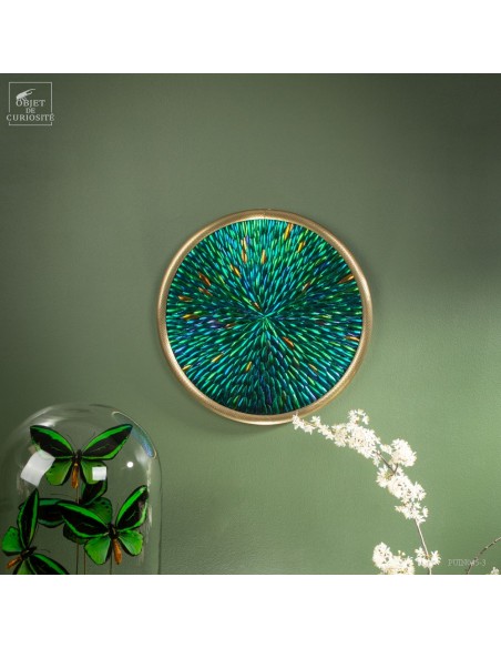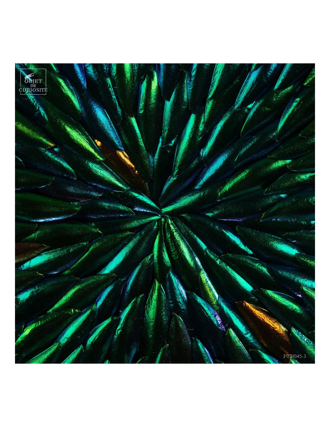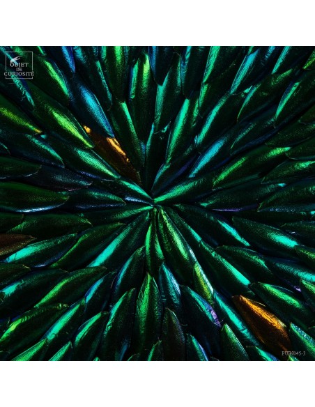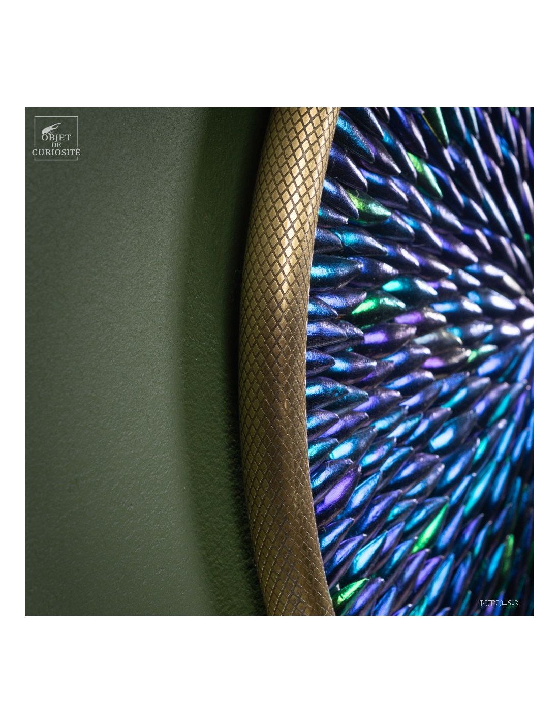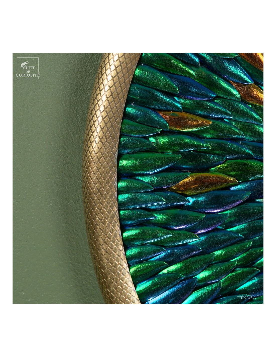 Une curieuse matière faite d'élytres (carapaces) d'insectes-bijoux de Thaïlande - Sternoceras Aequisignata- Le support en laiton satiné fait ressortir les incroyables couleurs iridescentes allant du bleu au vert de ces scarabées de la famille des Buprestes. Ils passent leur vie larvaire ( 2 ans) dans les troncs d'arbre, et leur vie d'adultes est courte (3 semaines). Ils sont donc concentrés sur une reproduction rapide. C'est pourquoi les prélèvements des collectionneurs n'ont pas d'impact significatif, pour l'instant. Le cadre en laiton gravé d'un motif de peau de lézard rajoute à l'élégance de cet objet.