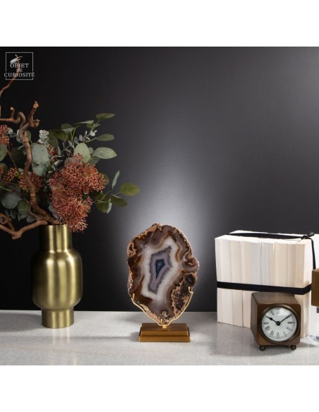 Cette Agate du Brésil est naturelle. L'eau qui s'est infiltrée pendant des milliers d'années dans cette ancienne géode était plus ou moins chargée en manganèse et fer. C'est ce qui a donné ces tons foncés, variant selon les saisons et les années. Taillée en fine tranche, elle devient translucide et laisse passer la lumière.