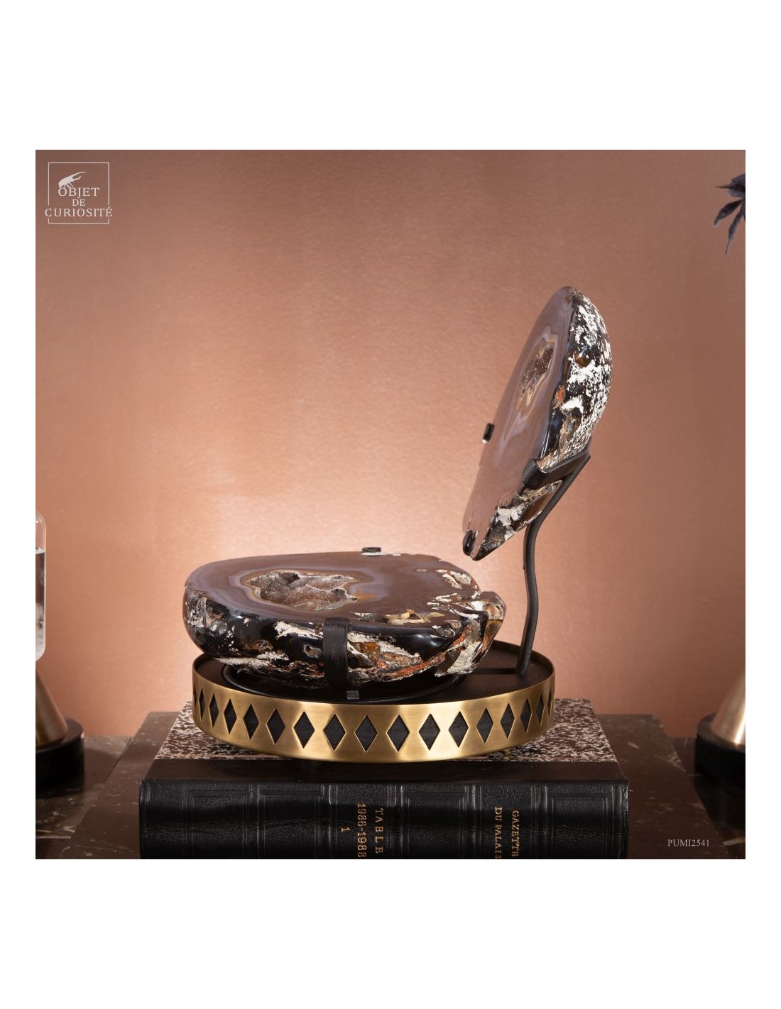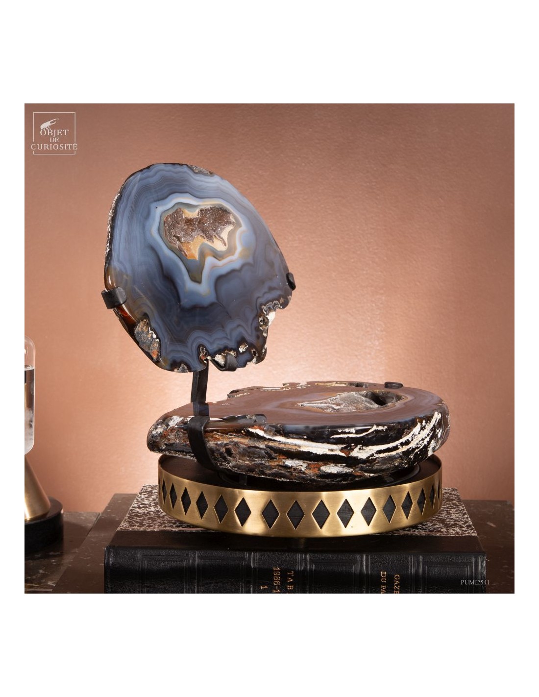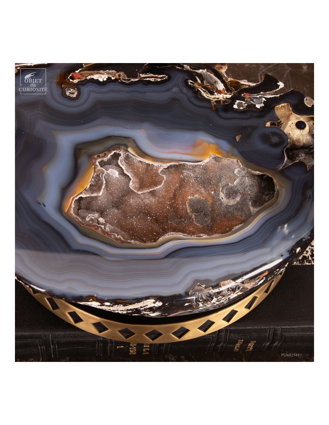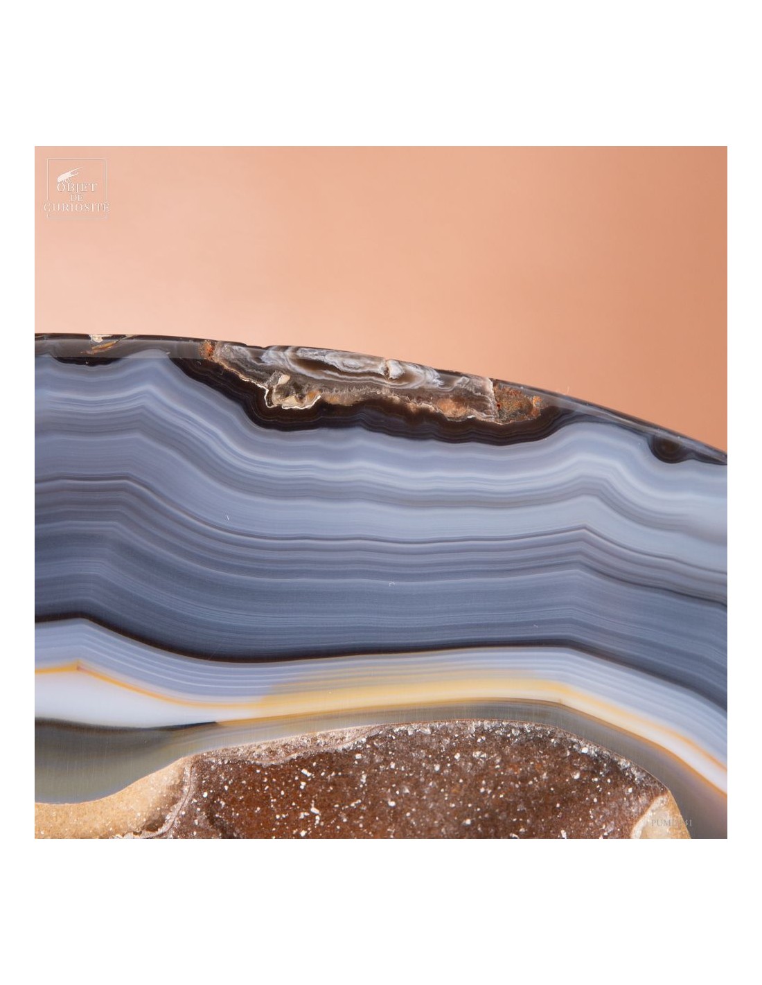 Cette géode d’agate du Brésil avec un couvercle donnant un effet chaudron, est une pièce de collection unique, alliant la beauté naturelle des formations géologiques à une touche d’artisanat et de symbolisme.