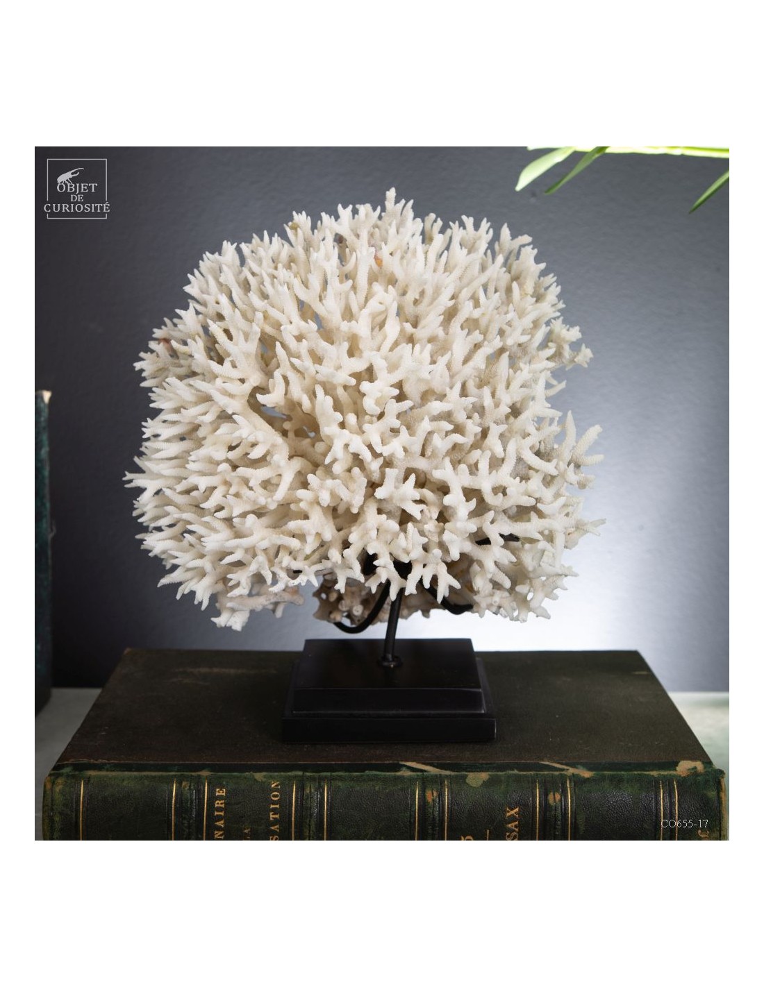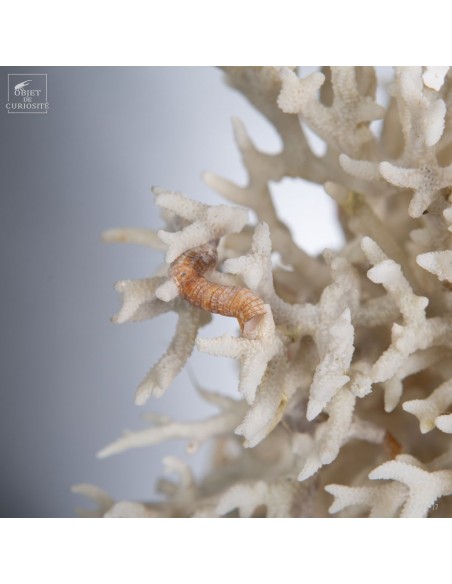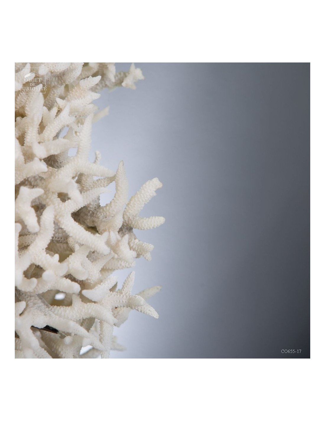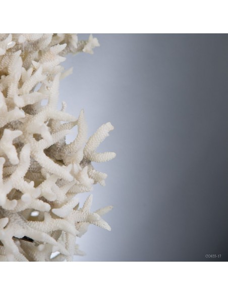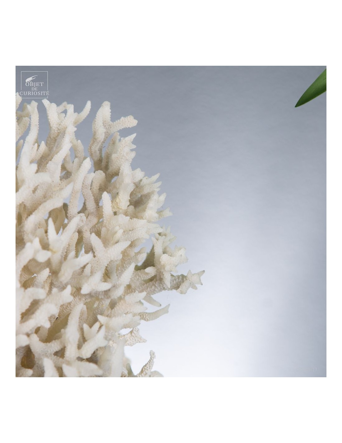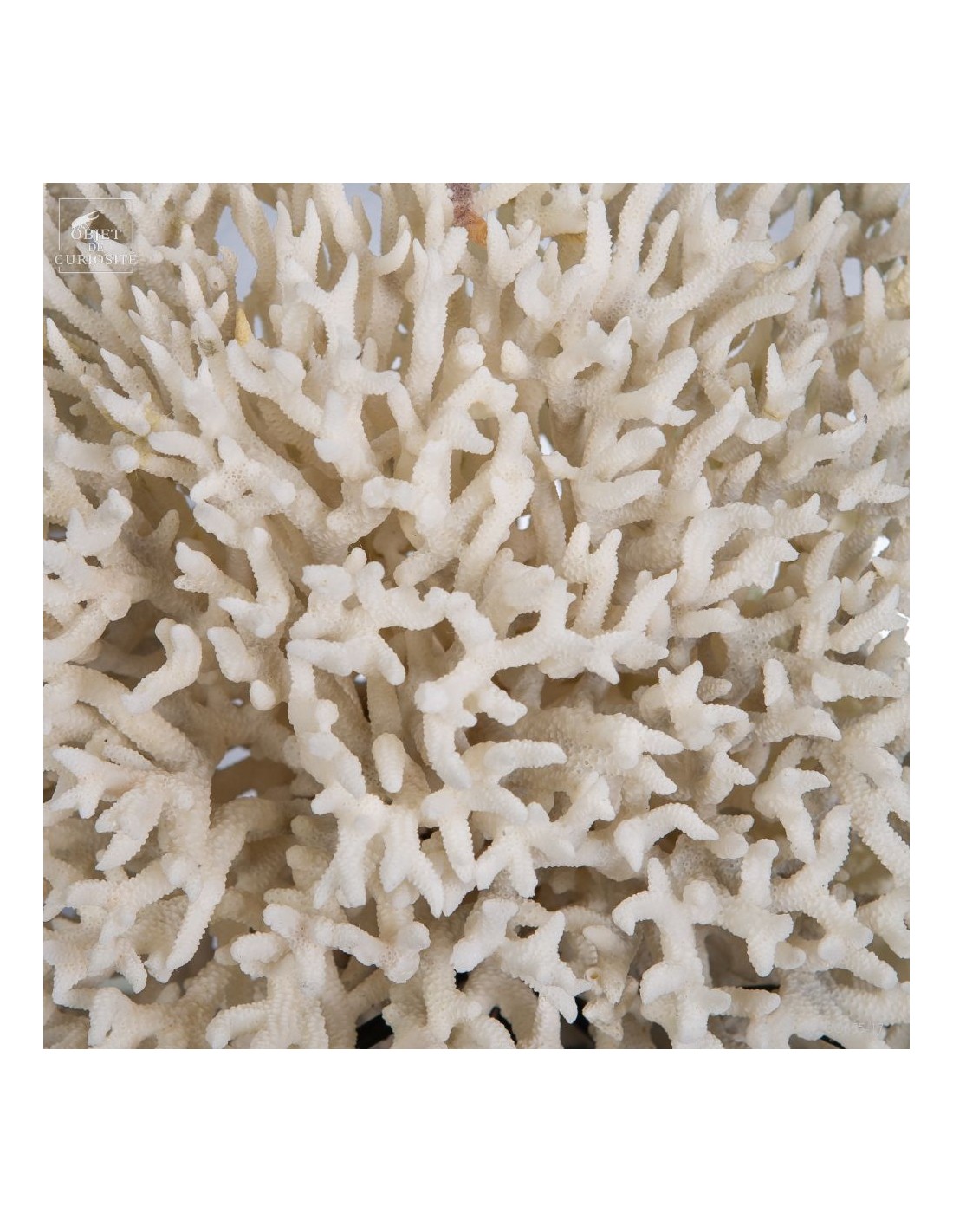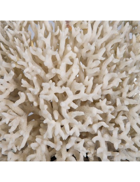 Corail nid blanc sur socle laiton. Composé de centaines de petites branches, ce corail provient des Iles Salomon. son nom scientifique: Seriatopora Hystrix. Sous l'eau, seules les pointes restent blanches, tout le reste est d'un rose fushia (ou jaune pour certaines sous-espèces) Ce corail est livré avec sa propre référence CITES (Convention de Washington sur les espèces à commerce sous surveillance)