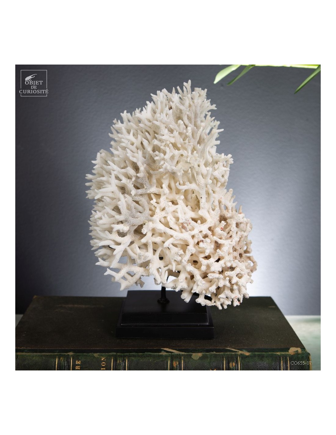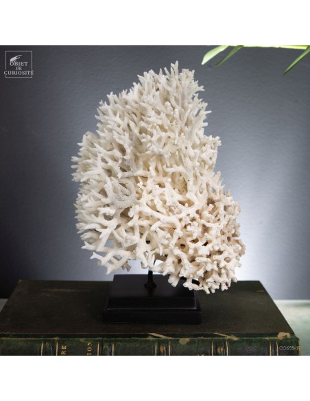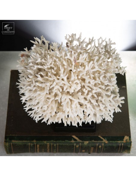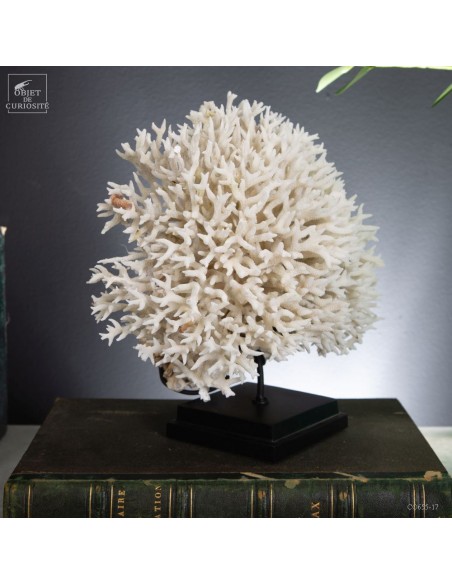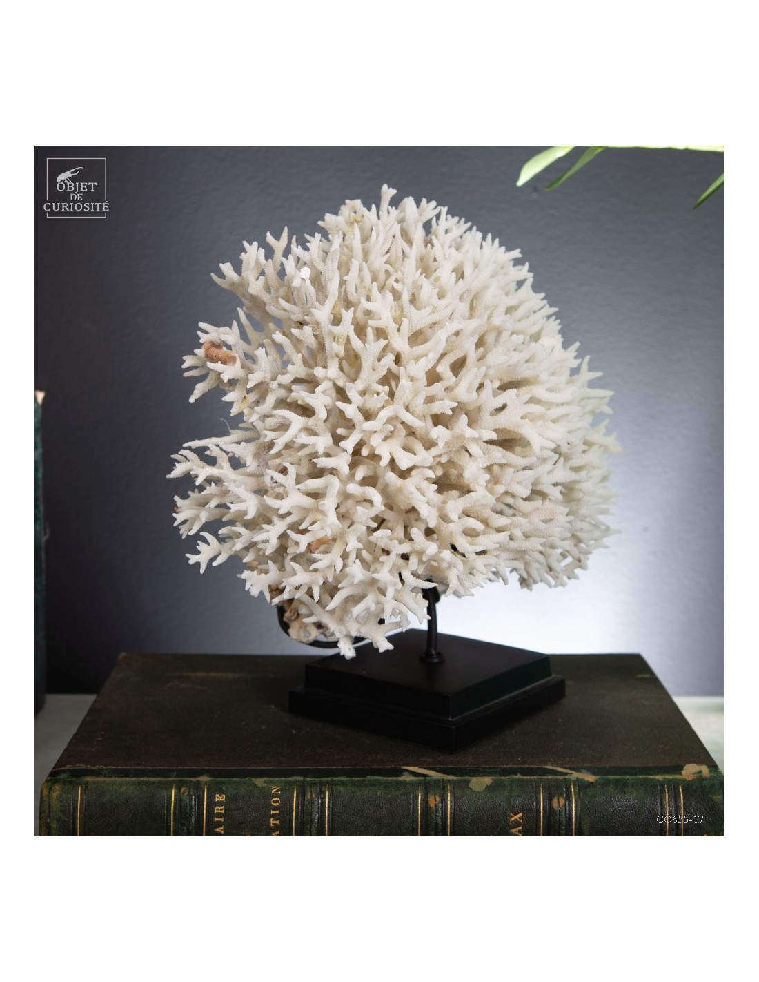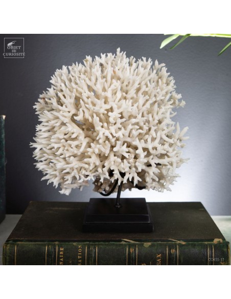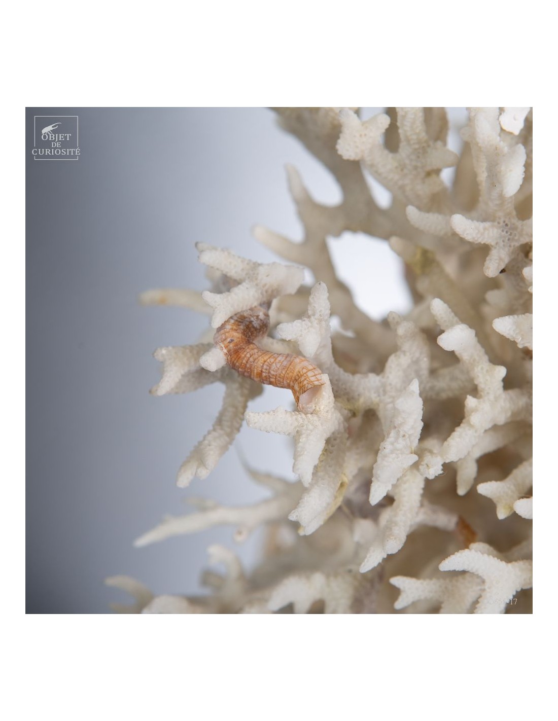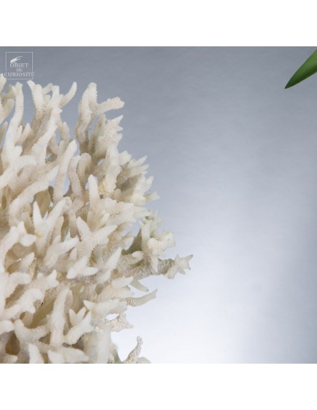 Corail nid blanc sur socle laiton. Composé de centaines de petites branches, ce corail provient des Iles Salomon. son nom scientifique: Seriatopora Hystrix. Sous l'eau, seules les pointes restent blanches, tout le reste est d'un rose fushia (ou jaune pour certaines sous-espèces) Ce corail est livré avec sa propre référence CITES (Convention de Washington sur les espèces à commerce sous surveillance)