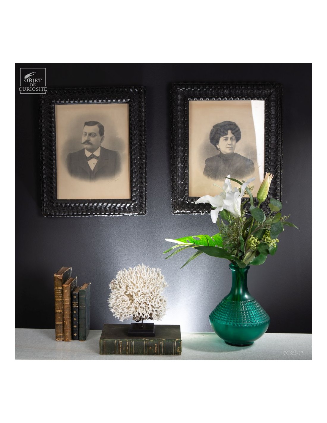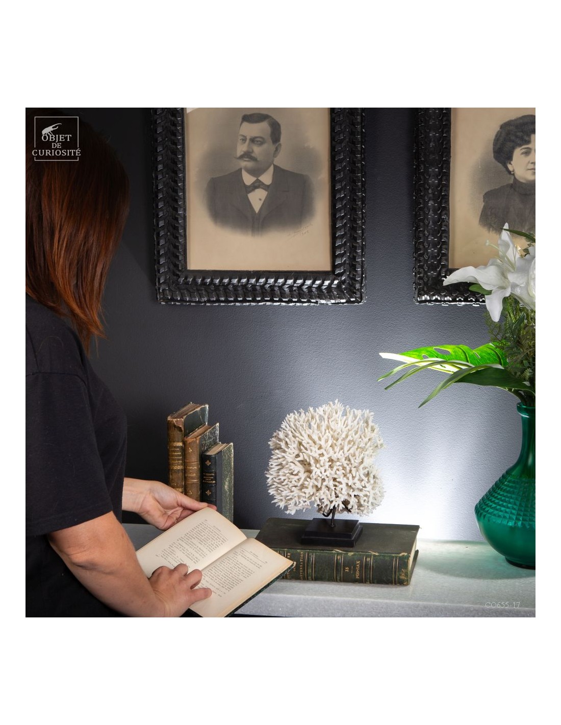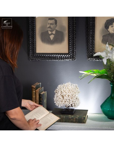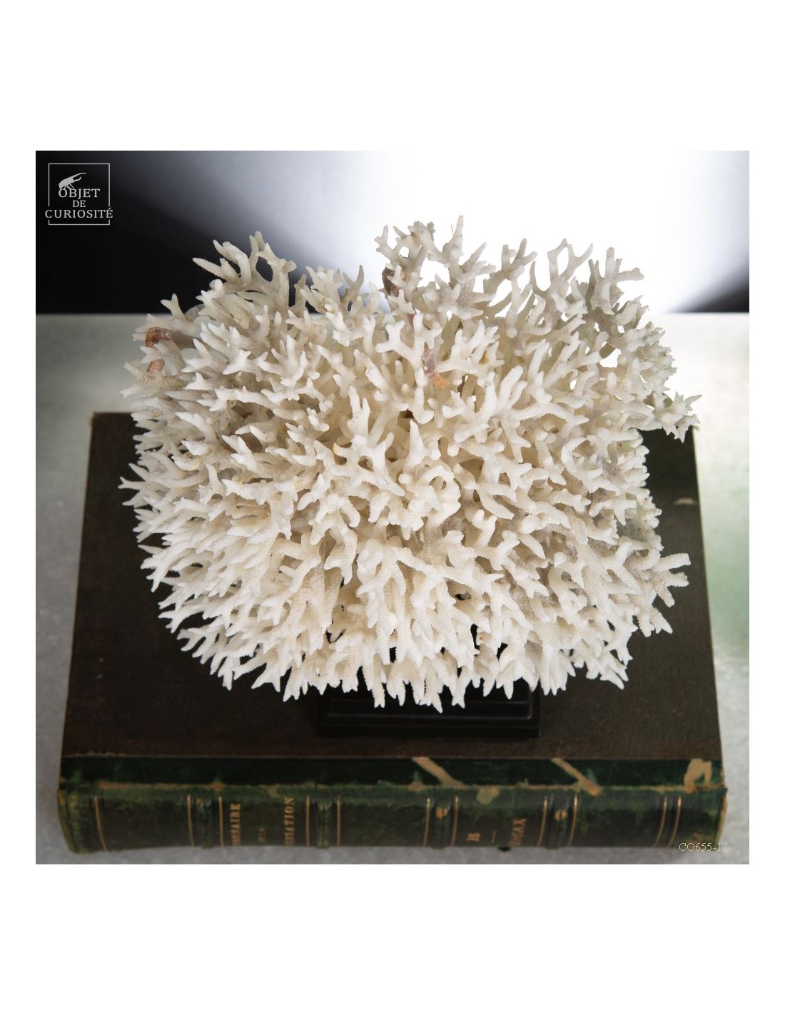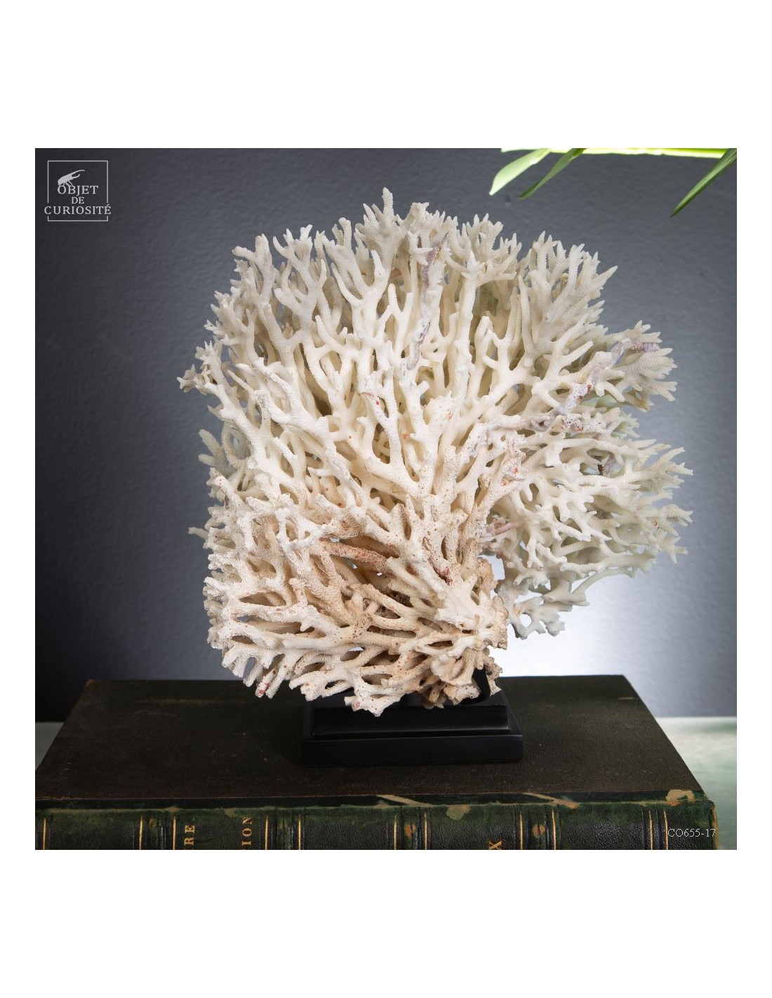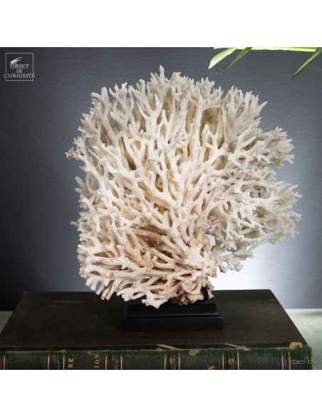 Corail nid blanc sur socle laiton. Composé de centaines de petites branches, ce corail provient des Iles Salomon. son nom scientifique: Seriatopora Hystrix. Sous l'eau, seules les pointes restent blanches, tout le reste est d'un rose fushia (ou jaune pour certaines sous-espèces) Ce corail est livré avec sa propre référence CITES (Convention de Washington sur les espèces à commerce sous surveillance)
