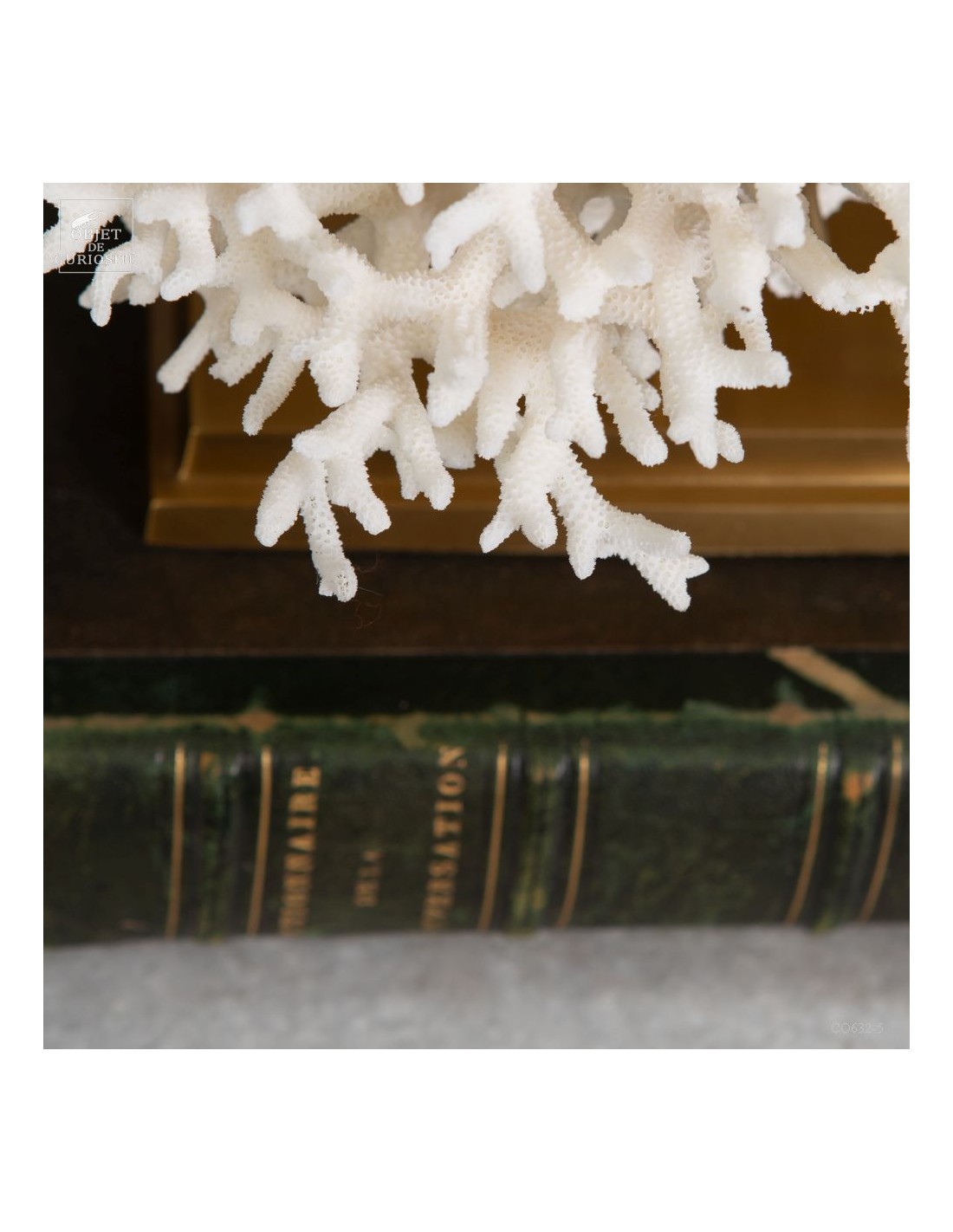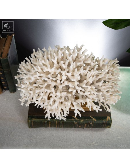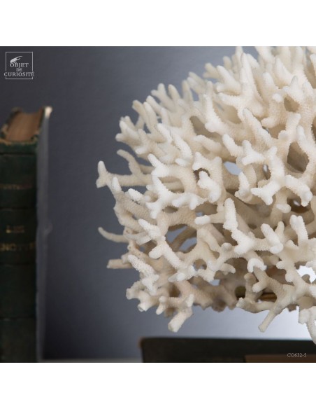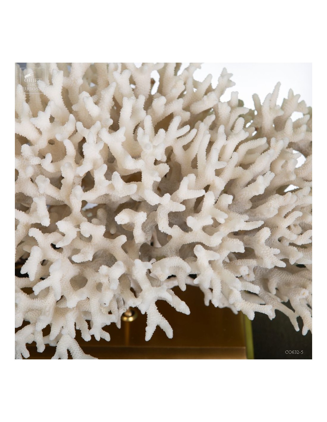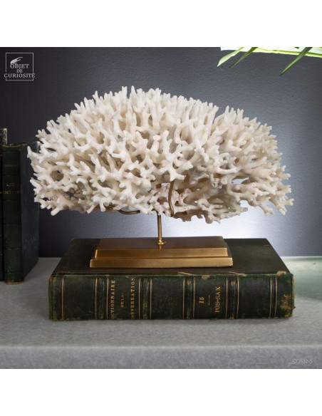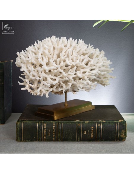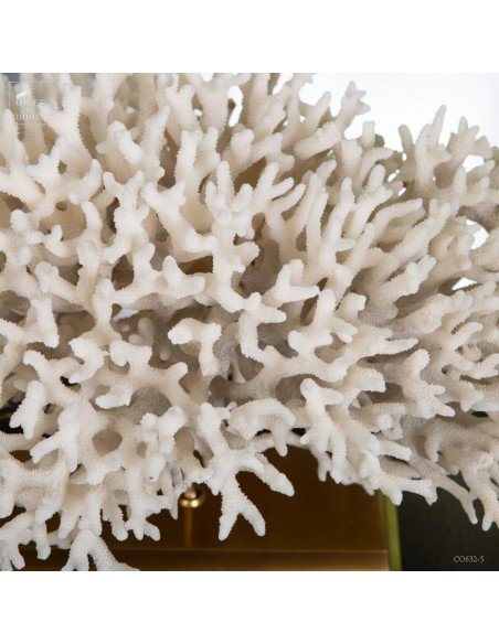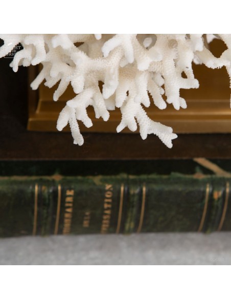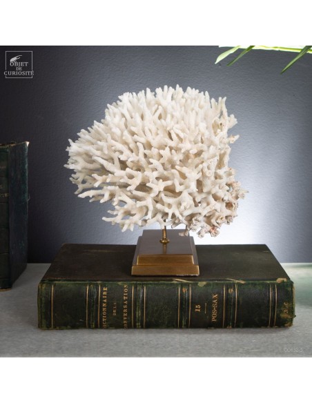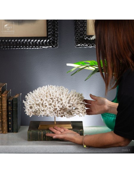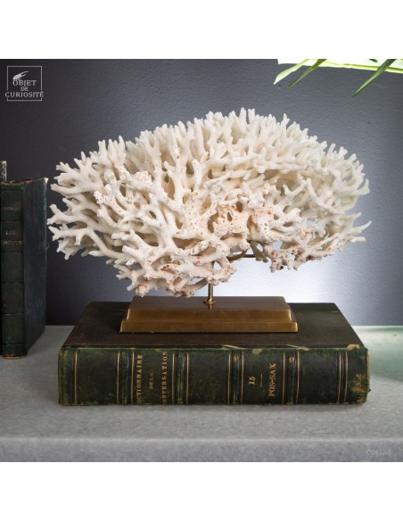 Corail nid blanc sur socle laiton. Composé de centaines de petites branches, ce corail provient des Iles Salomon. son nom scientifique: Seriatopora Hystrix. Sous l'eau, seules les pointes restent blanches, tout le reste est d'un rose fushia (ou jaune pour certaines sous-espèces) Ce corail est livré avec sa propre référence CITES (Convention de Washington sur les espèces à commerce sous surveillance)