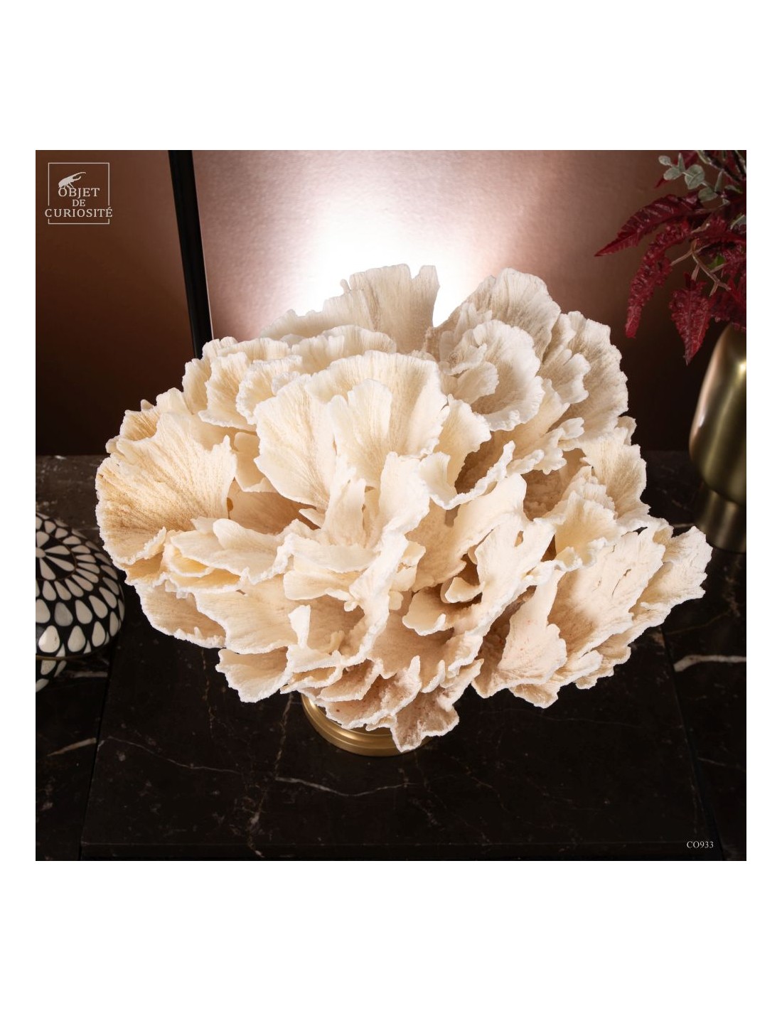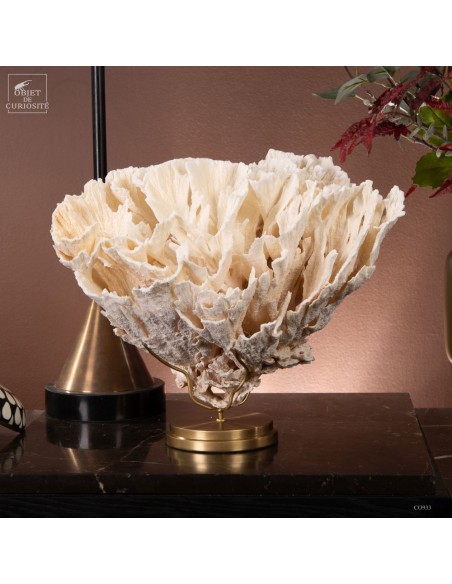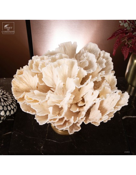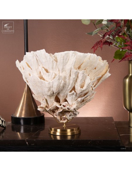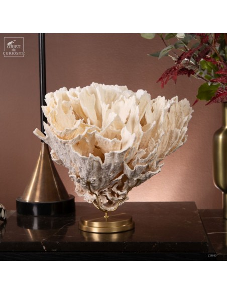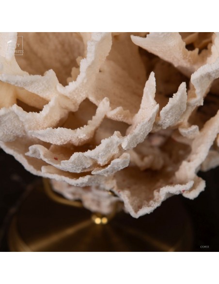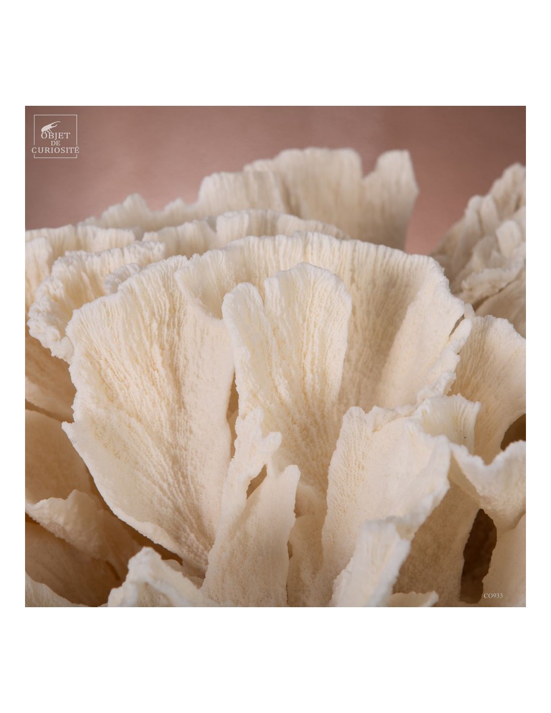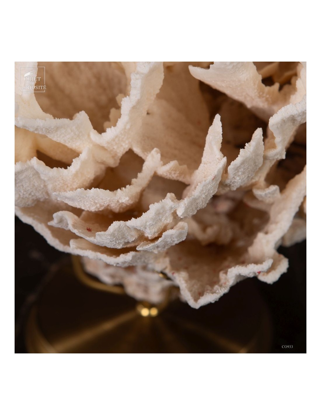 Le Montipora est un genre de corail de la famille des Acroporidae, reconnu pour ses formes variées, allant de plaques plates à des structures encroûtantes ou branchues. Ce corail spécifique présente une morphologie en forme de fleur, caractéristique de certaines espèces de Montipora, avec des “pétales” fins et délicats qui se déploient en colonnes radiales. Il a grandi dans les récifs coralliens du Pacifique, où les eaux relativement calmes favorisent son développement, notamment à l’abri des fortes vagues. La coloration rose vif le long des bordures est due à la présence de pigments fluorescents qui captent la lumière ultraviolette.