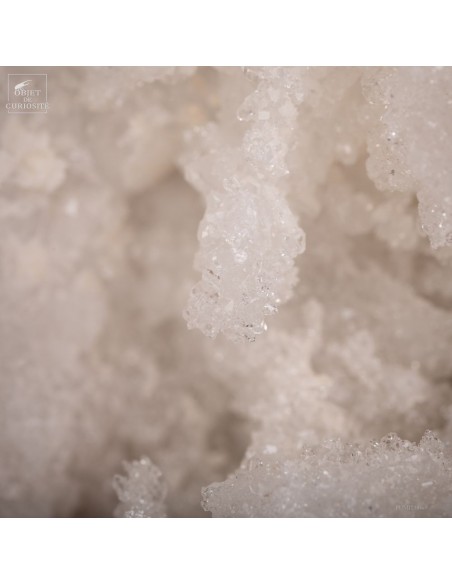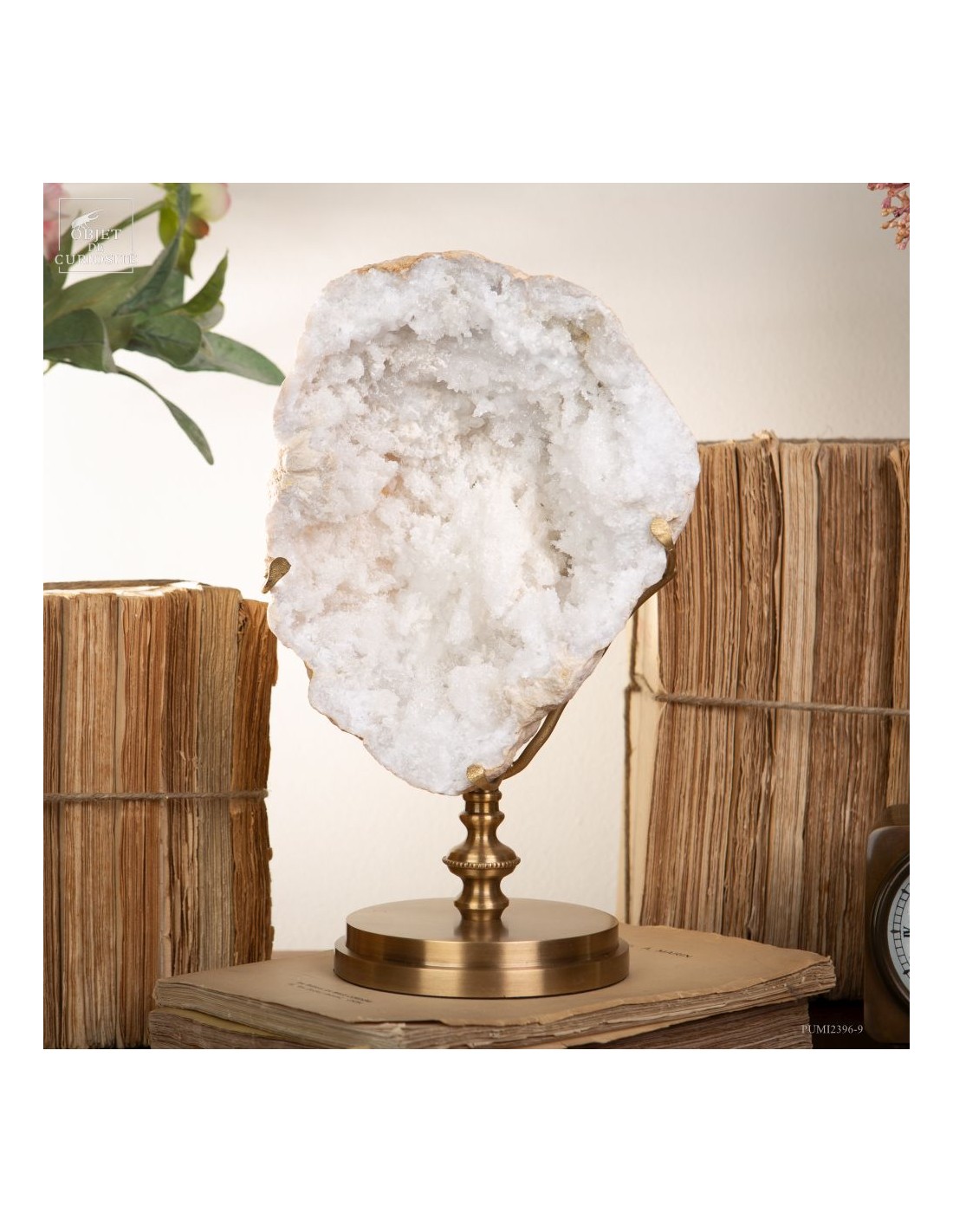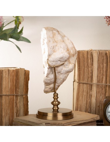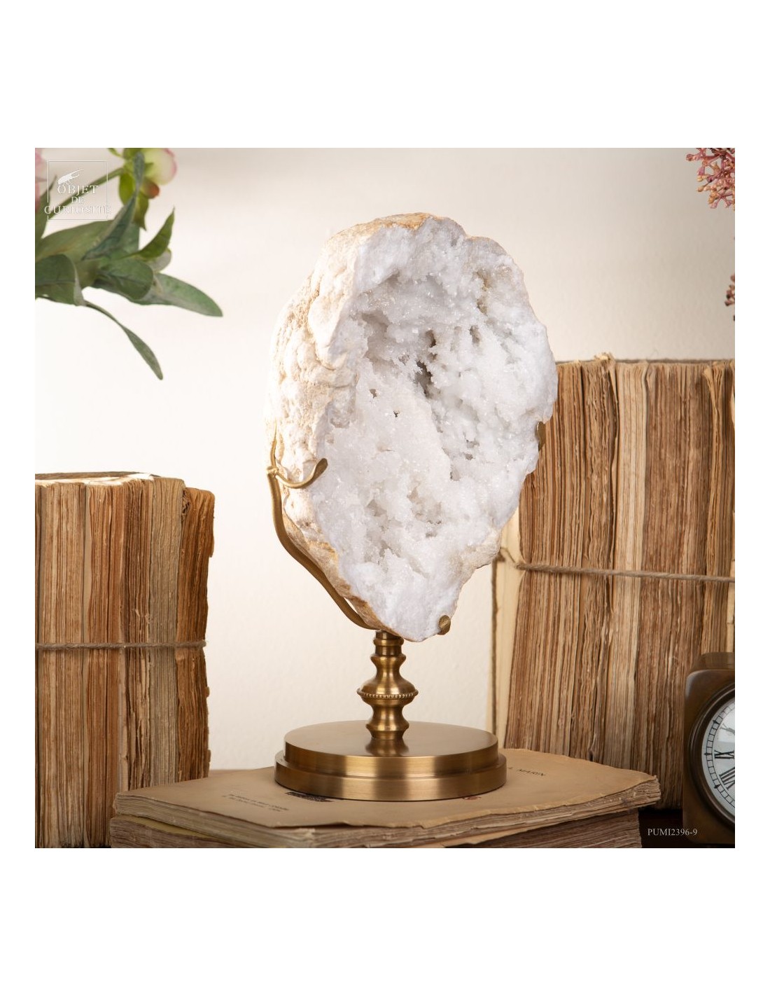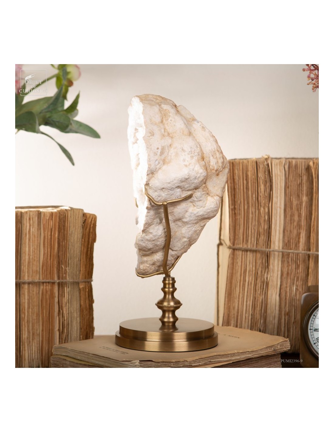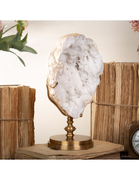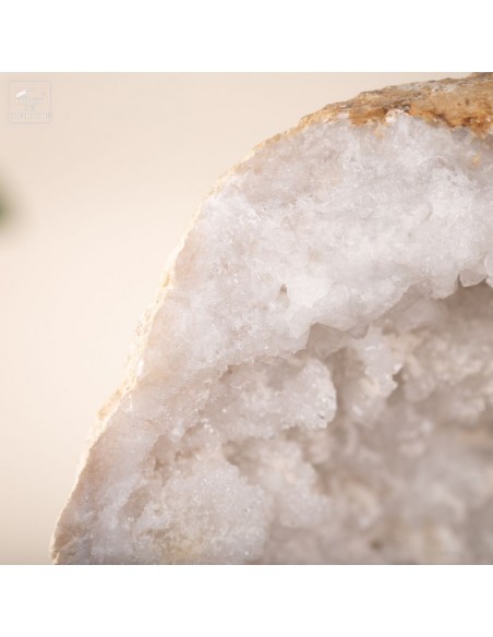 Ce minéral est une géode de Quartz blanc de l'extrême sud Marocain - près de Laâyoune - et qui a l'air d'une simple boule de pierre naturelle. L'intérieur est une vraie cavité de cristaux naturels. Un contraste saisissant avec l'extérieur très simple de ce minéral.