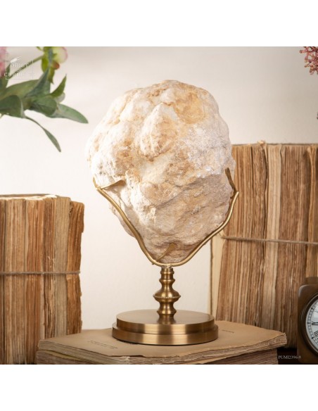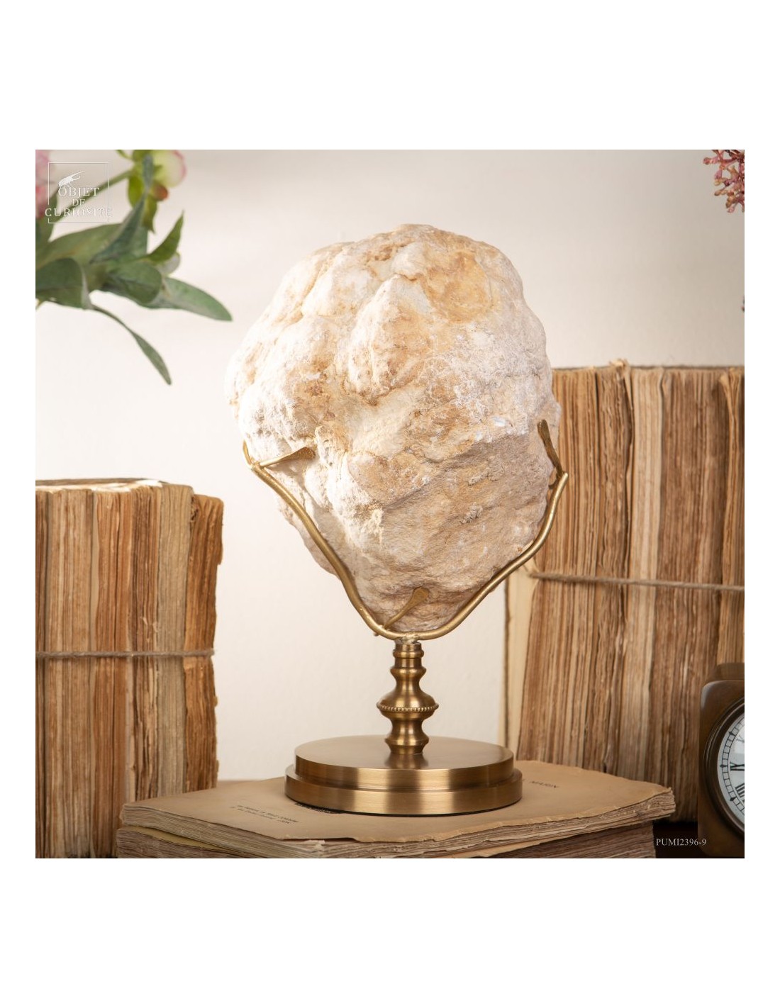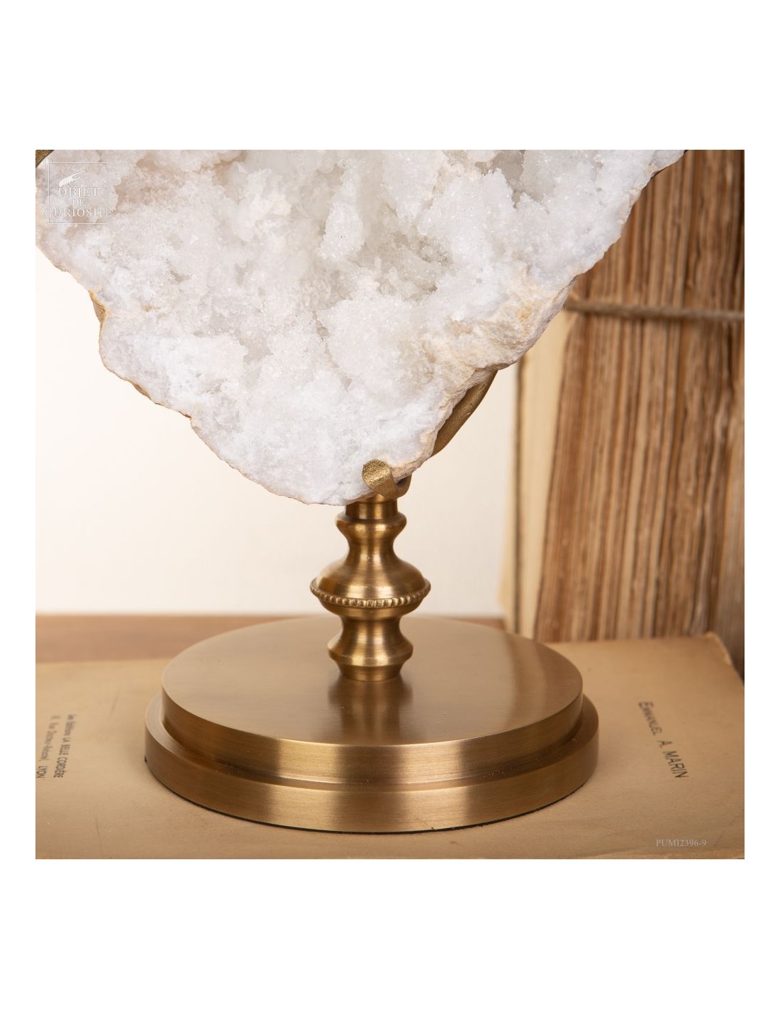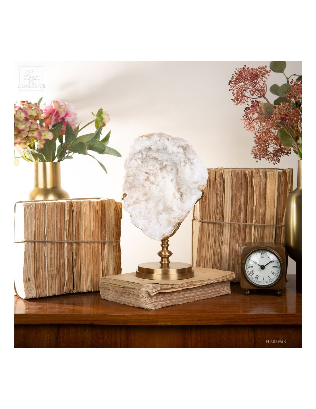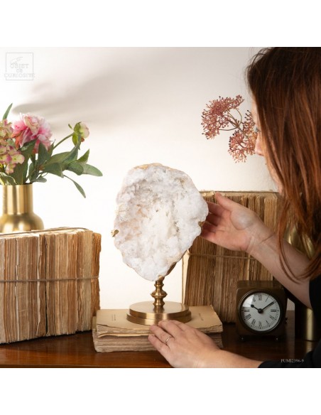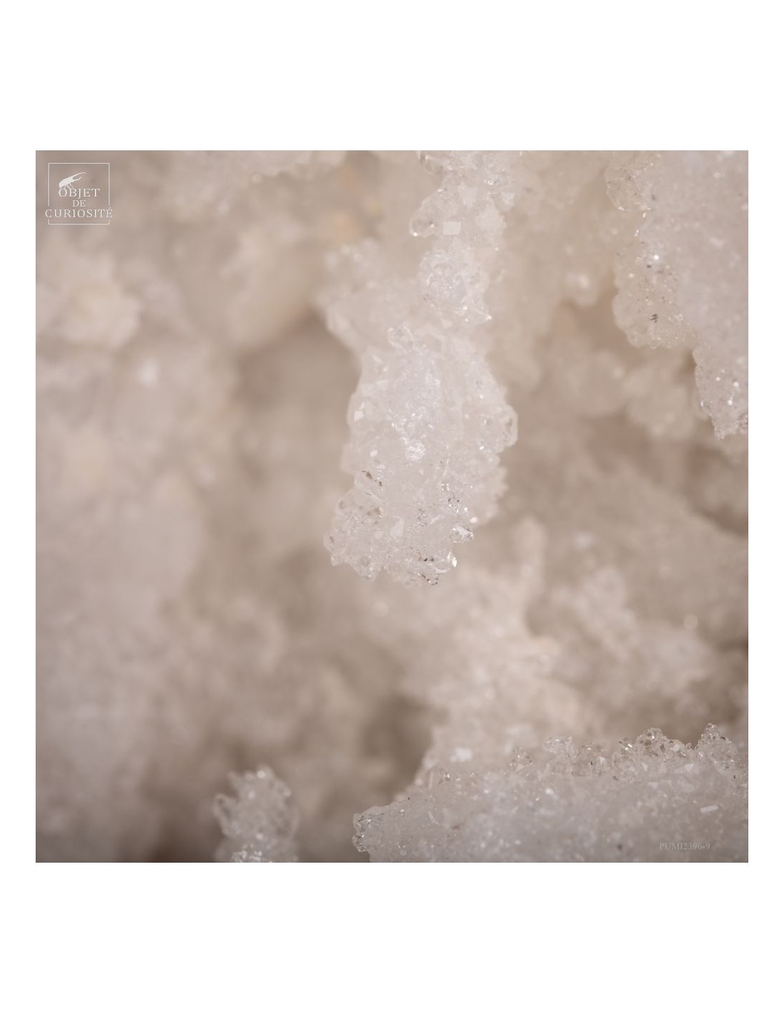 Ce minéral est une géode de Quartz blanc de l'extrême sud Marocain - près de Laâyoune - et qui a l'air d'une simple boule de pierre naturelle. L'intérieur est une vraie cavité de cristaux naturels. Un contraste saisissant avec l'extérieur très simple de ce minéral.