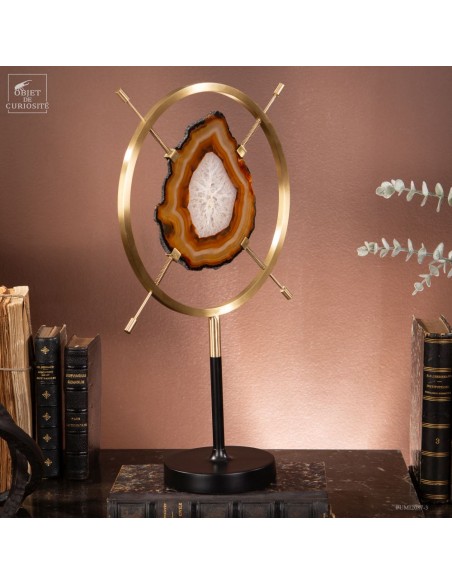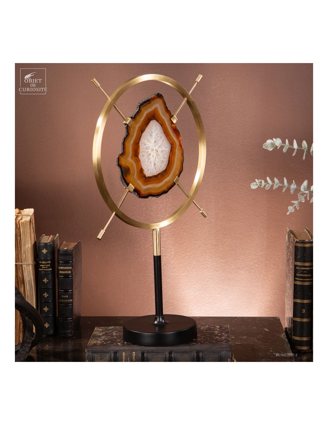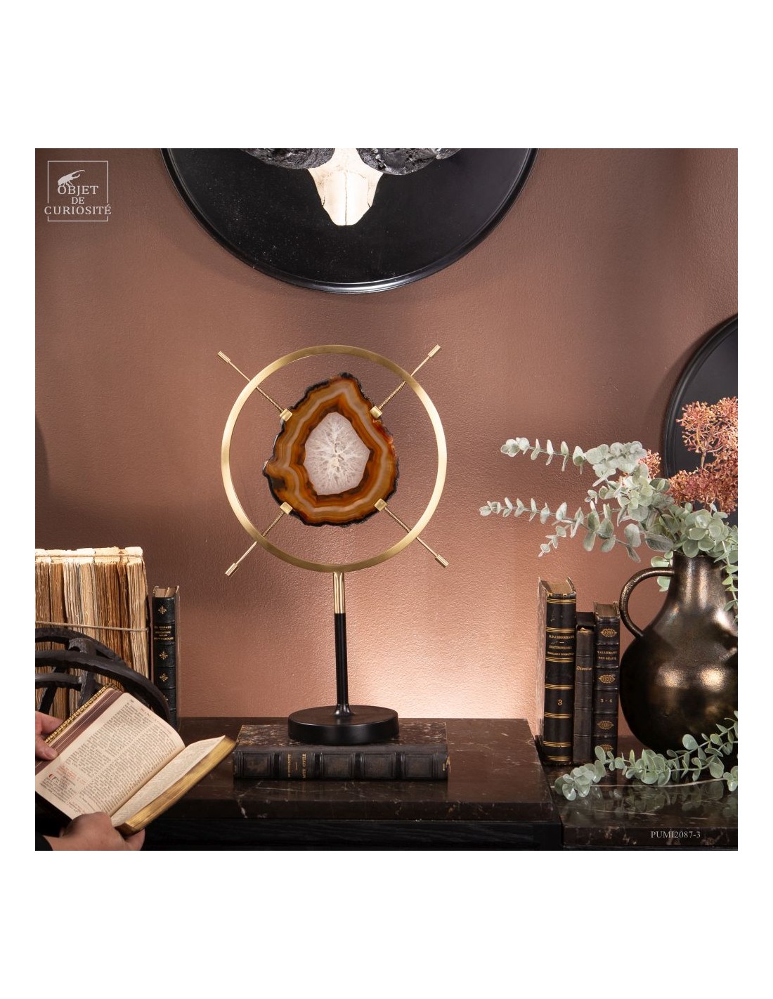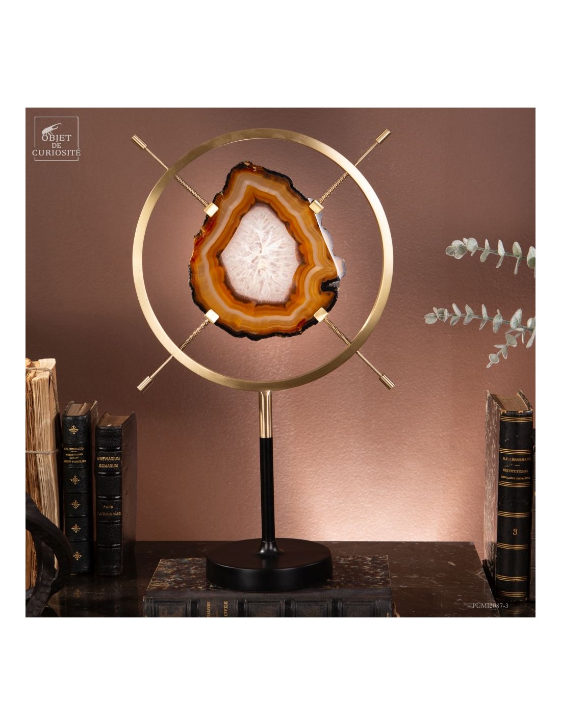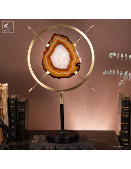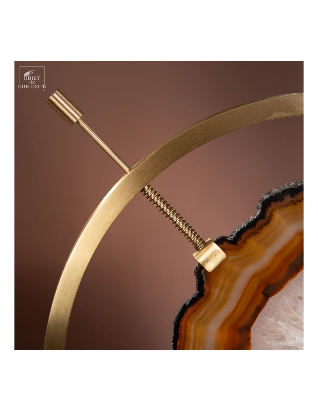 Tranche d'Agate naturelle du Brésil, sur un élégant présentoir noir et laiton satiné. Et avant d'être cette pierre, c'était une bulle d'air dans la lave refroidie d'un volcan. La lave est devenue du basalte: une roche poreuse, et cette chambre a été successivement remplie, sur des millénaires, par de l'eau avec des minéraux dissous. Comme de l'oxyde de Manganèse qui a donné ces lignes noires tout autour. Chaque inondation a apporté une couche de densité et couleur différente...