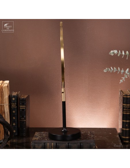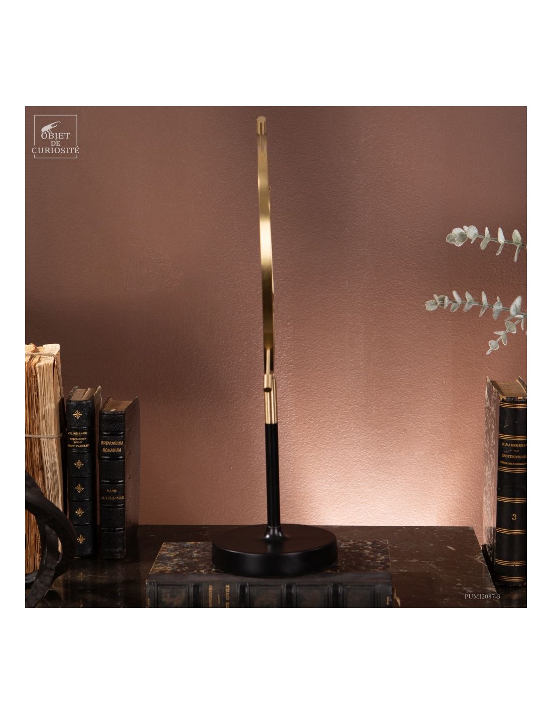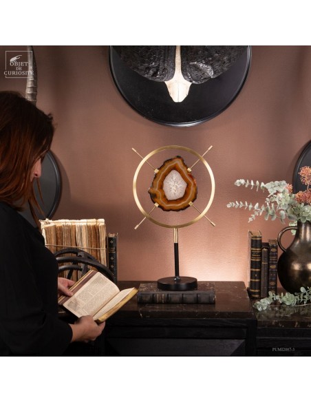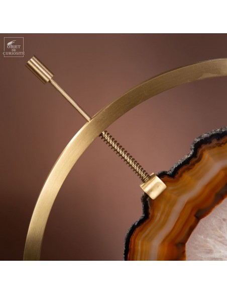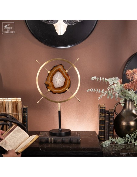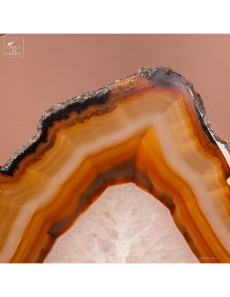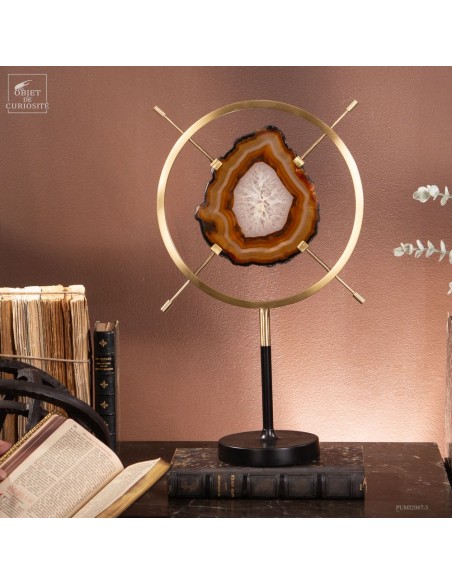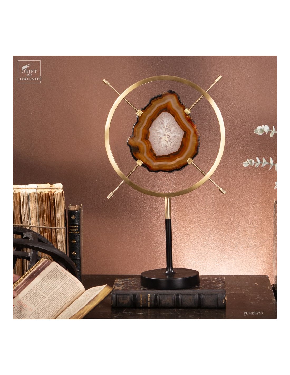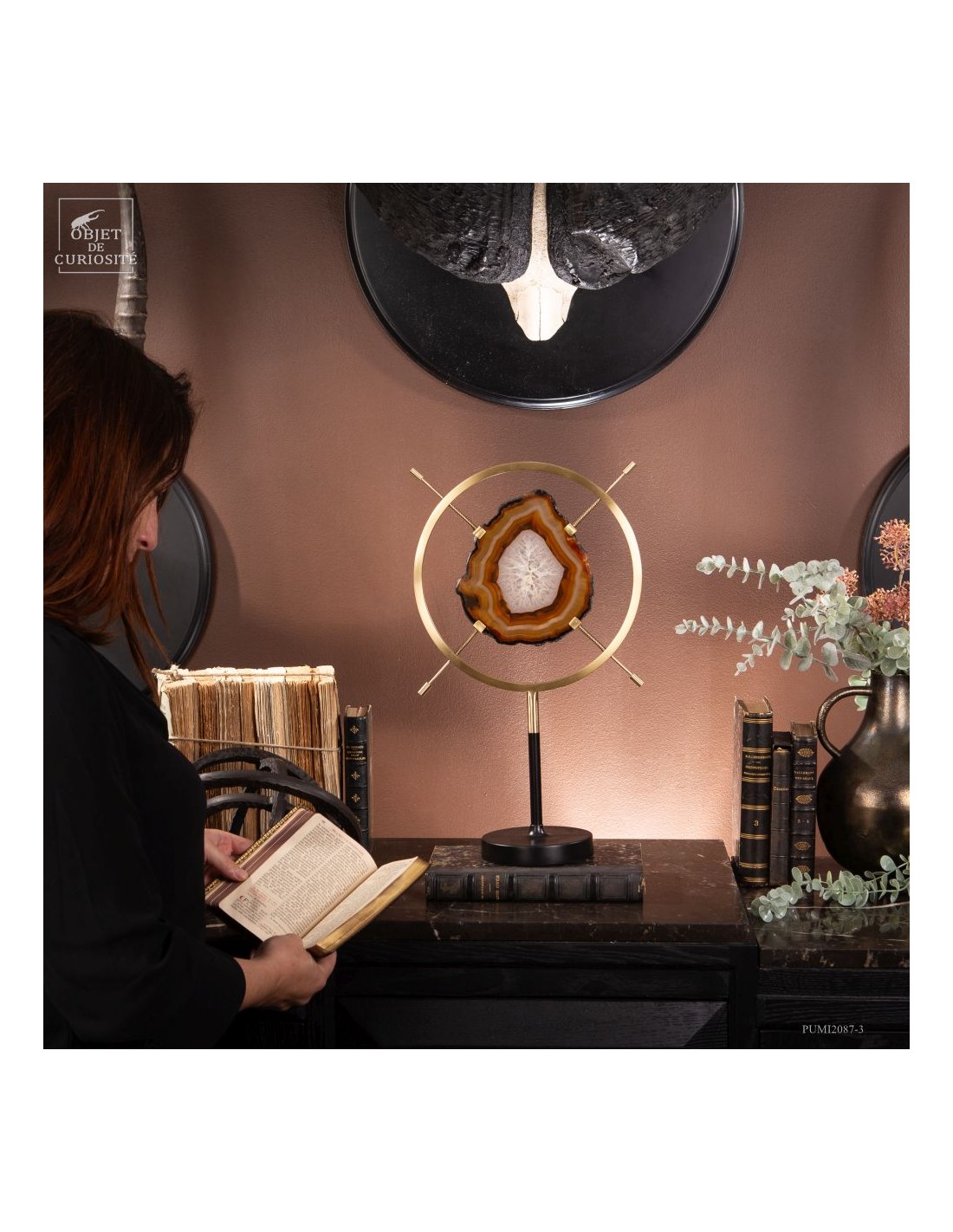 Tranche d'Agate naturelle du Brésil, sur un élégant présentoir noir et laiton satiné. Et avant d'être cette pierre, c'était une bulle d'air dans la lave refroidie d'un volcan. La lave est devenue du basalte: une roche poreuse, et cette chambre a été successivement remplie, sur des millénaires, par de l'eau avec des minéraux dissous. Comme de l'oxyde de Manganèse qui a donné ces lignes noires tout autour. Chaque inondation a apporté une couche de densité et couleur différente...