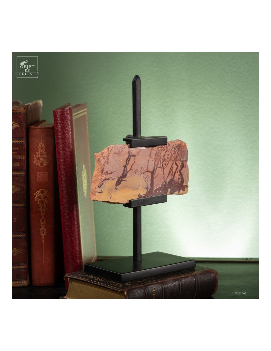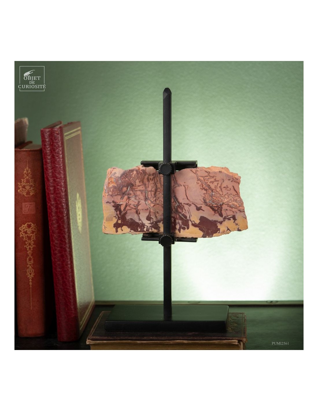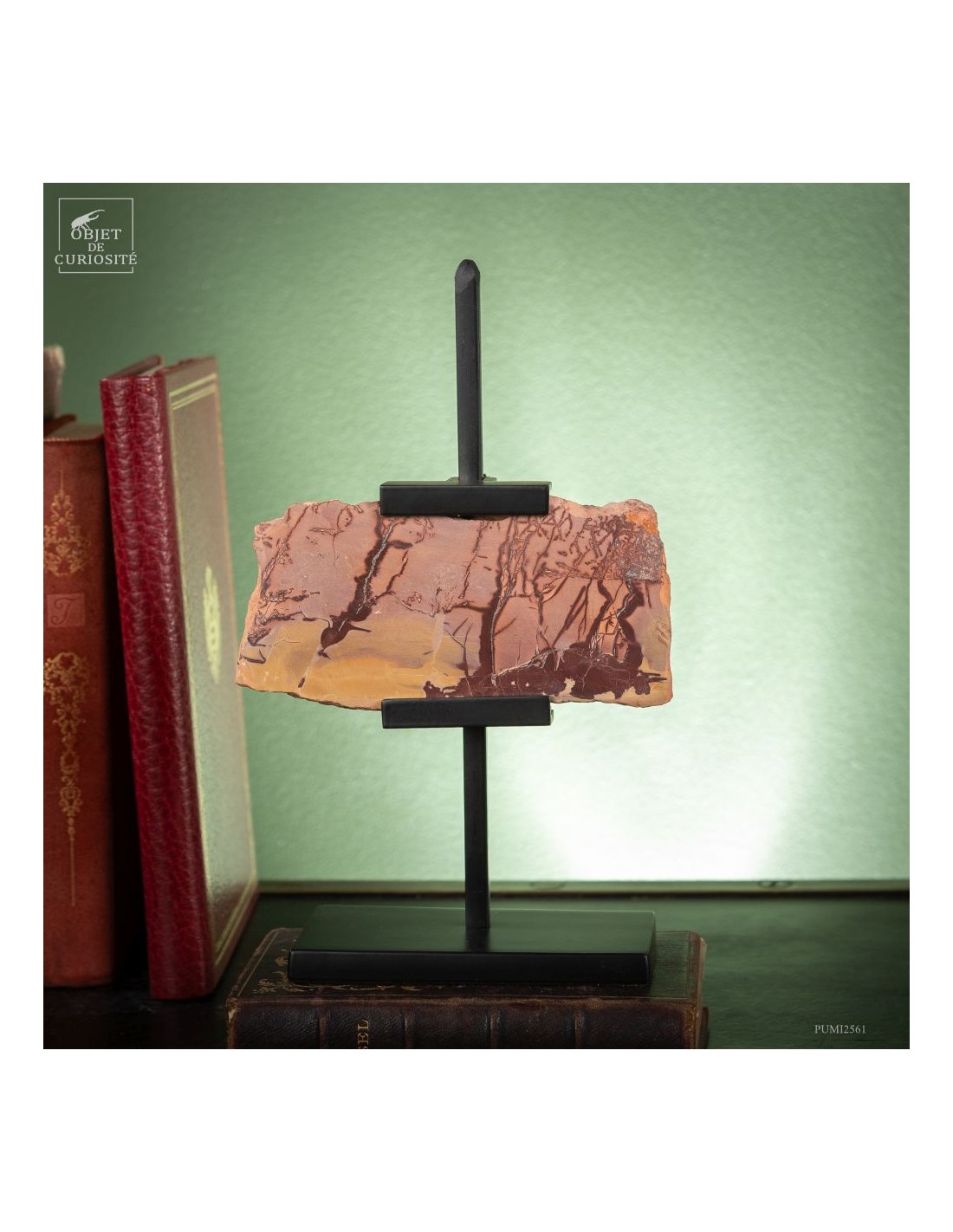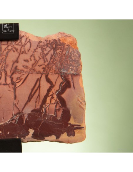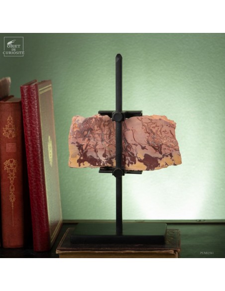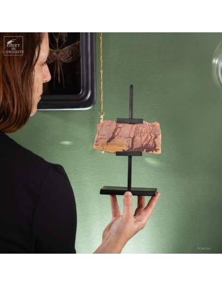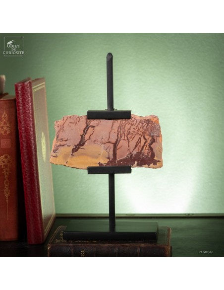 Cette pierre paysage, originaire du Sud du Maroc près des montagnes de l’Anti-Atlas, est parfois appelée « mokaïte » en raison de ses couleurs, bien qu’elle soit distincte de la vraie mokaïte Australienne. Ses motifs naturels, formés par des processus géologiques, évoquent des paysages abstraits, rappelant la célèbre Paésine de Florence. Ces dessins sont le résultat de processus géologiques complexes, tels que des mouvements tectoniques et l’infiltration de minéraux dans la roche, donnant l’impression d’admirer une scène naturelle figée dans la pierre. Présentée sur un chevalet noir, elle met en valeur ses teintes rouges, brunes et jaunes pour une touche artistique et naturelle.