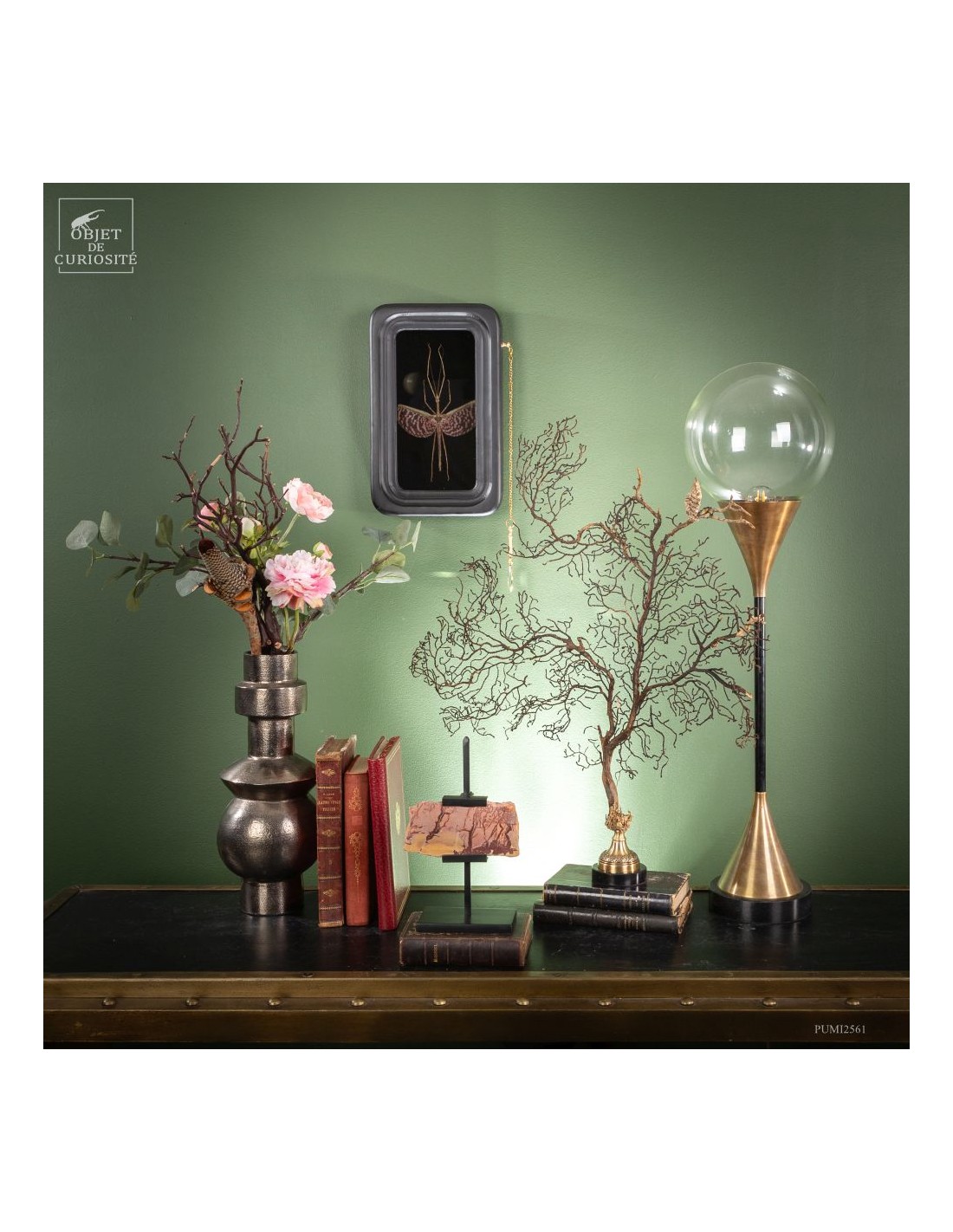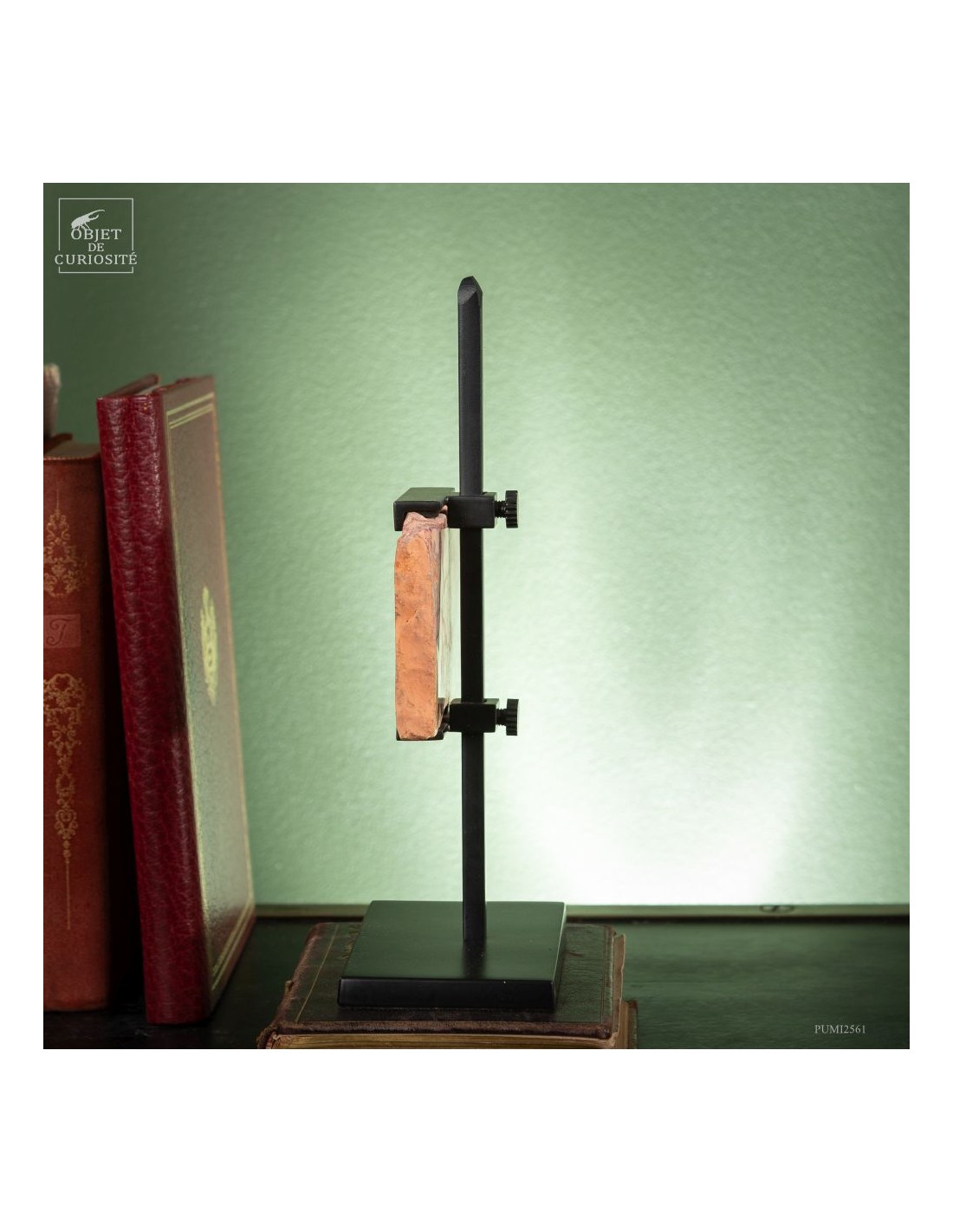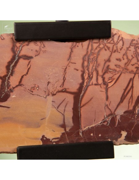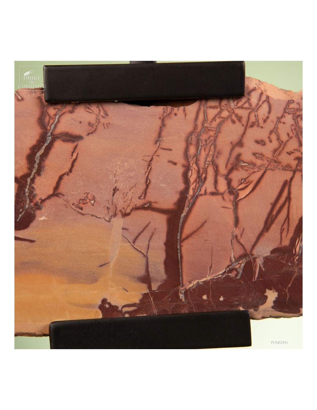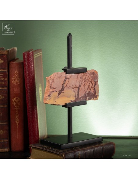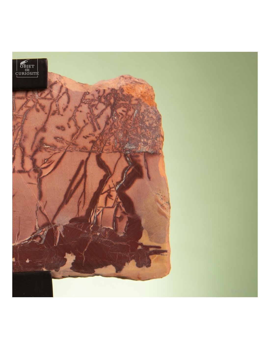 Cette pierre paysage, originaire du Sud du Maroc près des montagnes de l’Anti-Atlas, est parfois appelée « mokaïte » en raison de ses couleurs, bien qu’elle soit distincte de la vraie mokaïte Australienne. Ses motifs naturels, formés par des processus géologiques, évoquent des paysages abstraits, rappelant la célèbre Paésine de Florence. Ces dessins sont le résultat de processus géologiques complexes, tels que des mouvements tectoniques et l’infiltration de minéraux dans la roche, donnant l’impression d’admirer une scène naturelle figée dans la pierre. Présentée sur un chevalet noir, elle met en valeur ses teintes rouges, brunes et jaunes pour une touche artistique et naturelle.