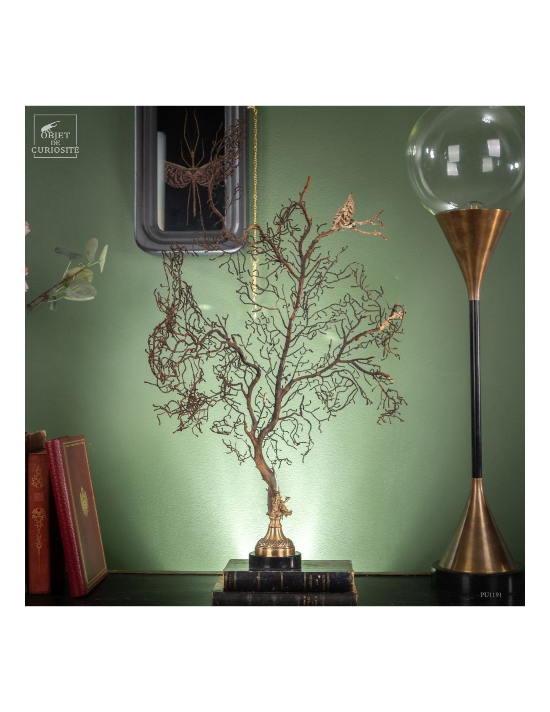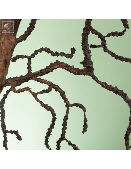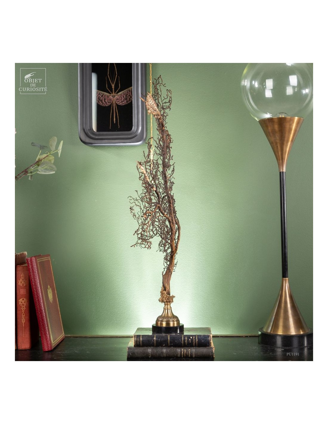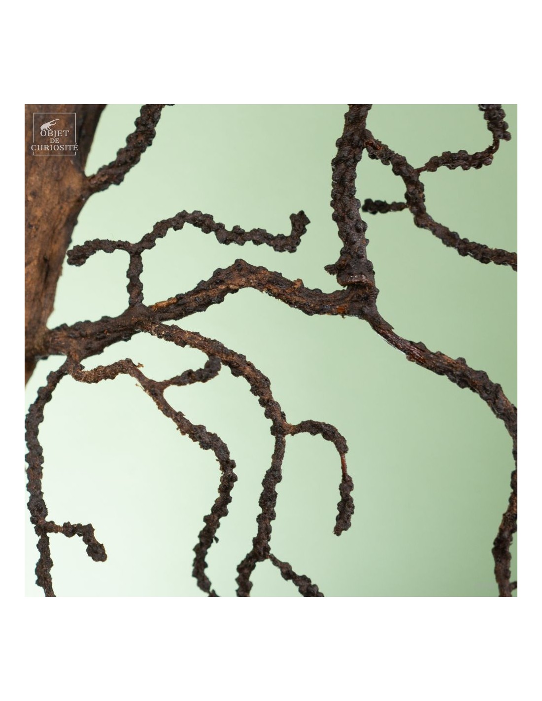 Cette gorgone marron, provenant des eaux de Micronésie, est un spécimen remarquable de polypes coloniaux marins. Chaque polype possède 8 tentacules qui filtrent le plancton dans les courants marins. Contrairement à de nombreuses espèces marines, la gorgone ne pousse pas vers la lumière, mais perpendiculairement aux courants, maximisant ainsi sa capacité à capter les nutriments. Son squelette, composé de gorgonine, est à la fois souple et résistant. Montée sur laiton et marbre, cette pièce met en valeur la beauté brute des récifs coralliens.