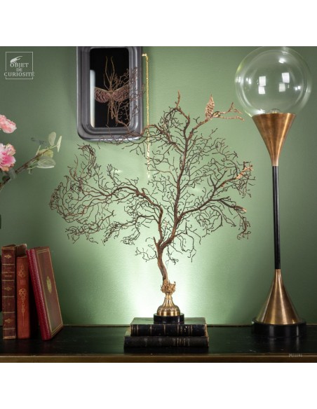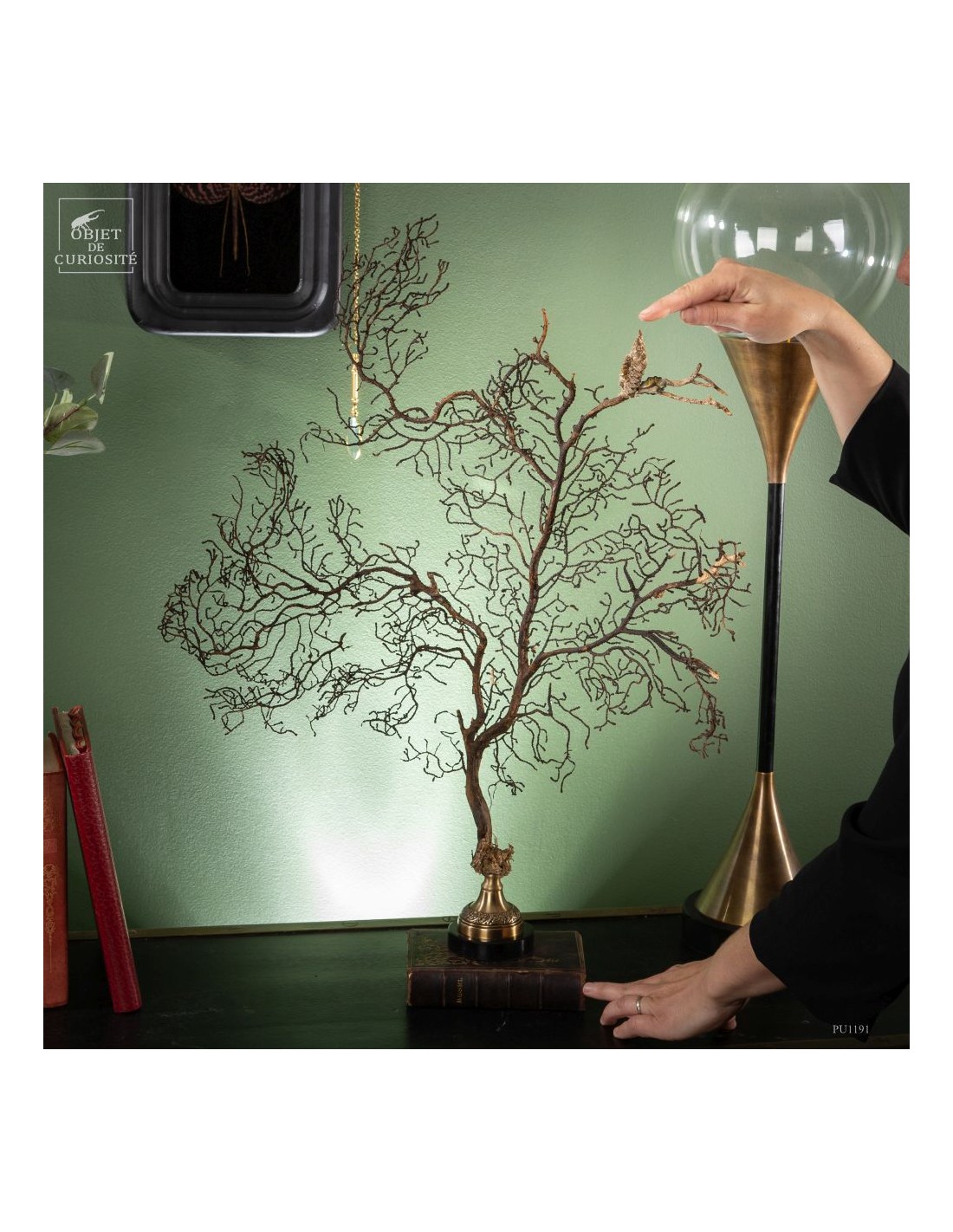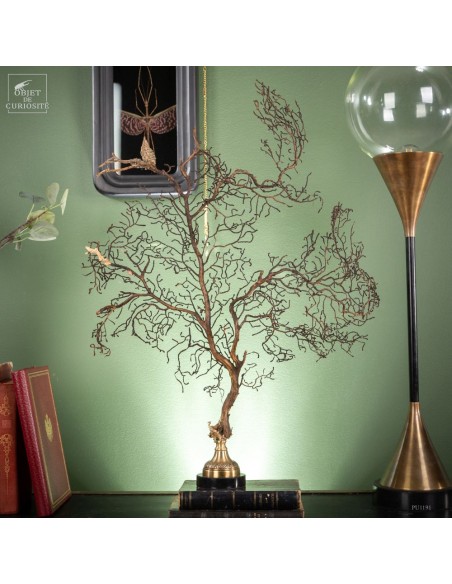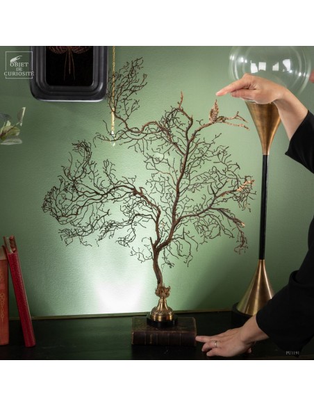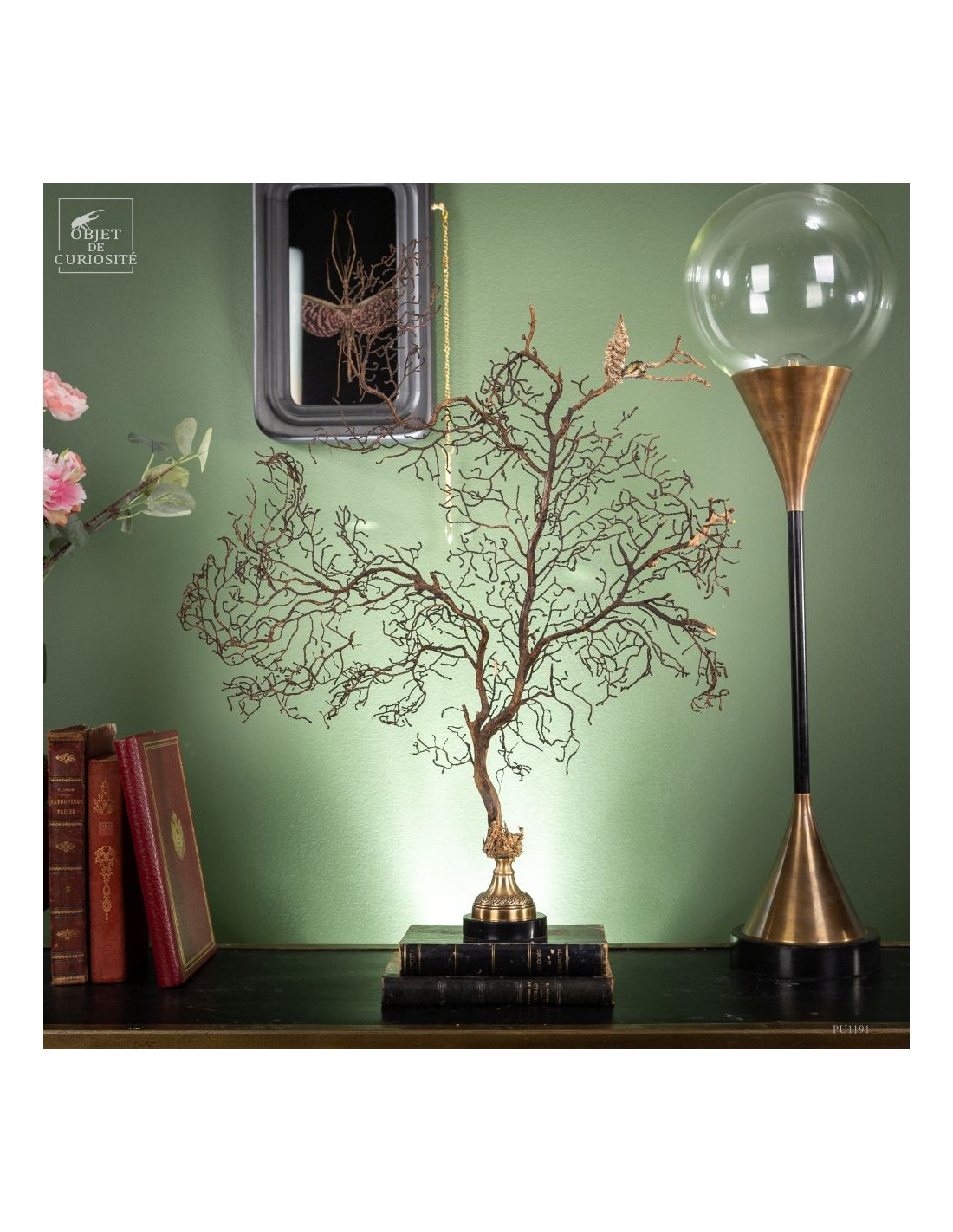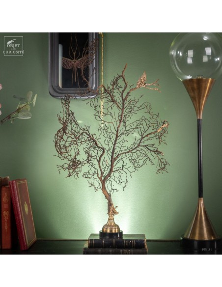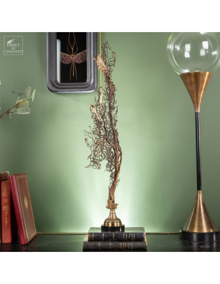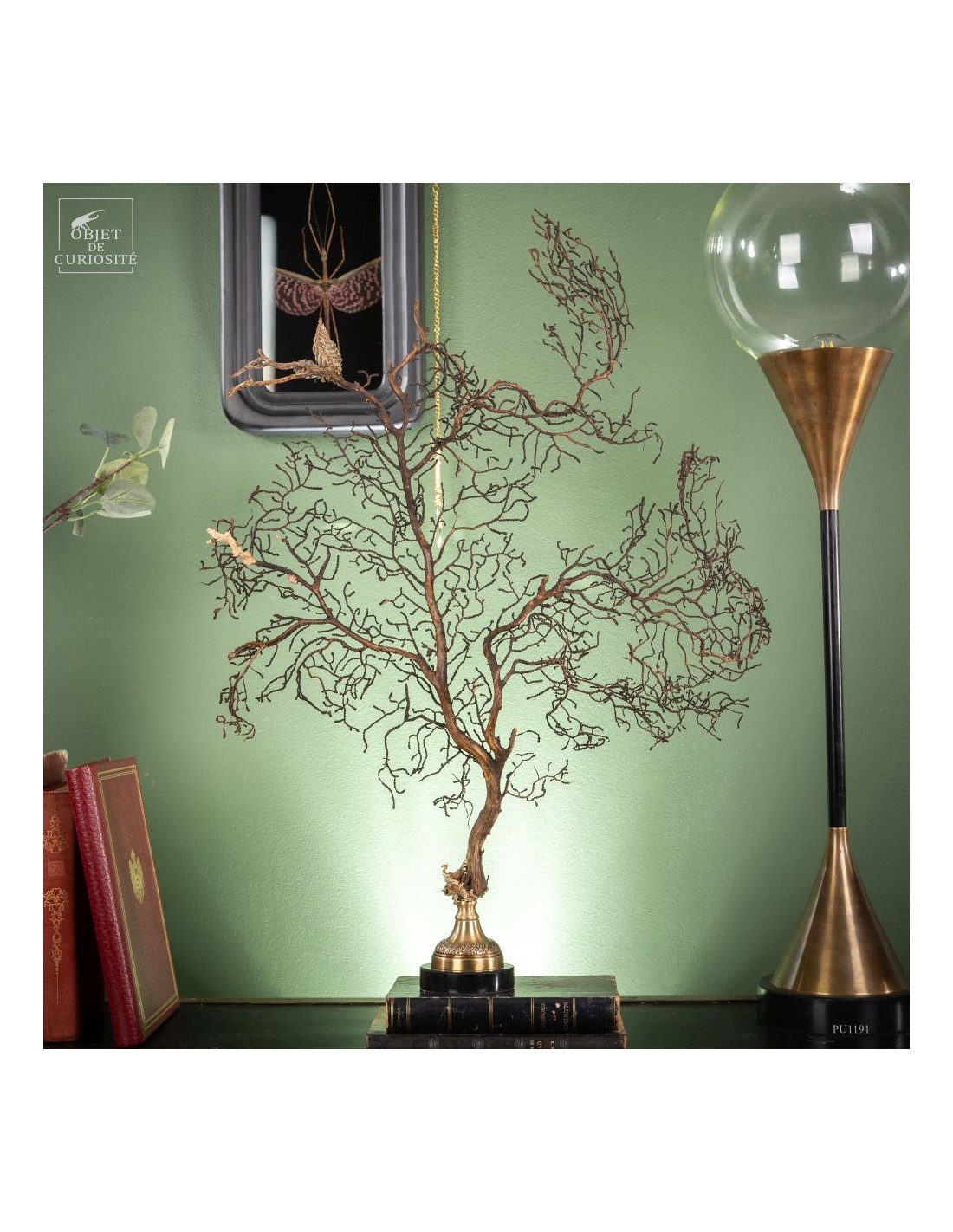 Cette gorgone marron, provenant des eaux de Micronésie, est un spécimen remarquable de polypes coloniaux marins. Chaque polype possède 8 tentacules qui filtrent le plancton dans les courants marins. Contrairement à de nombreuses espèces marines, la gorgone ne pousse pas vers la lumière, mais perpendiculairement aux courants, maximisant ainsi sa capacité à capter les nutriments. Son squelette, composé de gorgonine, est à la fois souple et résistant. Montée sur laiton et marbre, cette pièce met en valeur la beauté brute des récifs coralliens.