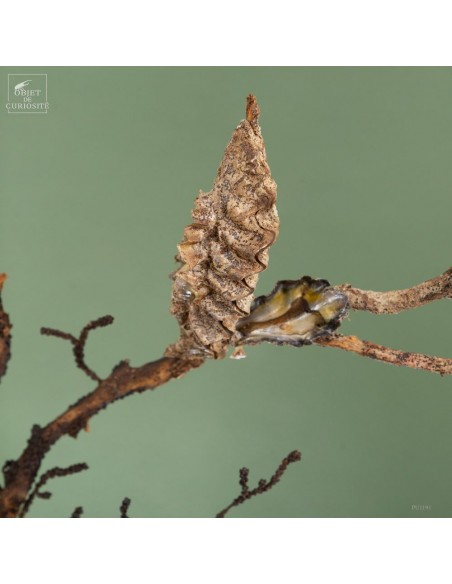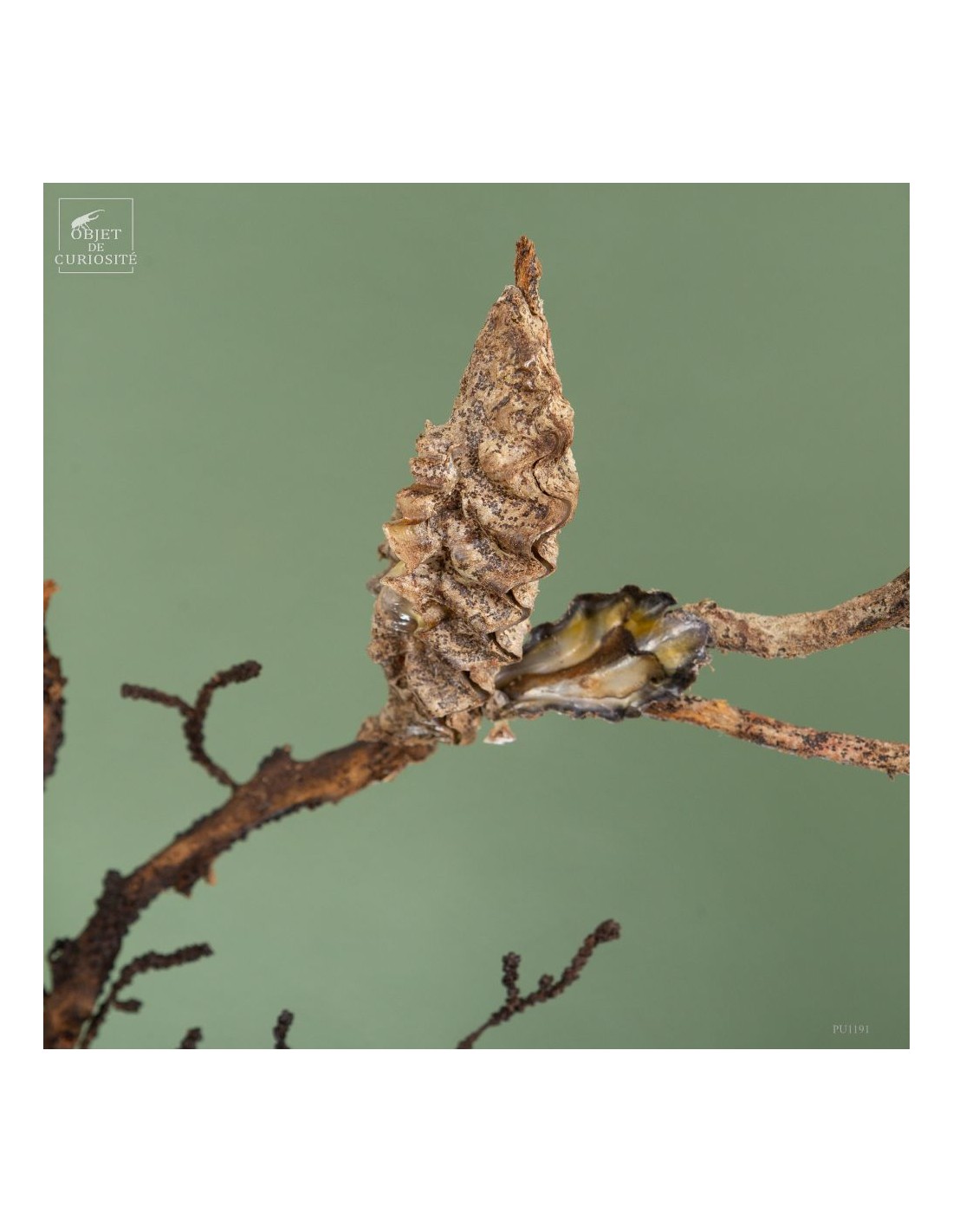 Celle-ci présente une variété d'huitre très dentelée fixée sur une branche.