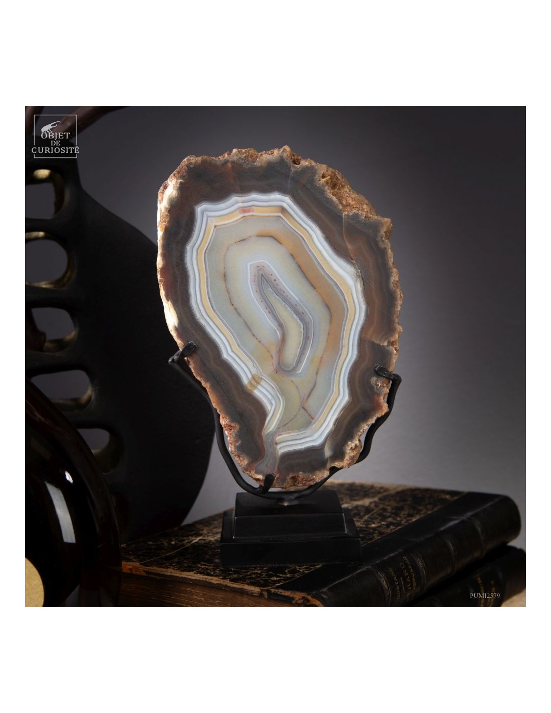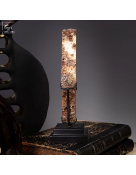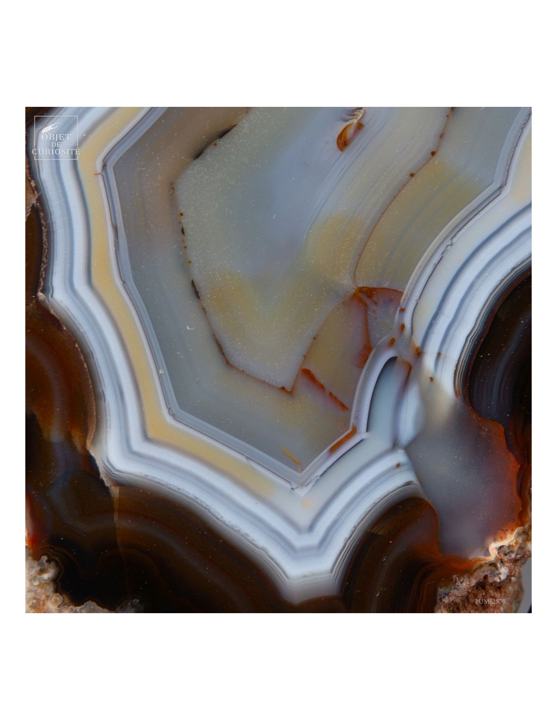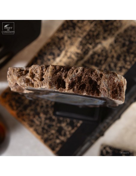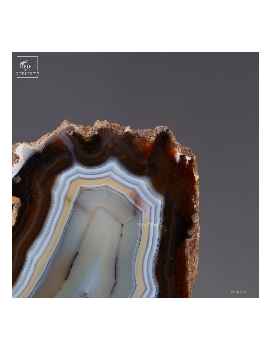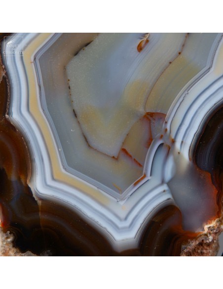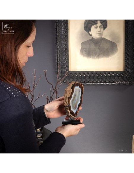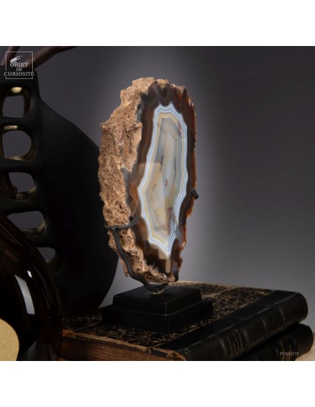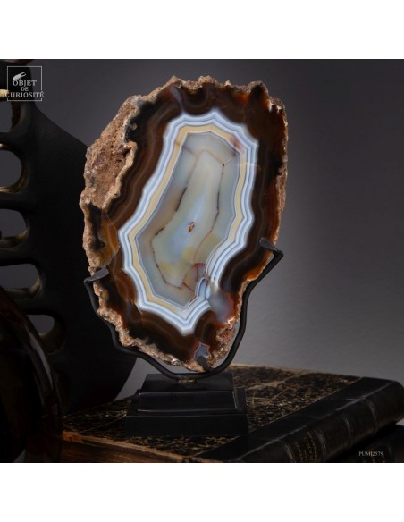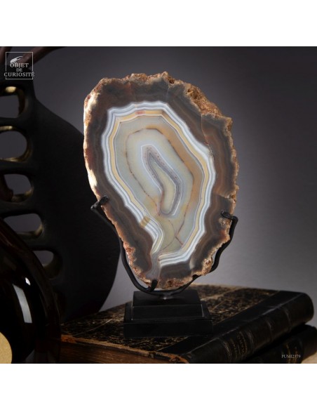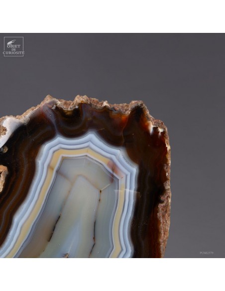 Cette tranche d’agate vient d'un gisement Brésilien. Ce spécimen de 665 g se distingue par son épaisseur. Une de ses faces a été polie pour mettre en lumière les différentes lignes formées par les dépôts successifs d'eau chargée d'oxydes (Limonite, kaolin, fer...) qui ont rempli petit à petit cette poche d'air au milieu de la lave refroidie d'un volcan.
