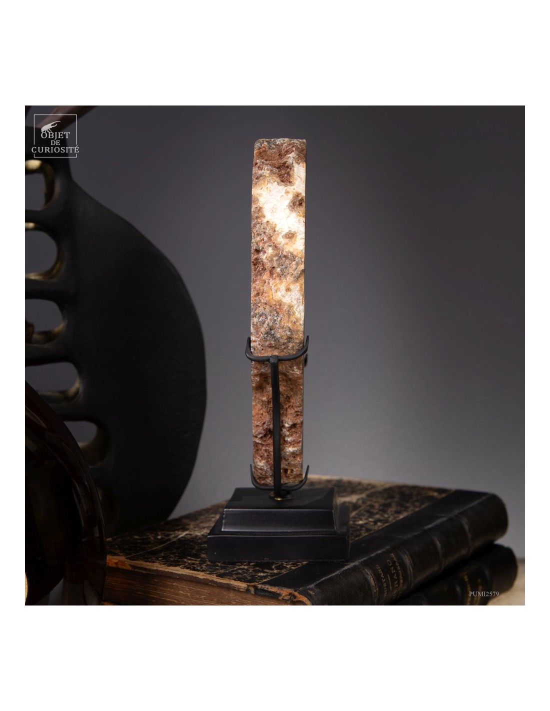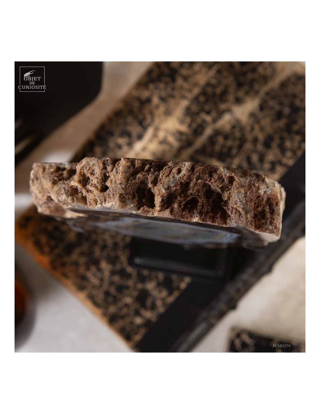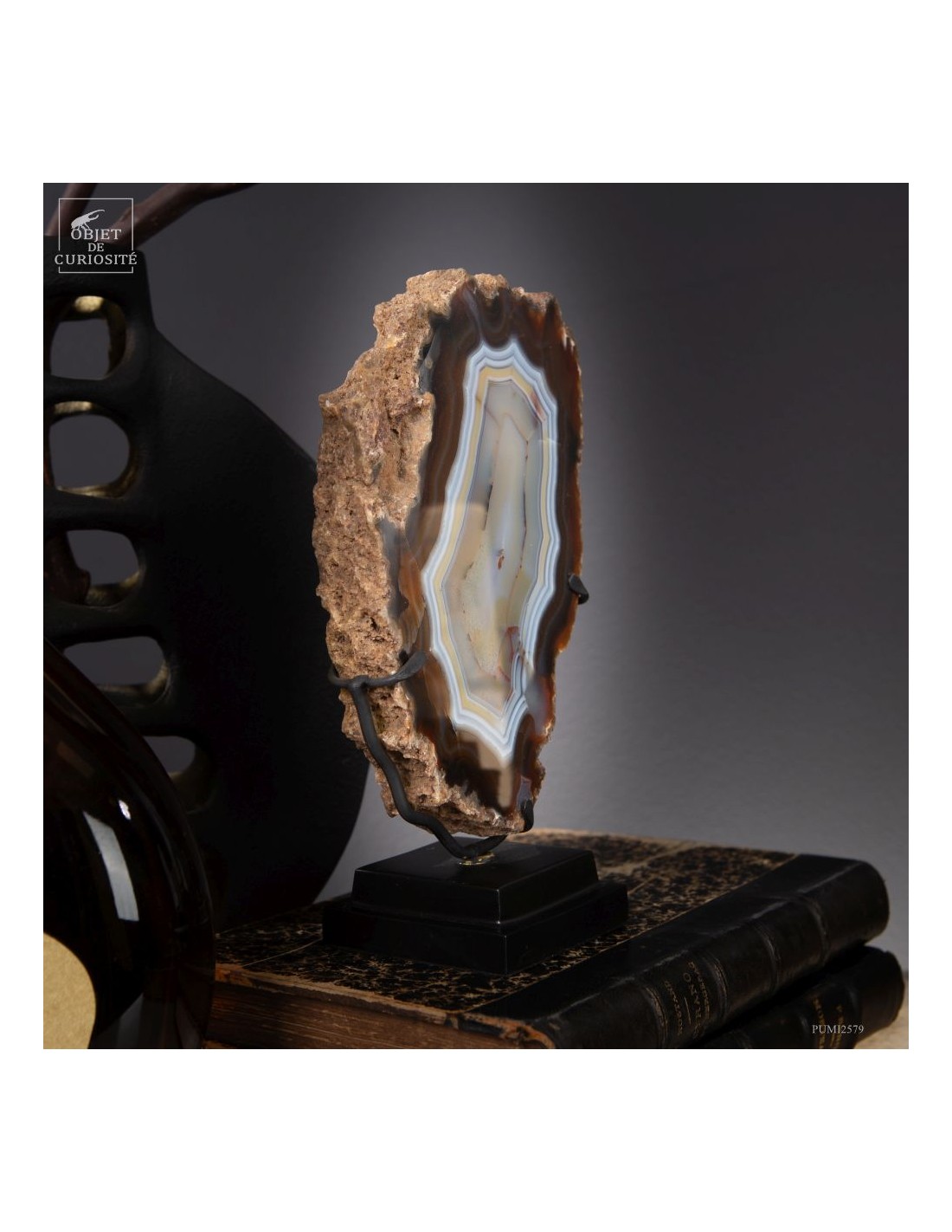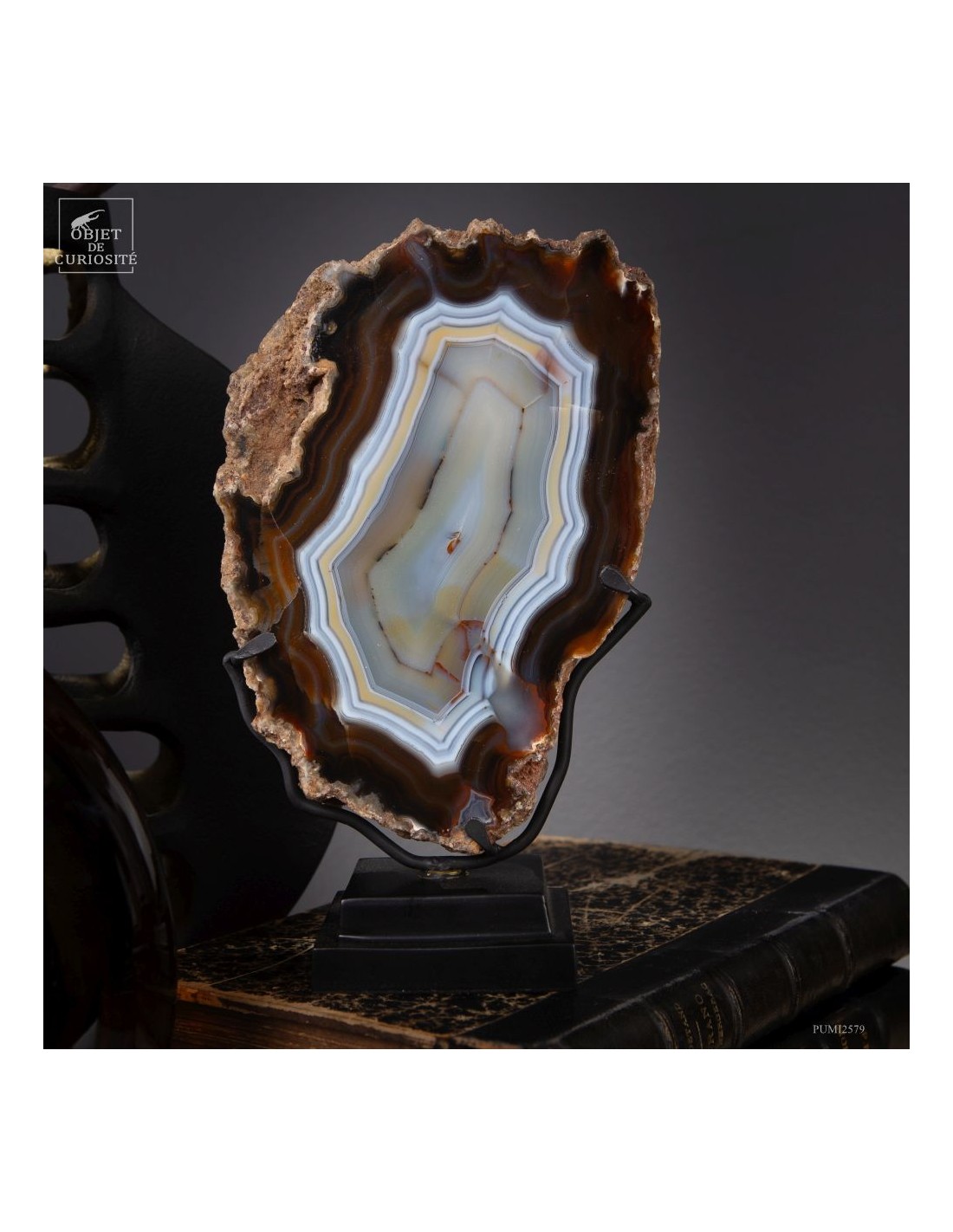 Cette tranche d’agate vient d'un gisement Brésilien. Ce spécimen de 665 g se distingue par son épaisseur. Une de ses faces a été polie pour mettre en lumière les différentes lignes formées par les dépôts successifs d'eau chargée d'oxydes (Limonite, kaolin, fer...) qui ont rempli petit à petit cette poche d'air au milieu de la lave refroidie d'un volcan.