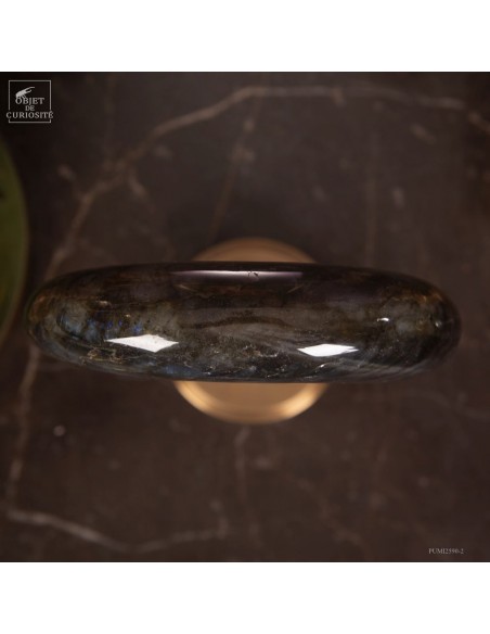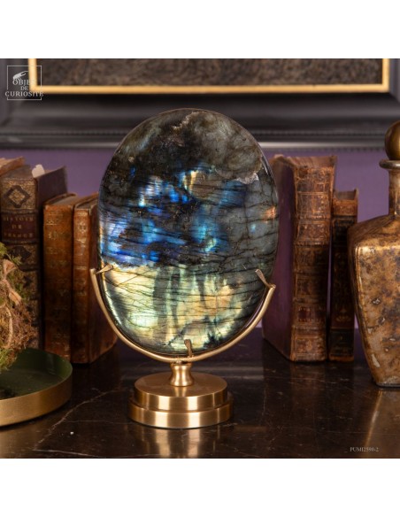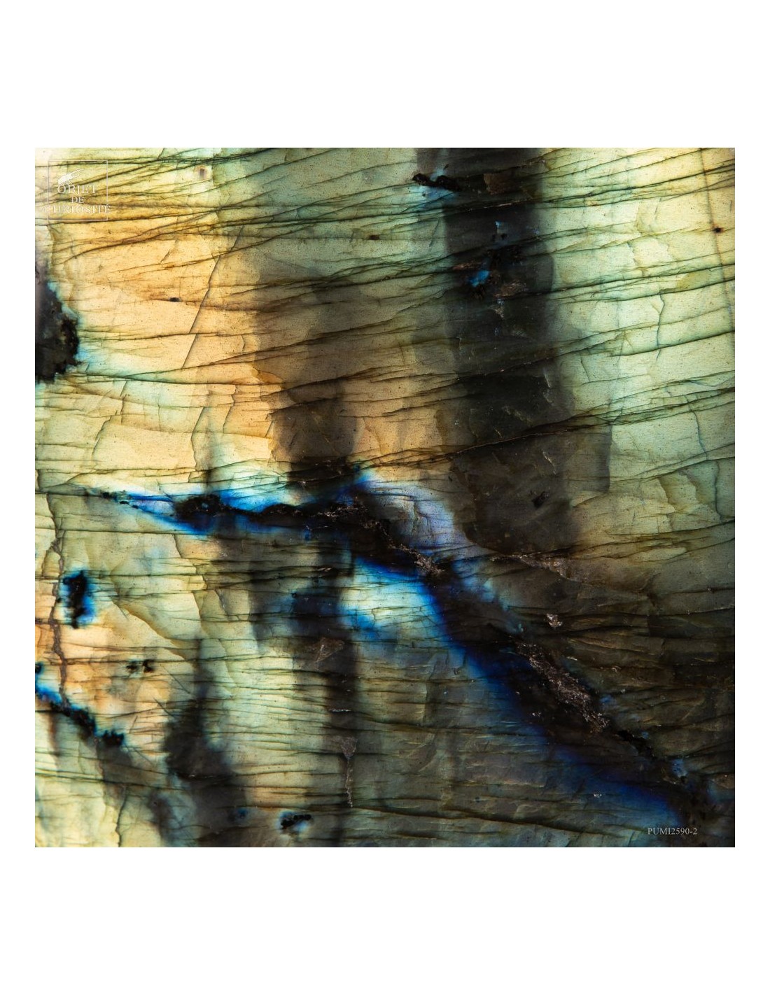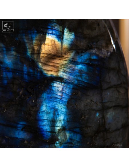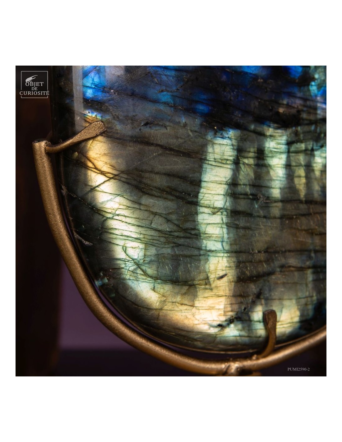 Reconnue pour son jeu de couleurs iridescent, appelé labradorescence, ce galet offre des reflets lumineux particulièrement dorés sur une face et dans des tons de bleu intense sur l'autre face. Sa surface lisse et polie met en valeur la profondeur et la complexité de ses motifs internes, transformant chaque angle en une nouvelle découverte visuelle.