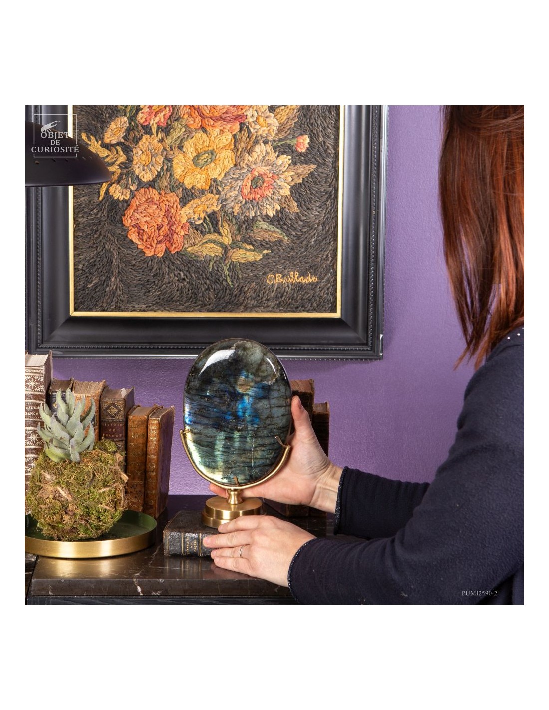 Ce galet de labradorite provient d'une mine de Madagascar située dans la région de Maniry (sud-ouest). La labradorite tire son nom de la péninsule du Labrador au Canada, où elle a été identifiée pour la première fois. Toutefois, la labradorite de Madagascar est particulièrement recherchée pour sa qualité exceptionnelle, due aux conditions géologiques uniques de l’île.