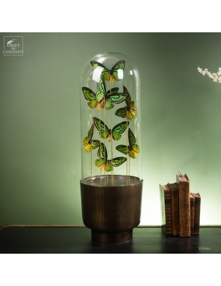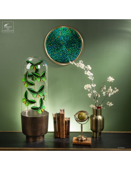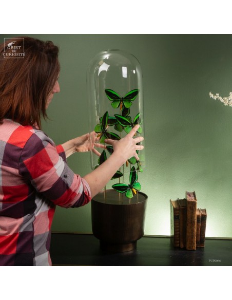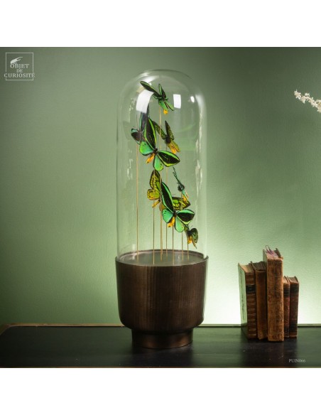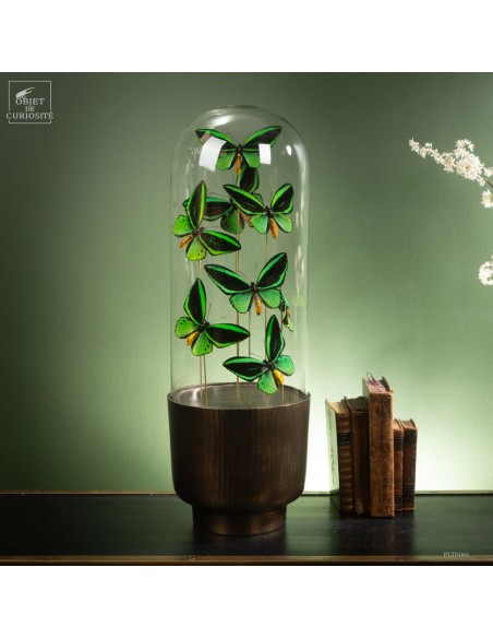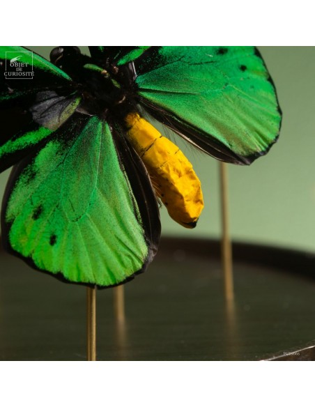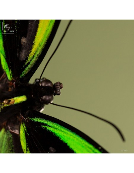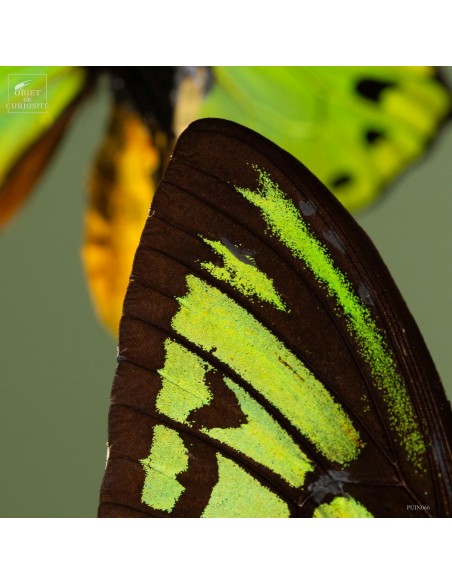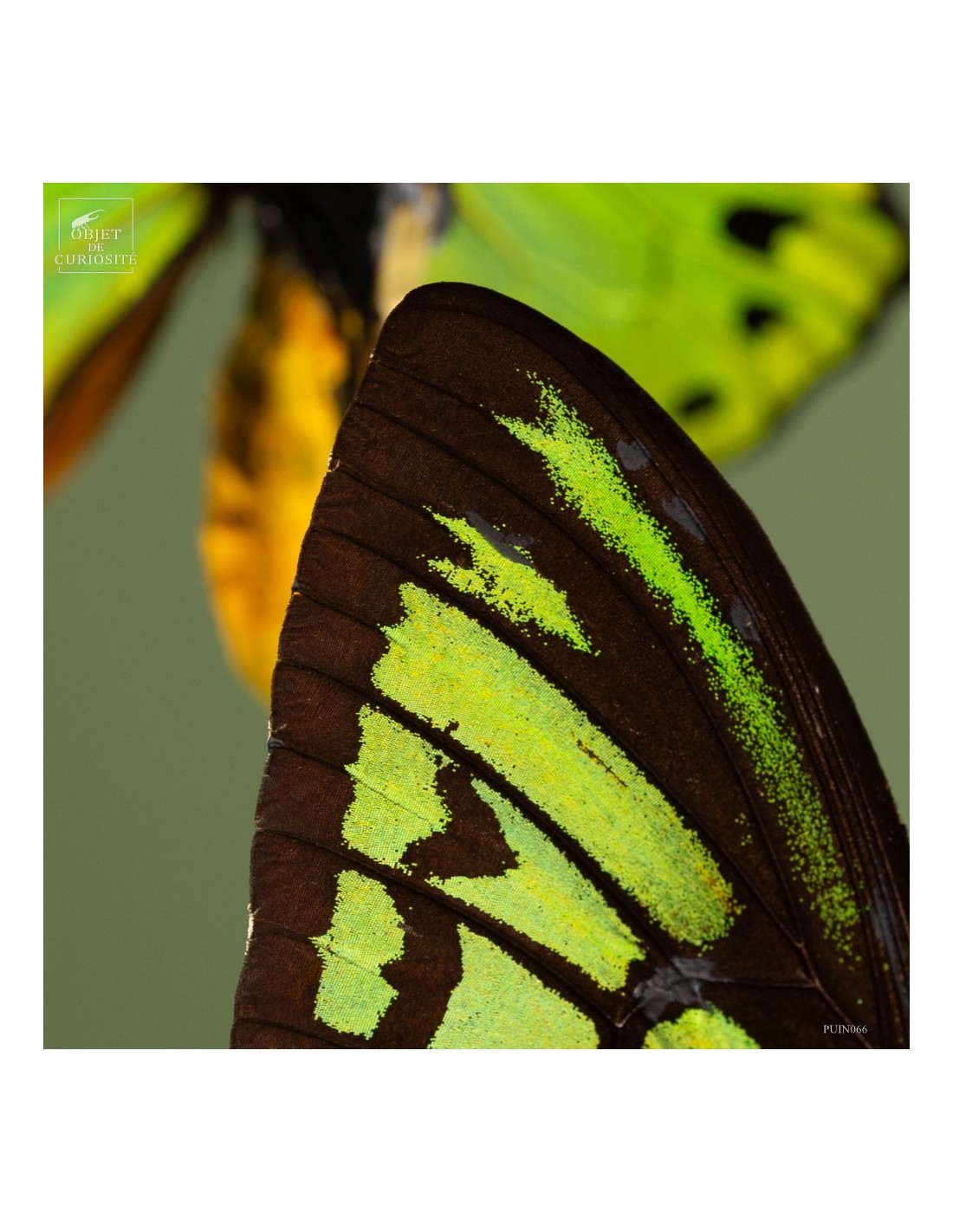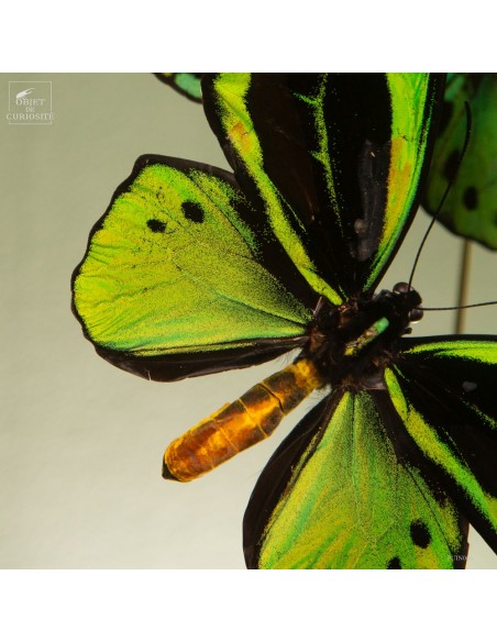 Le plus commun des papillon à ailes d'oiseaux -Ornithoptera Priamus- n'est en fait pas aussi commun, car il ne se trouve que dans quelques petites îles du Pacifique: Papouasie Nouvelle Guinée, Sud des îles Molluques, Iles Salomon... Des îles où leurs forêts diminuent année après année sous l'influence des hommes. C'est pourquoi cette espèce protégée sera livrée avec un CITES. Seuls les mâles possèdent ces couleurs éclatantes, les femelles sont encore plus grandes, mais de couleur marron. Ils sont tellement remarquables que nos spécimens viennent désormais d'une ferme en Indonésie.