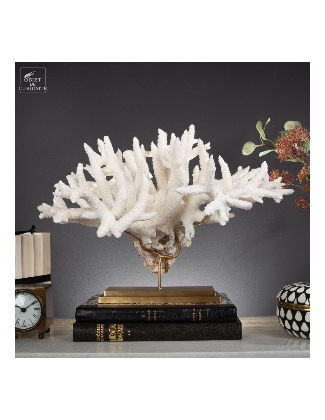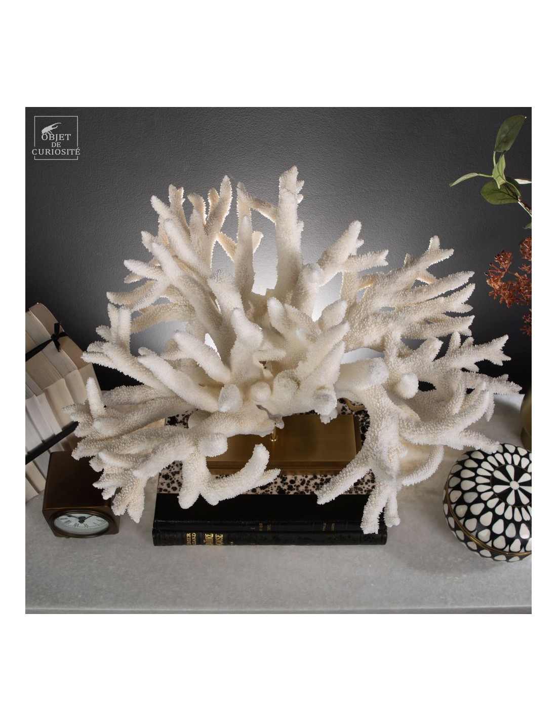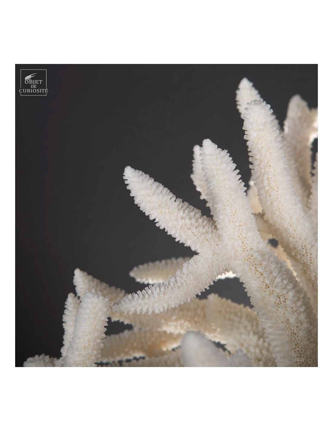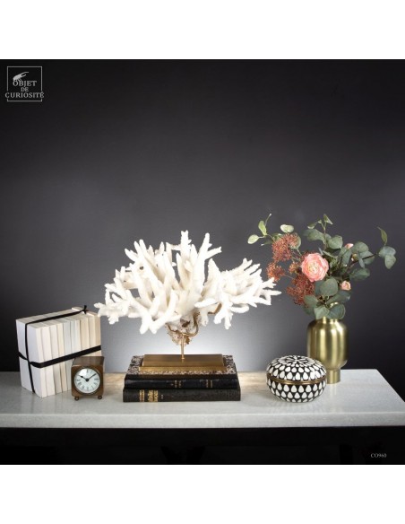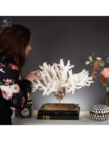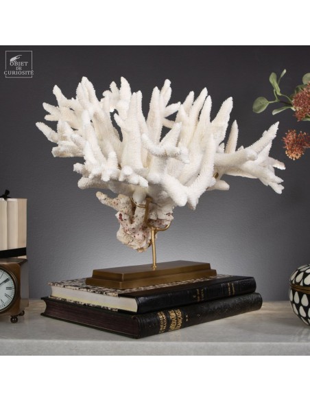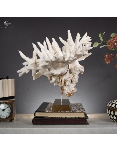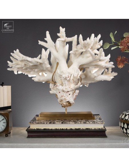 Le corail Acropora nobilis, appelé corail “Staghorn” en raison de ses branches fines rappelant les cornes de cerf, est une espèce répandue dans la zone Indopacifique, notamment autour des Îles Salomon, d’où provient cette pièce. Ce corail se distingue par ses colonies enchevêtrées formant des structures complexes et aérées. Sa couleur varie généralement du crème au jaune pâle, avec des pointes blanchâtres qui restent visibles, témoignant de la croissance active de l’espèce.