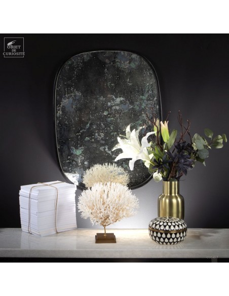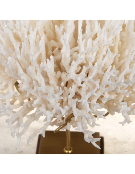 Corail nid blanc sur socle laiton. Composé de centaines de petites branches, ce corail provient des Iles Salomon. Son nom scientifique est Seriatopora Hystrix. Sous l'eau, seules les pointes restent blanches, tout le reste est d'un rose fushia (ou jaune pour certaines sous-espèces) Ce corail est livré avec sa propre référence CITES (Convention de Washington sur les espèces à commerce sous surveillance)