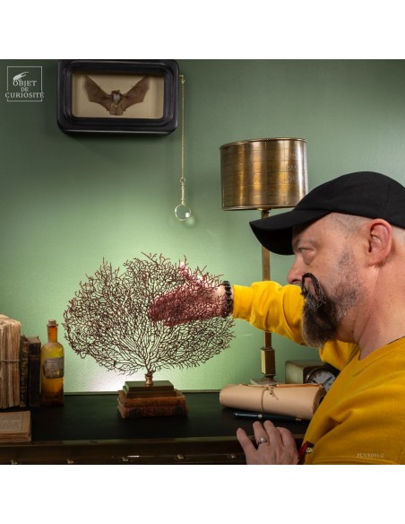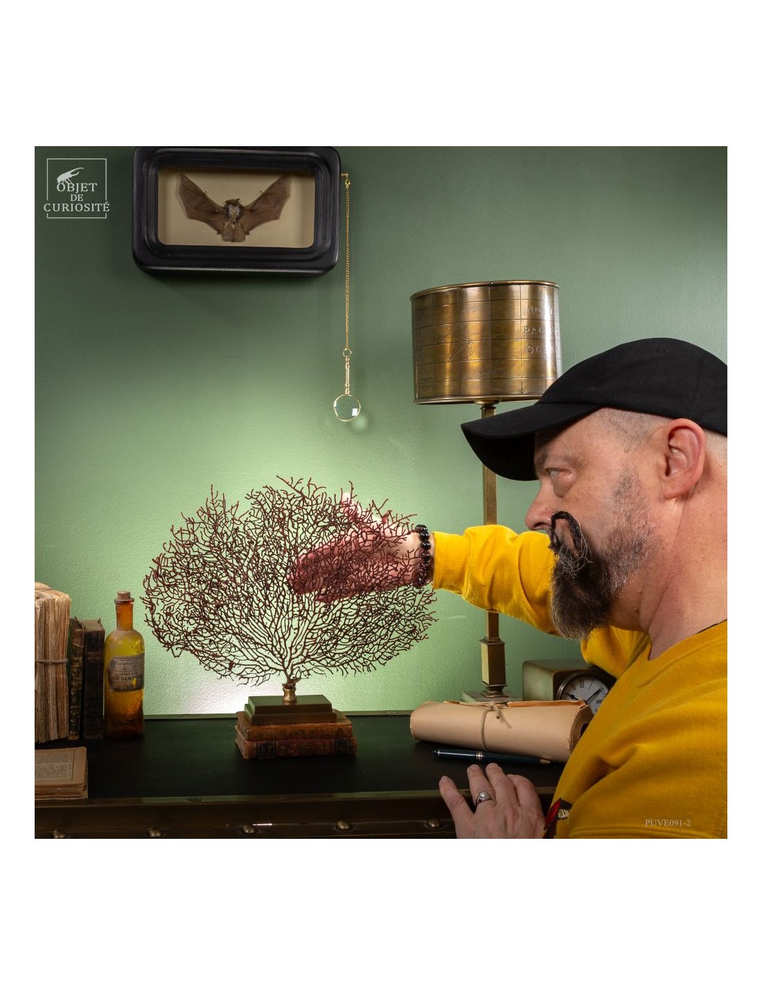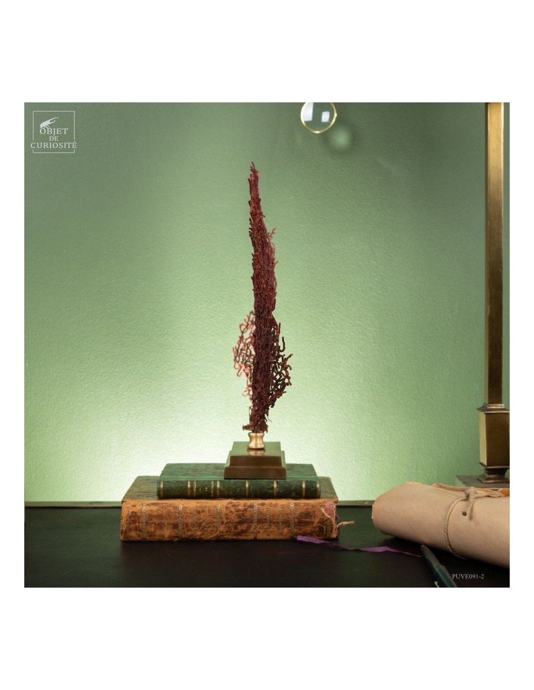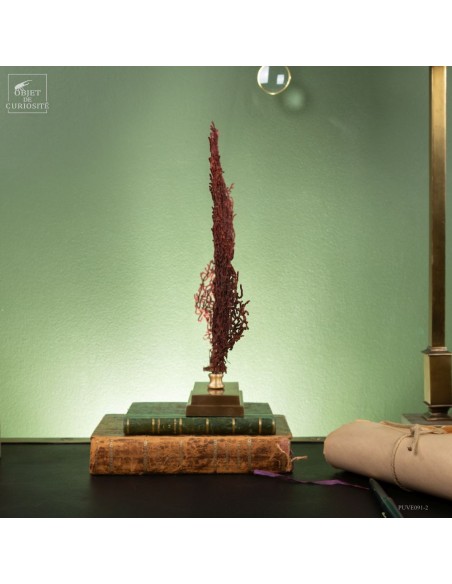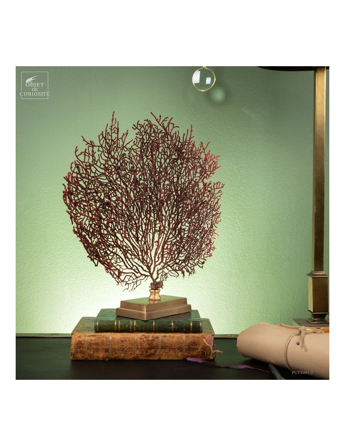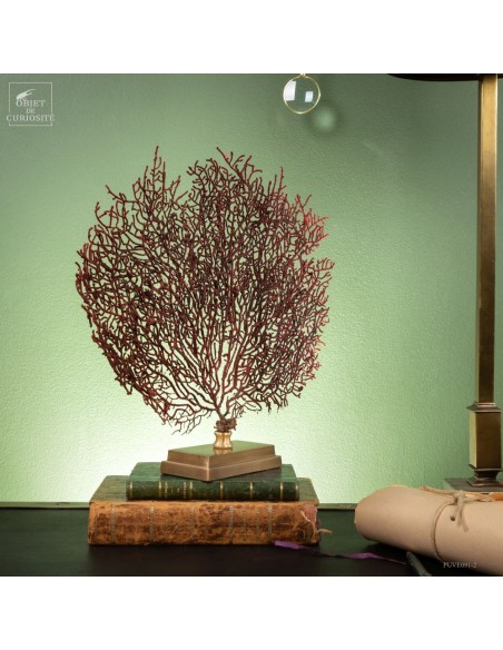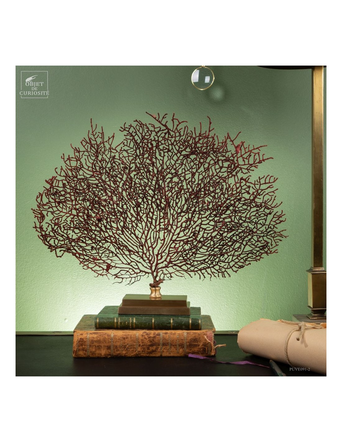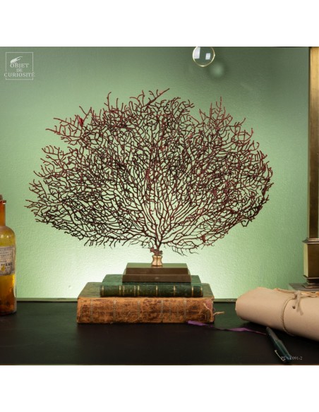 C'est une Gorgone rouge (Acabaria biserialis) que l'on rencontre entre 20 et 100 mètres de profondeur. Il est nécessaire d'utiliser une lampe torche pour apprécier leur éclat, car à cette profondeur, le rouge parait bleu sombre. Fixées perpendiculairement à leur support, les ramifications colonisées de polypes filtrent l'eau au gré du courant pour capturer les micro-organismes en suspension. Bien sûr, ce rouge foncé, c'est sa couleur naturelle.