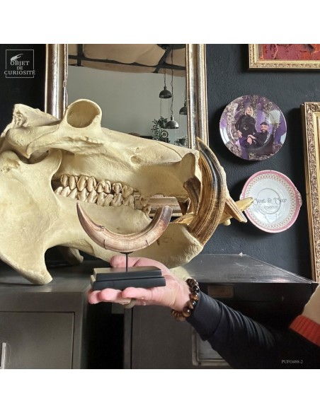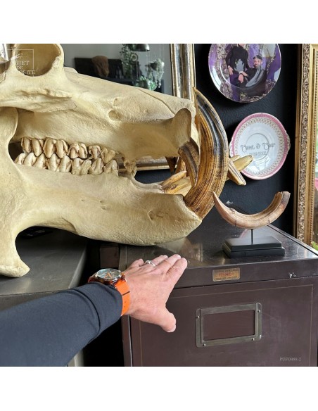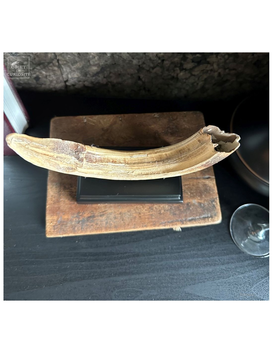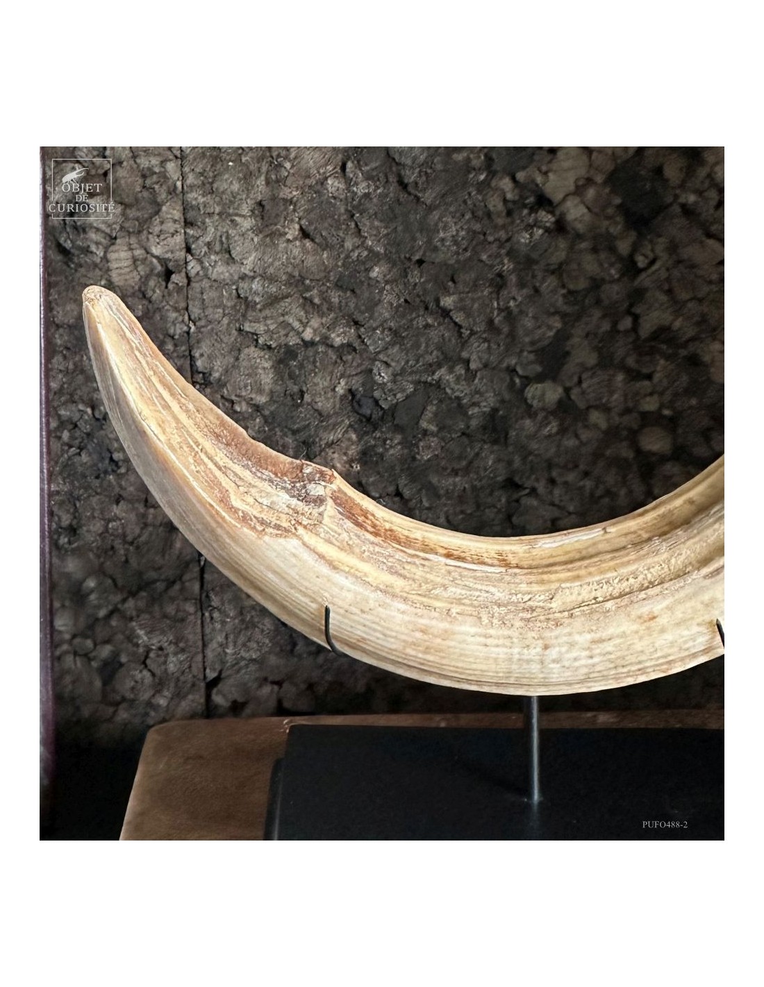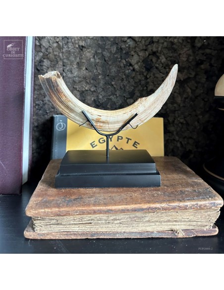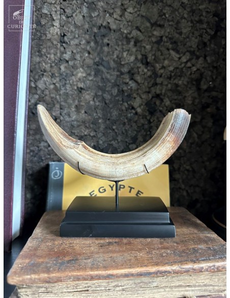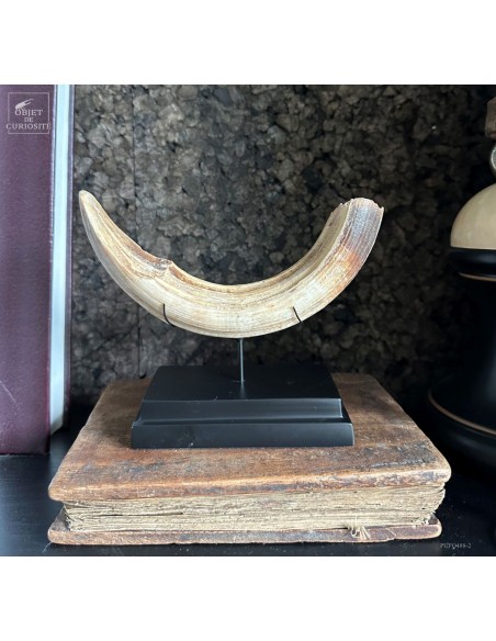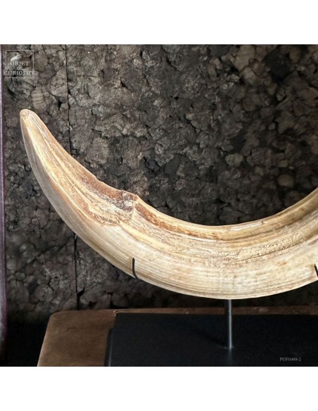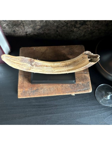 Cette défense subfossile appartenait à Hippopotamus lemerlei, une espèce d’hippopotame endémique de Madagascar, aujourd’hui éteinte. Plus petit que ses cousins africains, il arpentait autrefois les rivières et marécages de l’île. On voit cette difference de taille spécialement sur la photo devant un crâne d'hippopotame actuel.