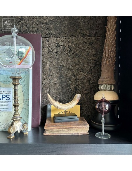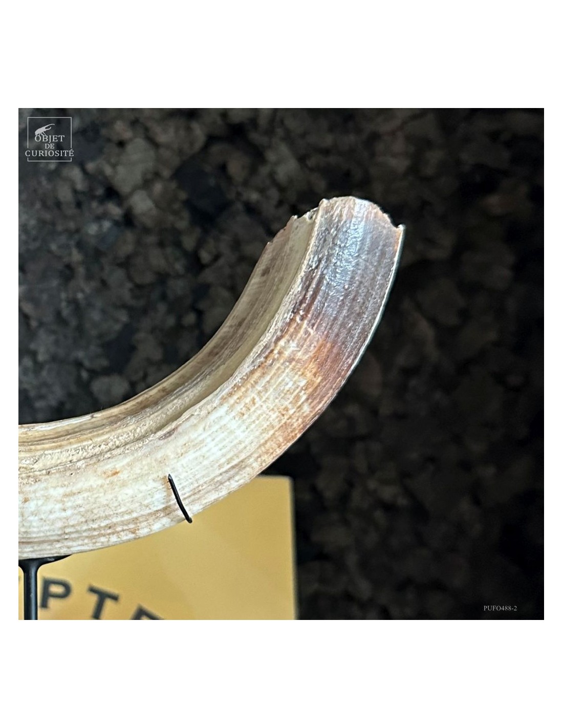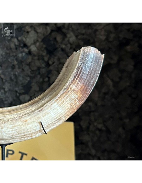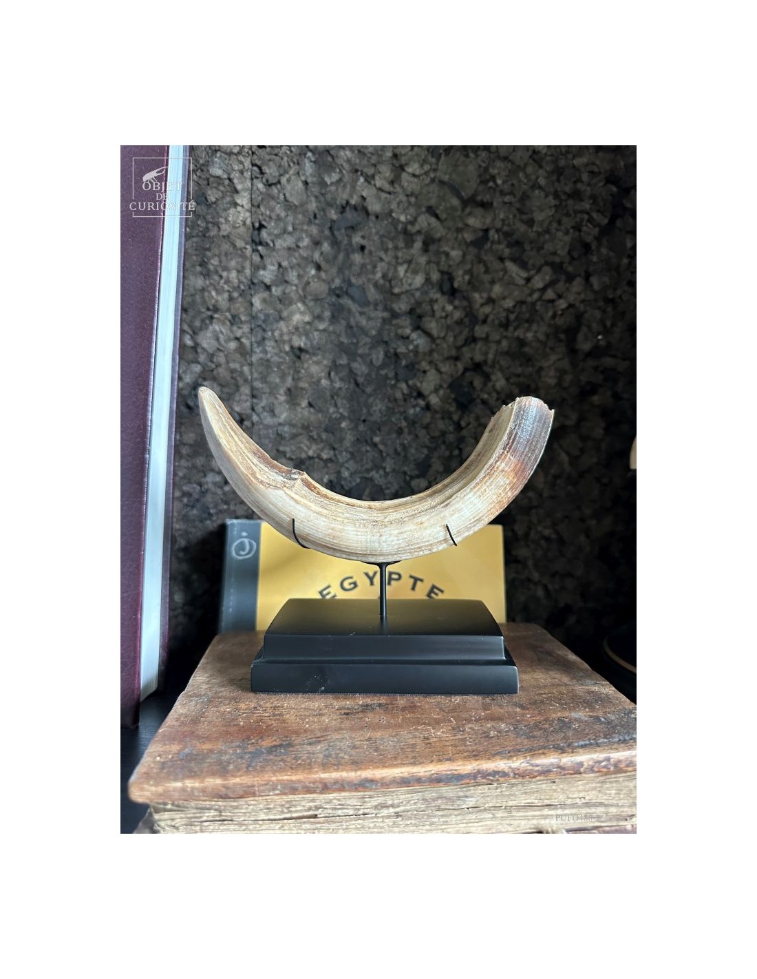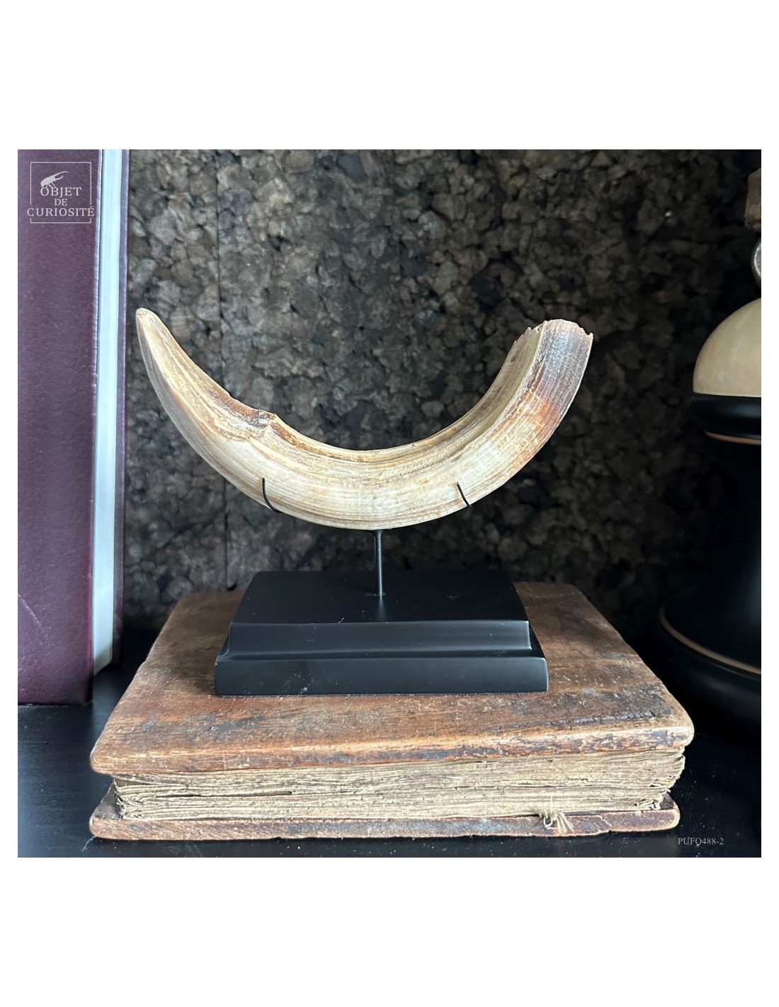 Cette défense subfossile appartenait à Hippopotamus lemerlei, une espèce d’hippopotame endémique de Madagascar, aujourd’hui éteinte. Plus petit que ses cousins africains, il arpentait autrefois les rivières et marécages de l’île. On voit cette difference de taille spécialement sur la photo devant un crâne d'hippopotame actuel.
