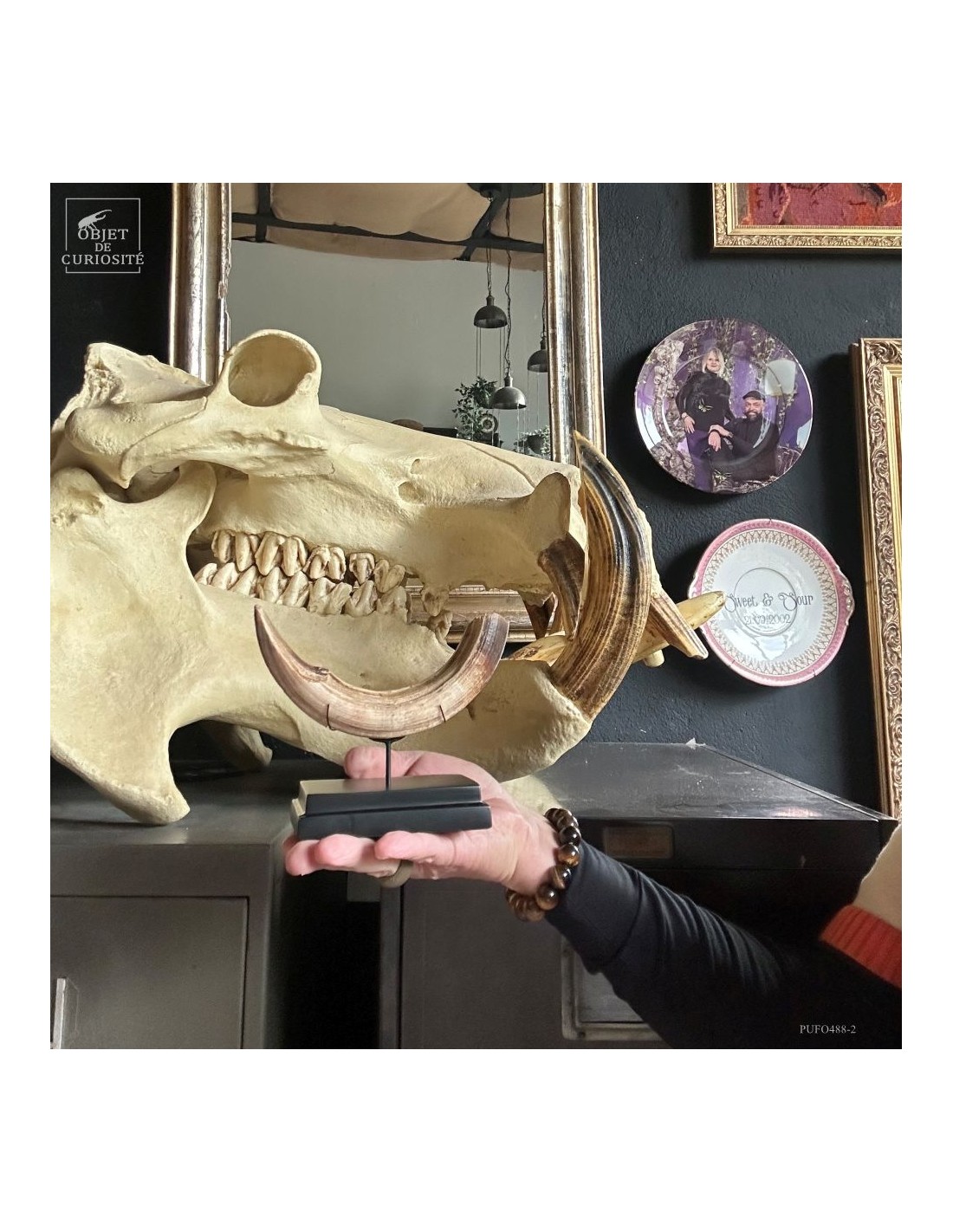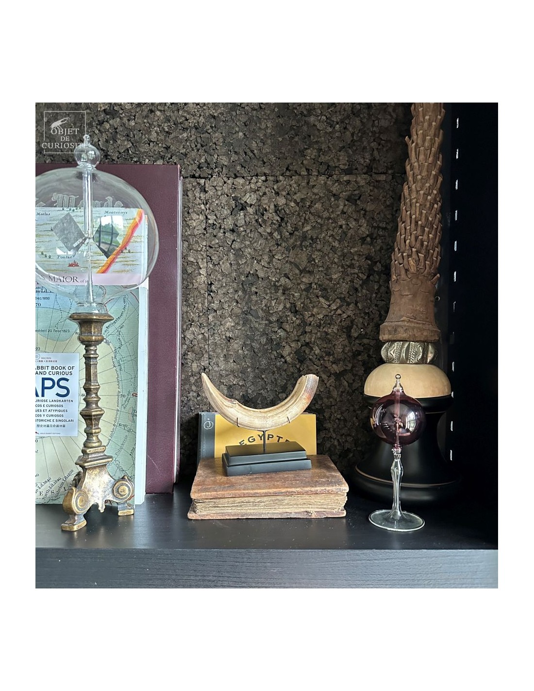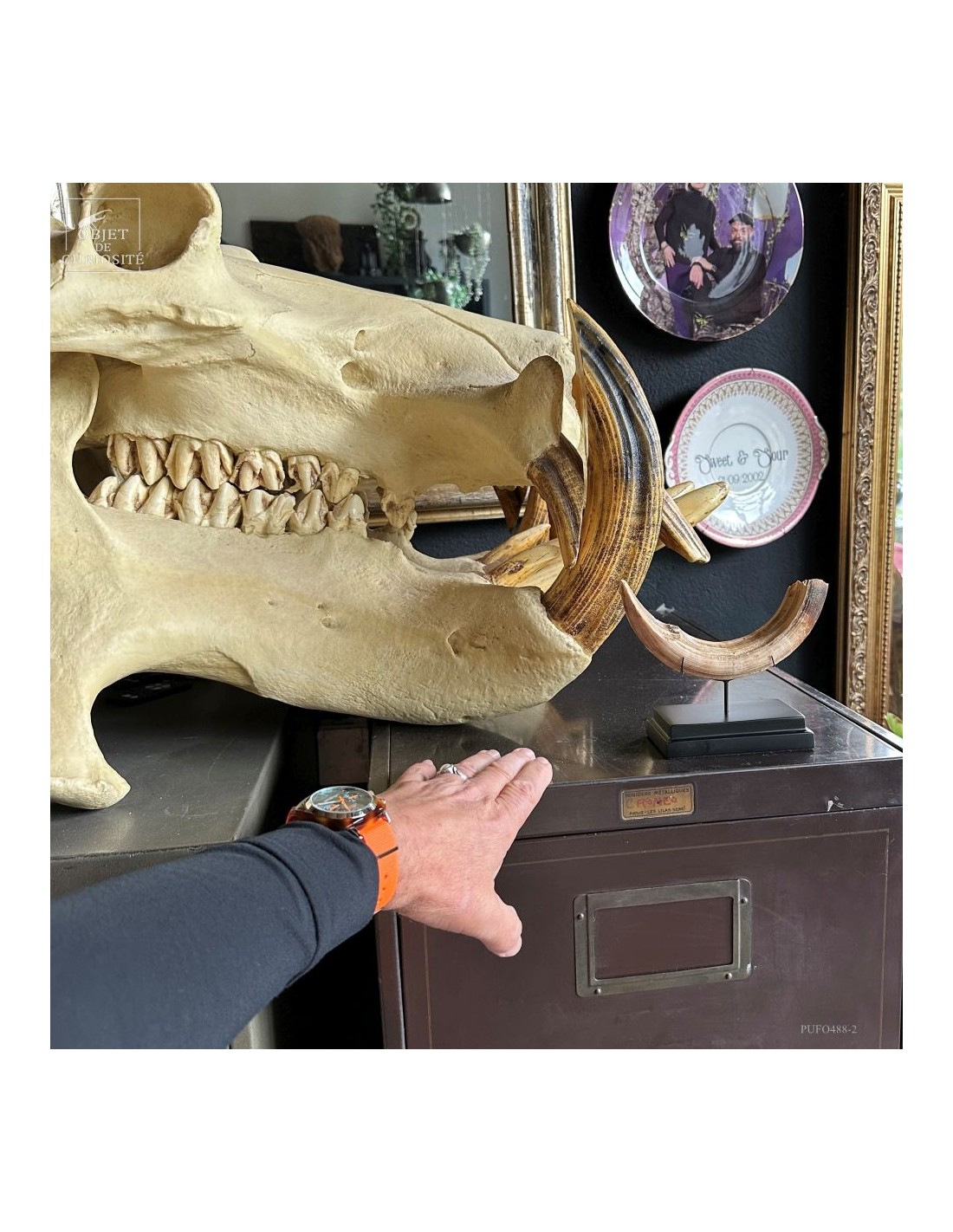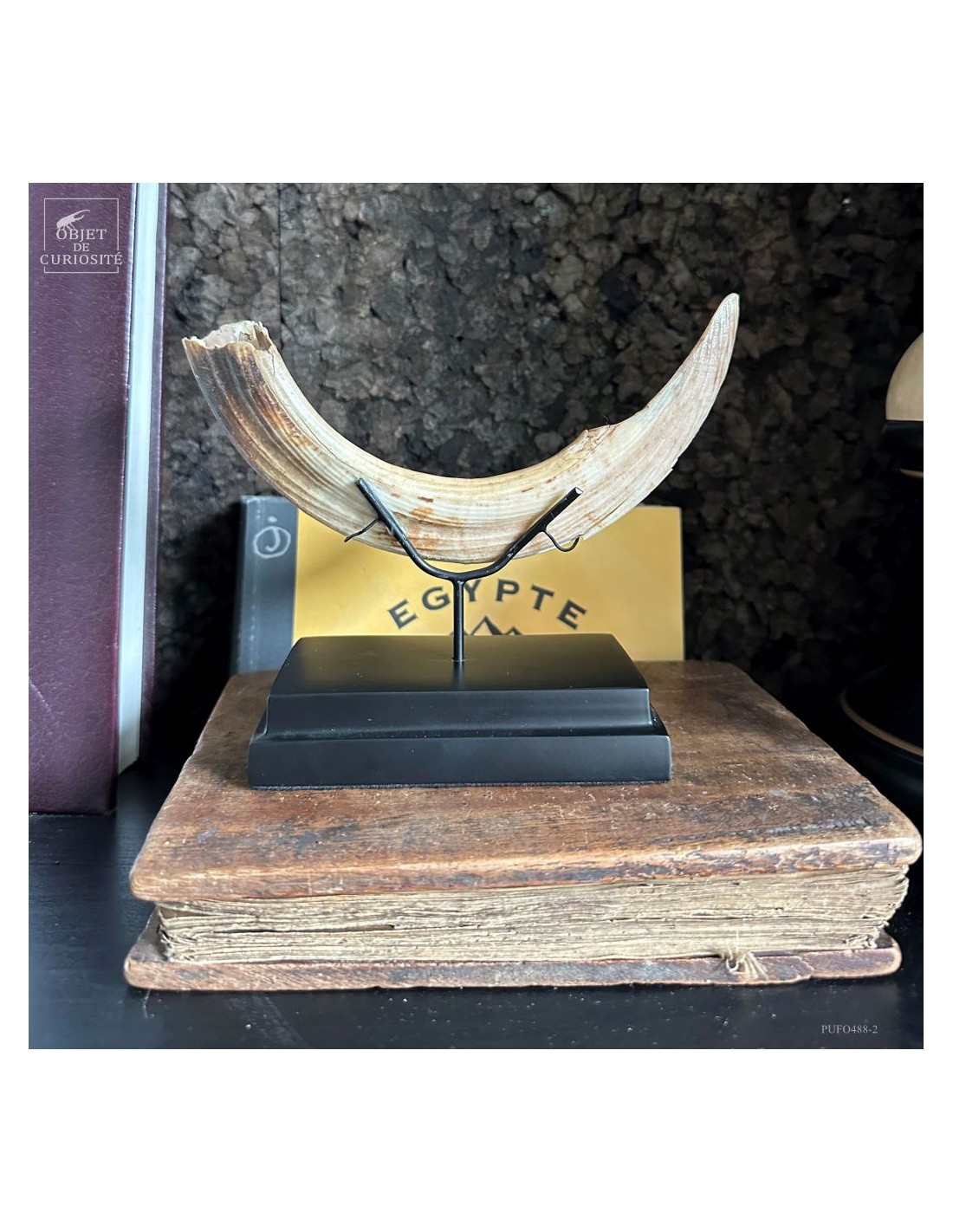 Cette défense subfossile appartenait à Hippopotamus lemerlei, une espèce d’hippopotame endémique de Madagascar, aujourd’hui éteinte. Plus petit que ses cousins africains, il arpentait autrefois les rivières et marécages de l’île. On voit cette difference de taille spécialement sur la photo devant un crâne d'hippopotame actuel.