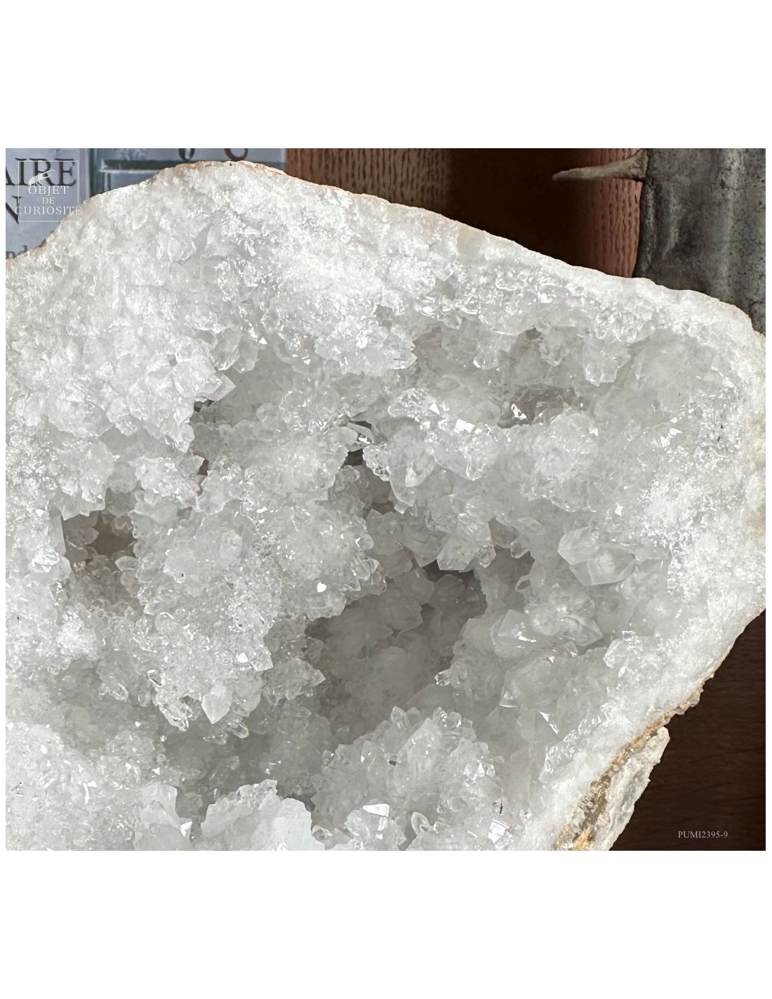Ce minéral est une géode de Quartz blanc de l'extrême sud Marocain - près de Laâyoune - et qui a l'air d'une simple boule de pierre naturelle. L'intérieur est une vraie cavité de cristaux naturels. Comme celle-ci est profonde, on dirait presque de la neige. Un contraste saisissant avec l'extérieur très simple de ce minéral.