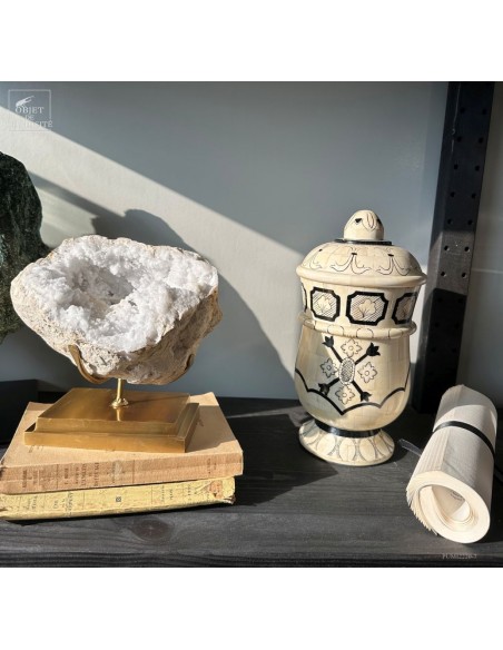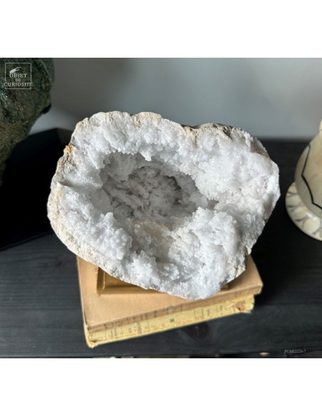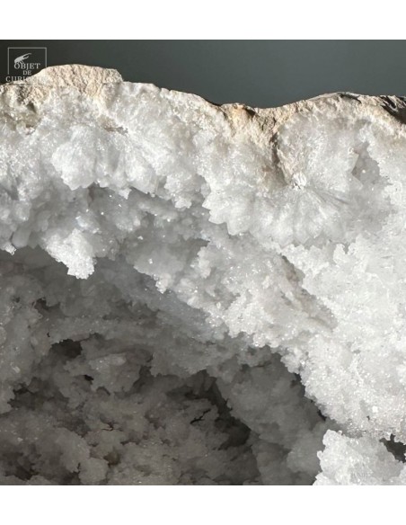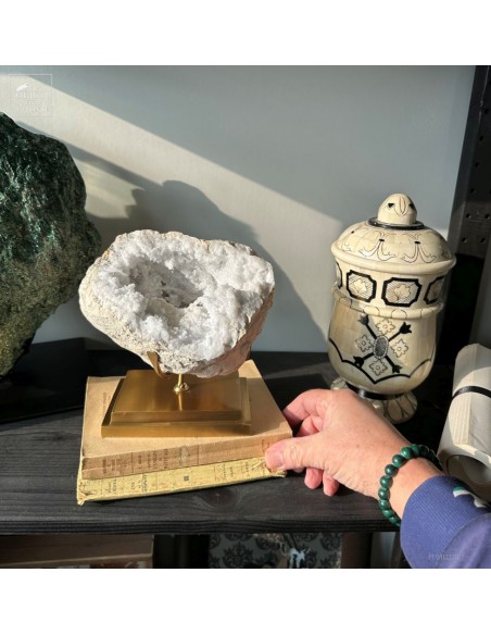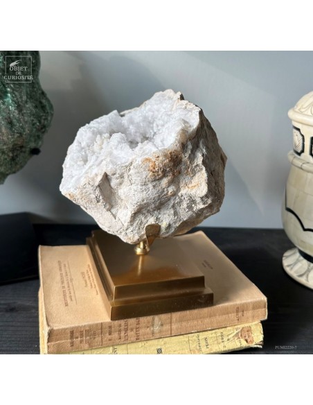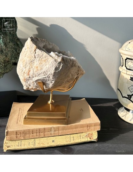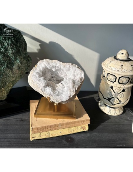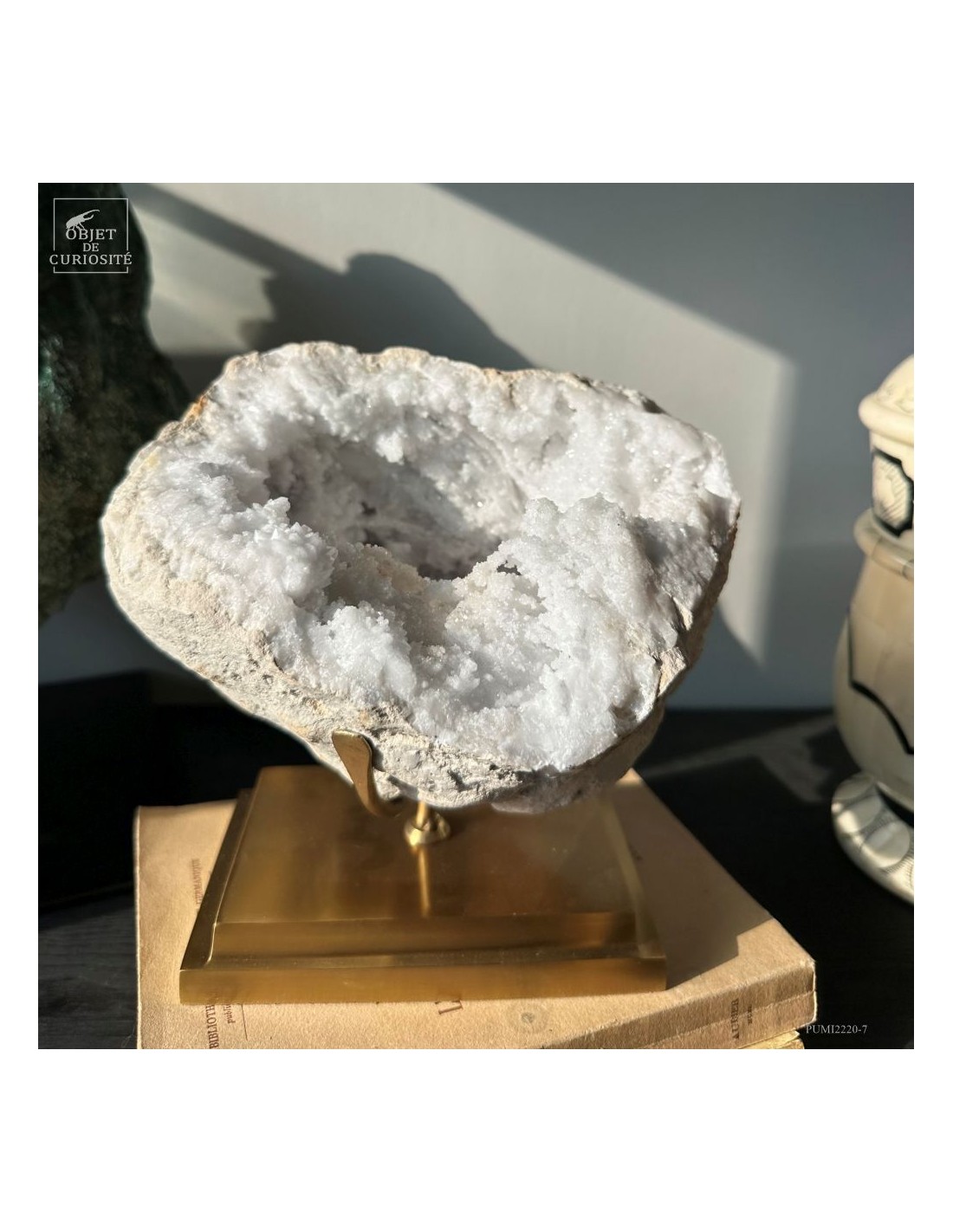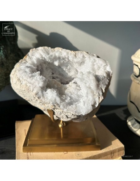 Ce minéral est une géode de Quartz blanc de l'extrême sud Marocain - près de Laâyoune - . L'intérieur est une cavité de cristaux naturels blancs immaculés.  Tout simple sur une base en laiton, un produit blanc et or.