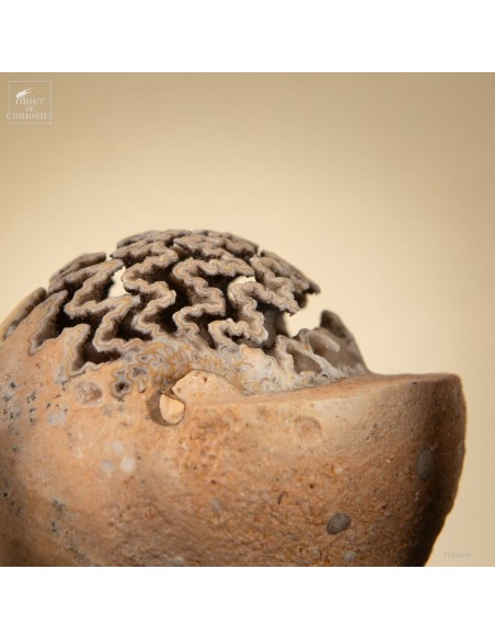 Ce fossile provient d'un site très ancien de la partie Est de Timor, juste à côté de l'Australie: Le Bobonaro Scaly Clay Une zone où se mélange des restes du Gondwana, ce super continent unique il y a 600 million d'années, jusqu'à ces couches marines du Trias supérieur (environ 200 millions d’années). Il s’agit d’une ammonite dont la coquille spiralée est ici partiellement sablée pour révéler les lignes complexes des cloisons entre les loges de flottaison : ces lignes de séparation des loges sont en fait très complexes en "zig-zag". Et elles sont parfaitement mises en valeur par le travail minutieux de Flavio...