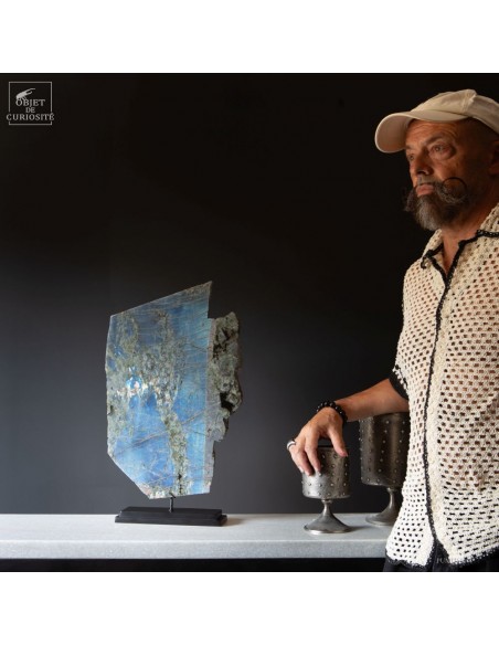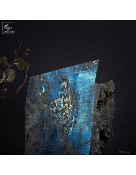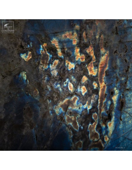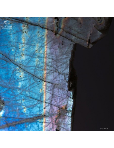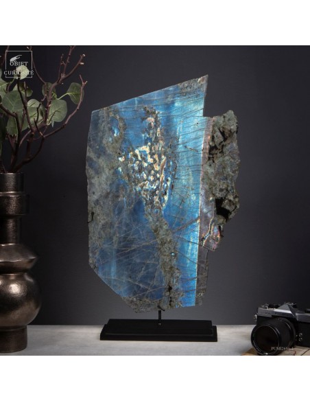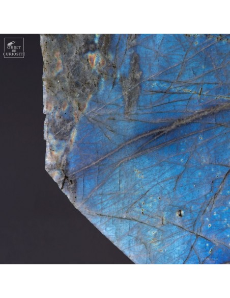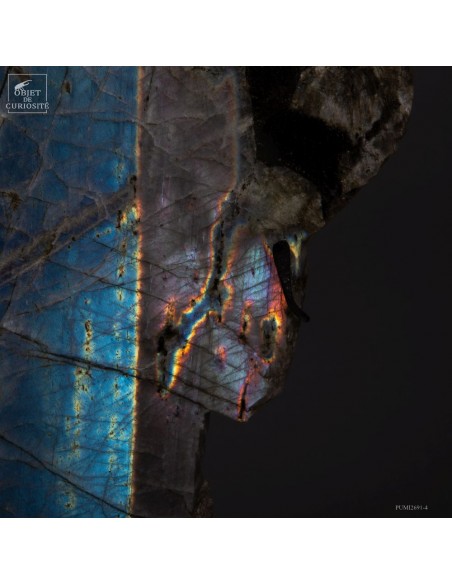 Issue de la région de Maniry, au sud-ouest de Madagascar, cette plaque de labradorite provient d’un gisement réputé pour la dimension de ses cristaux.
