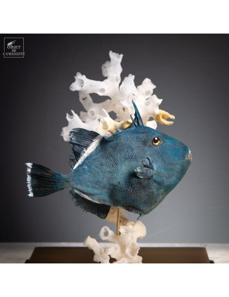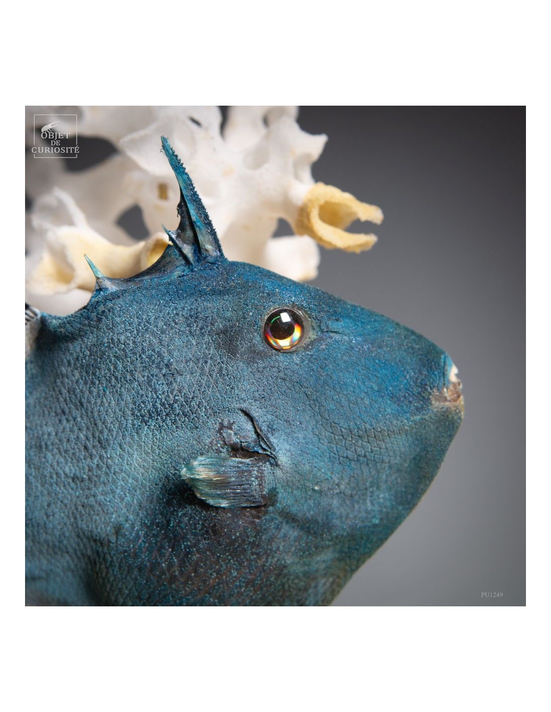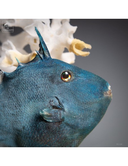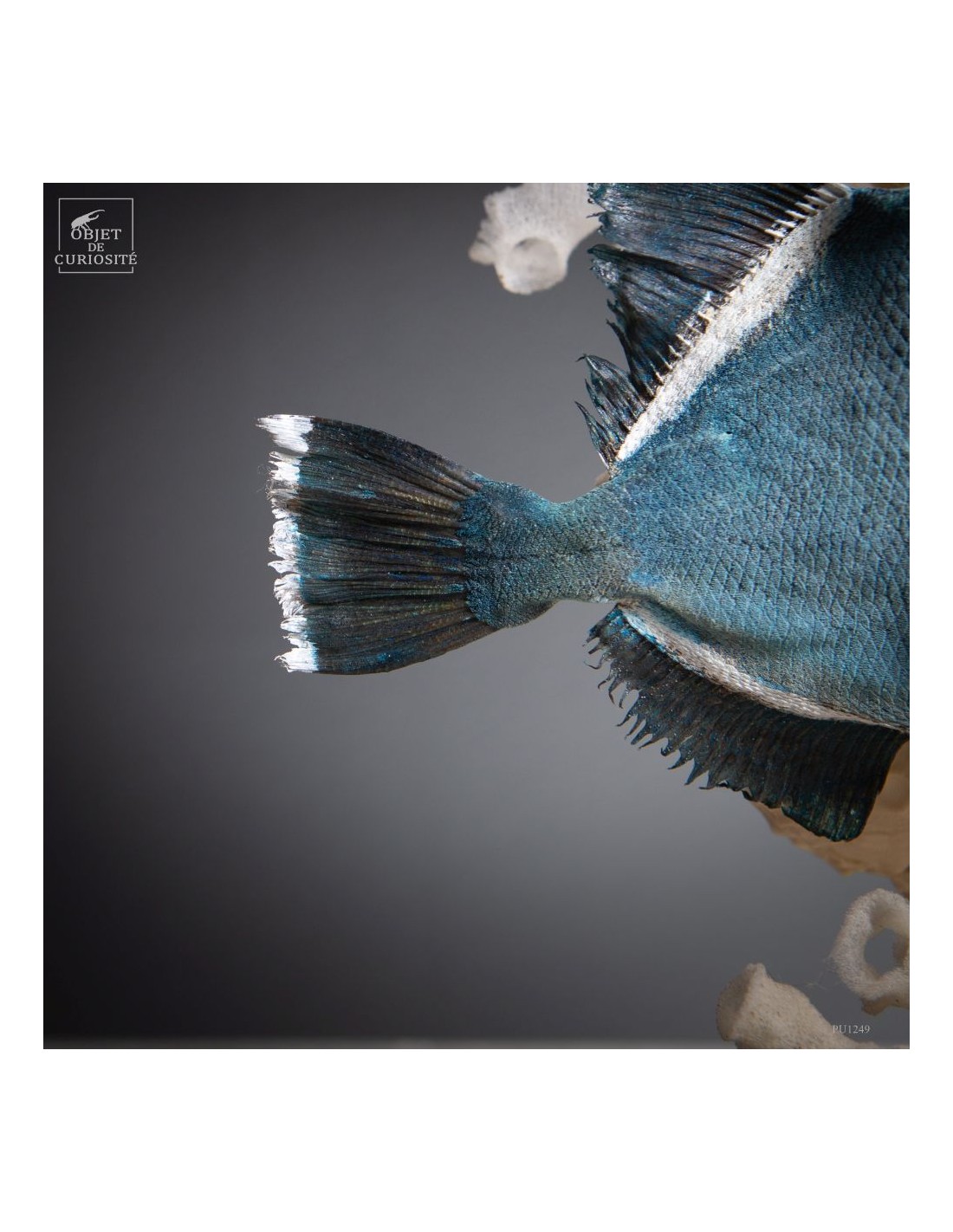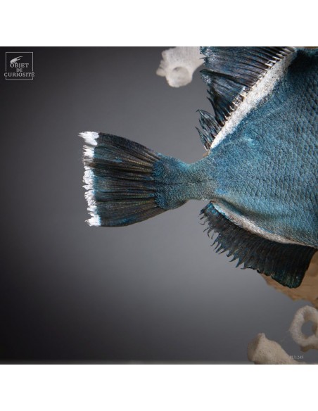 Comme pour la plupart des poissons naturalisés, une recolorisation minutieuse a été réalisée afin de restituer les nuances bleu ardoise et le maillage d’écailles propres à l’espèce.