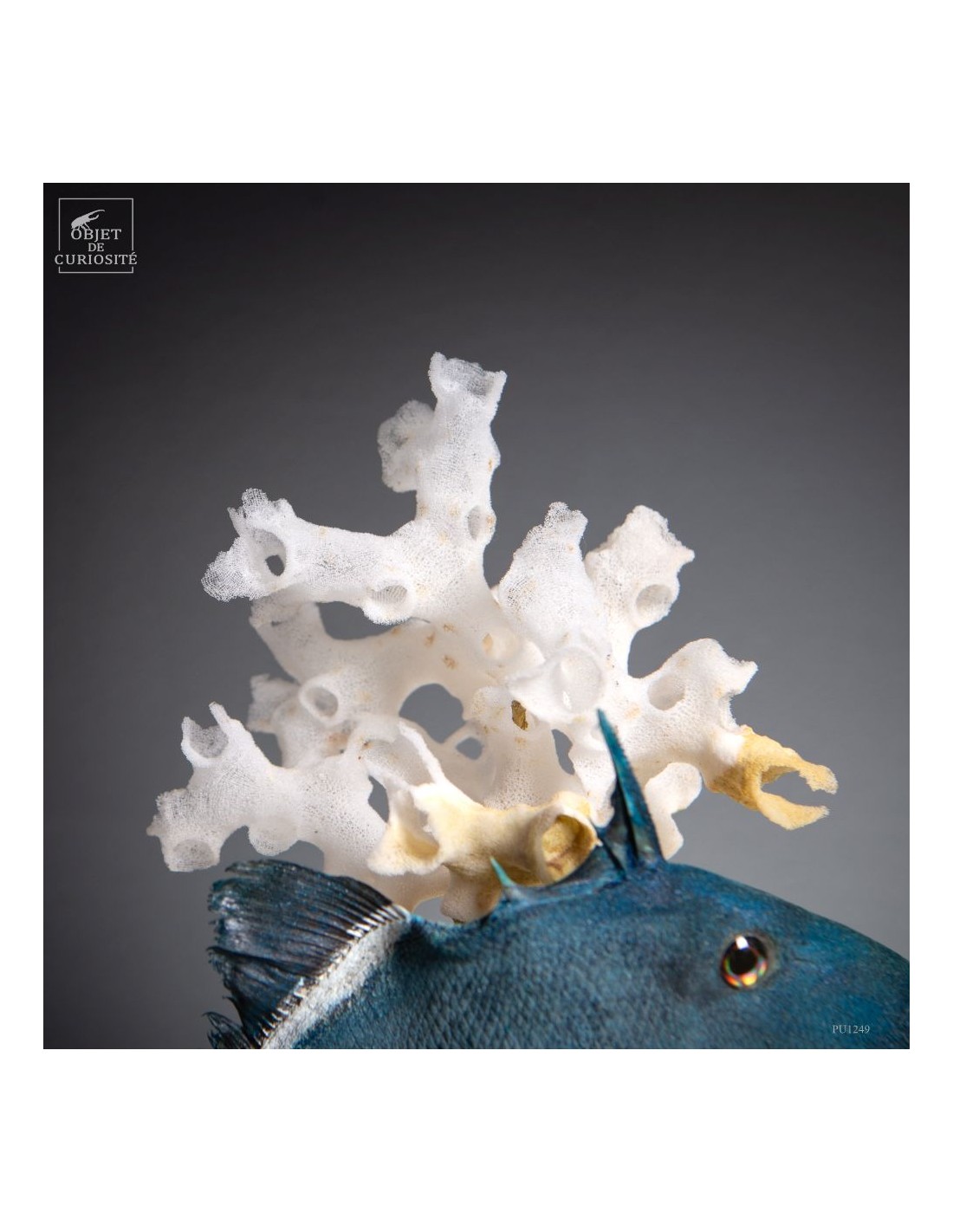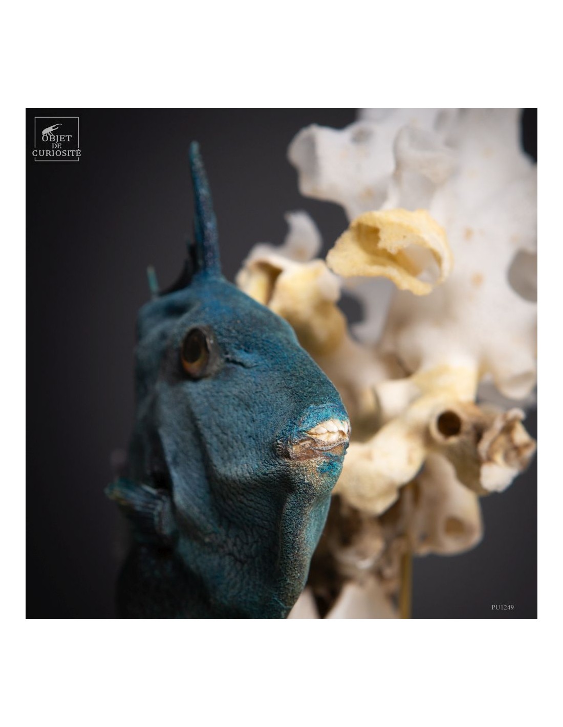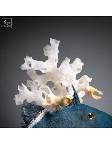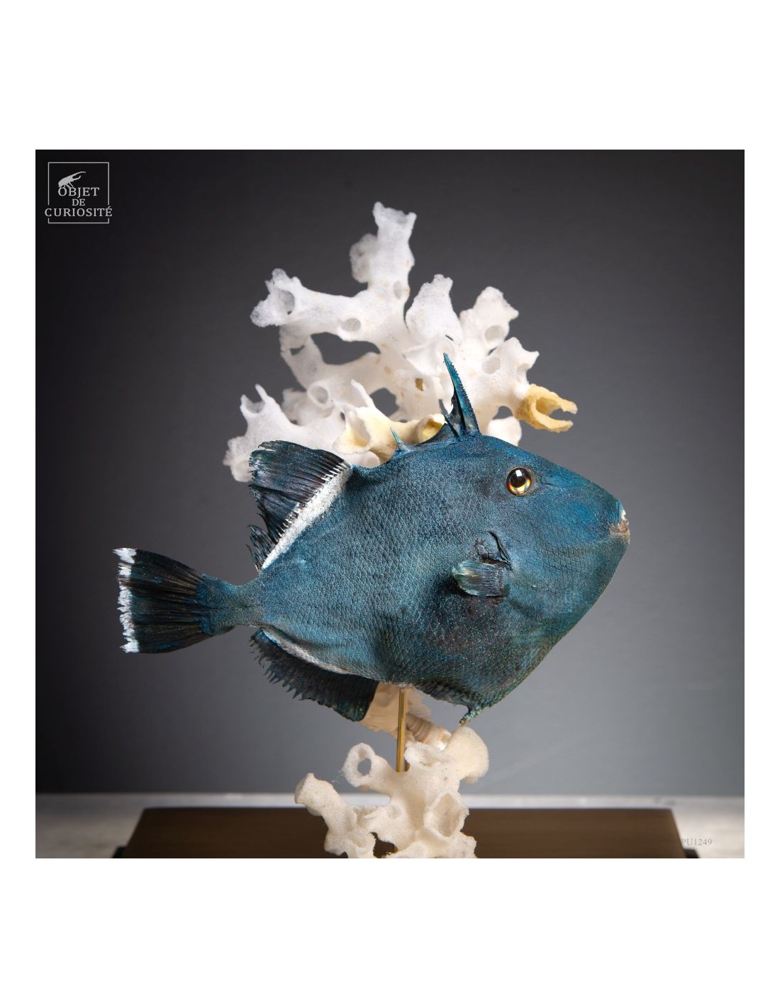 Comme pour la plupart des poissons naturalisés, une recolorisation minutieuse a été réalisée afin de restituer les nuances bleu ardoise et le maillage d’écailles propres à l’espèce.