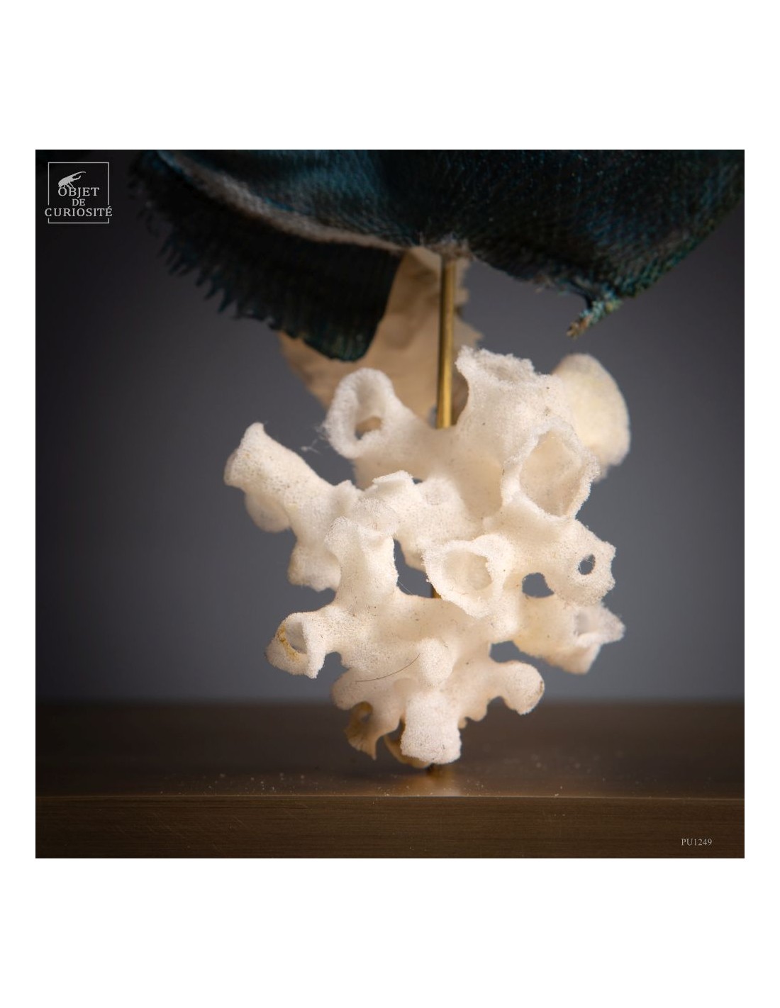 Monté sur une base en laiton, à l’intérieur d’une vitrine, il est présenté avec deux squelettes d’éponge calcaire (Clathrina sp.) : dans la nature, les tissus vivants de ces petites éponges recouvrent entièrement cette structure minérale. Ce n’est qu’une fois séchées que leur réseau poreux très fin, presque géométrique apparaît.