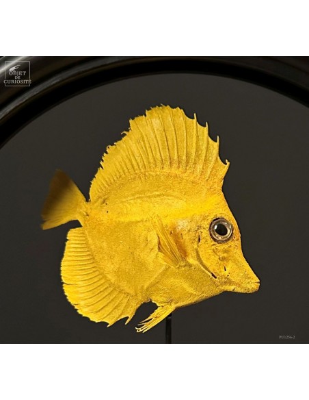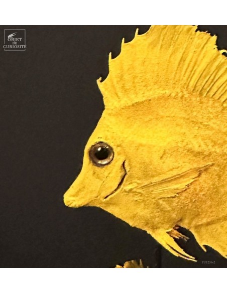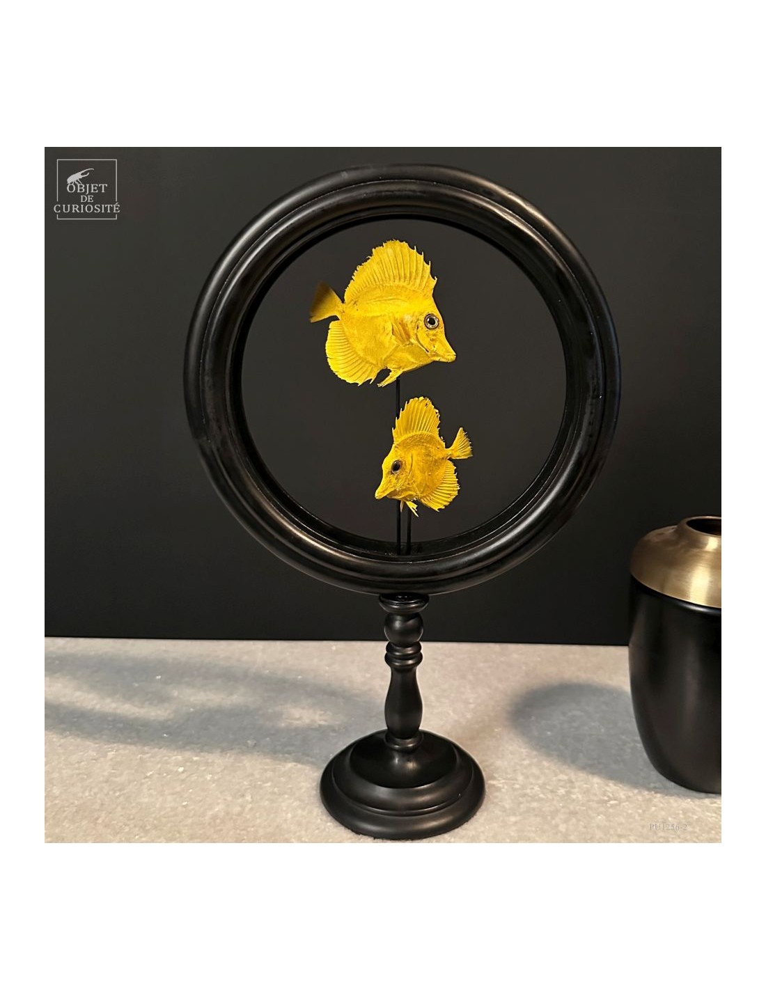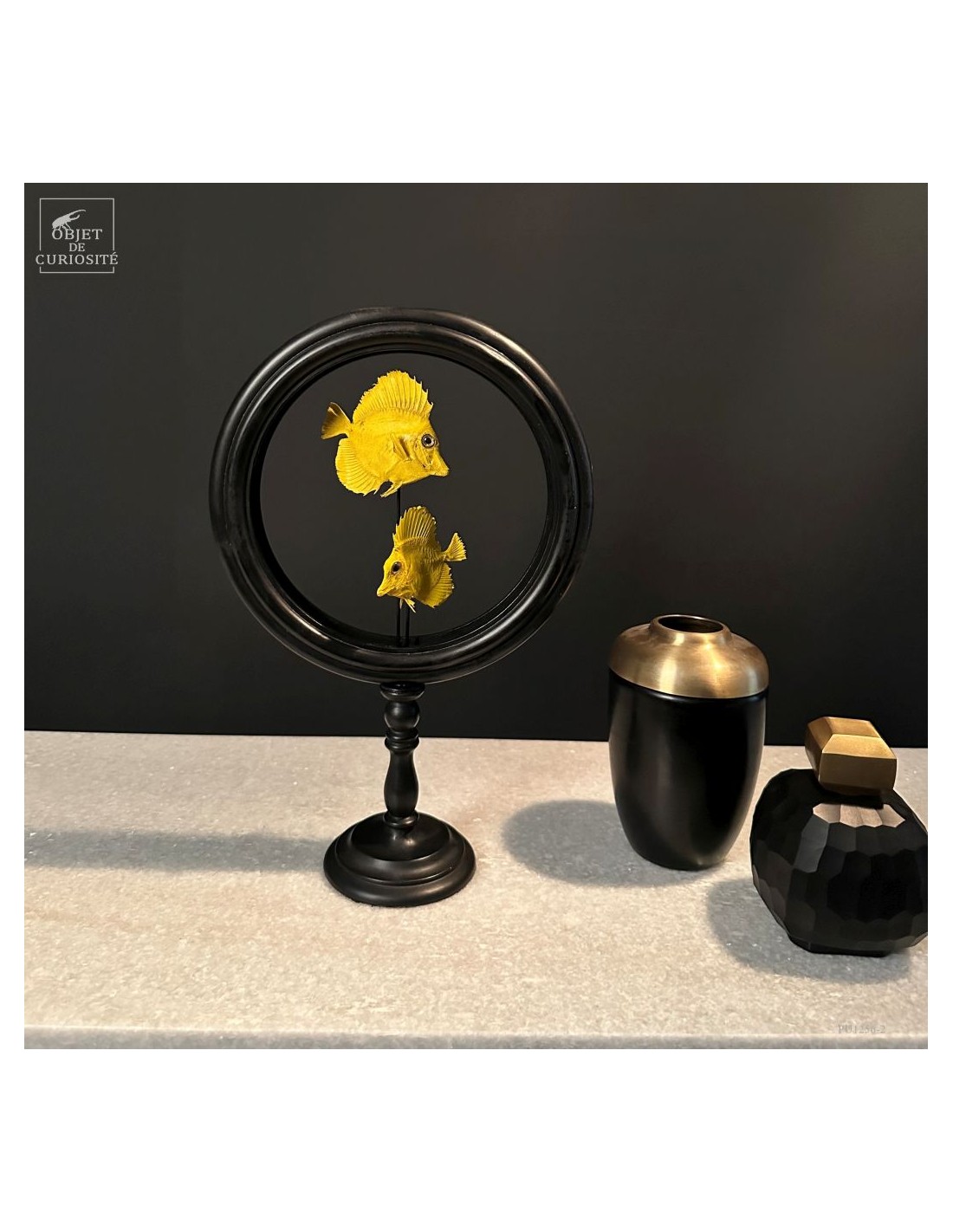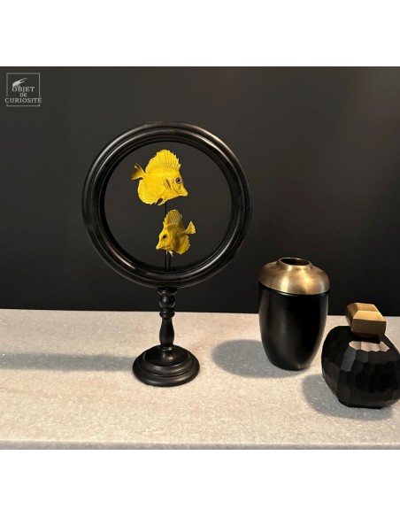 Un mini colloque de médecine dans un reliquaire noir: ce sont deux poissons chirurgien jaunes -ZEBRASOMA FLAVESCENS- taxidermisés, qui nagent chacun de leur côté. Cette espèce vit dans les récifs de coraux du Pacifique et de l'océan Indien. ils se nourissent d'algues qu'ils vont chercher entre les coraux grâce à leur long bec.