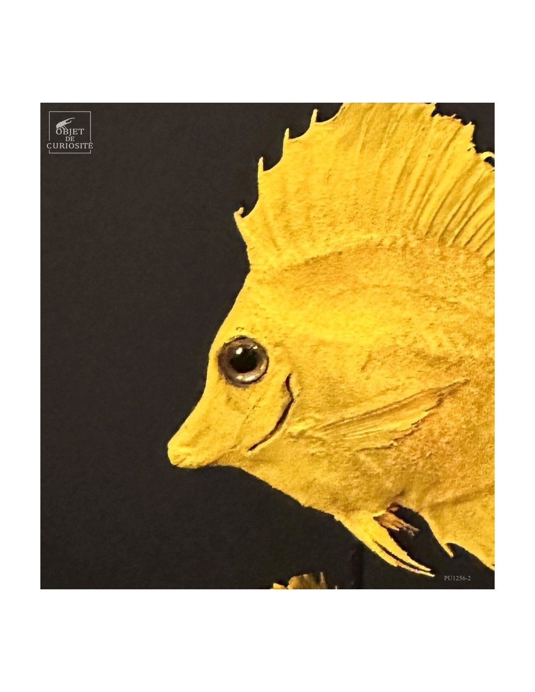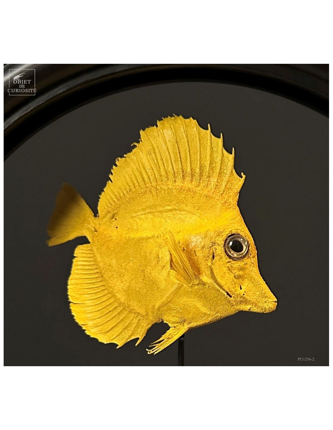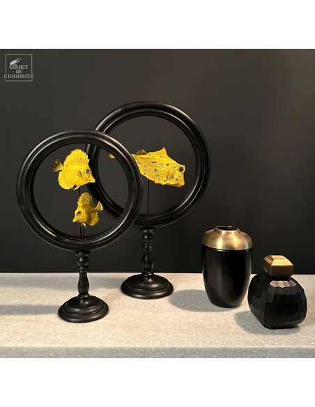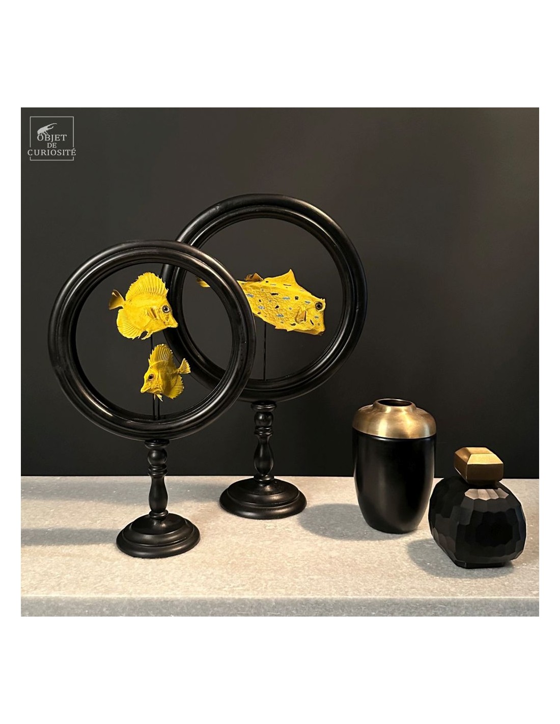 Un mini colloque de médecine dans un reliquaire noir: ce sont deux poissons chirurgien jaunes -ZEBRASOMA FLAVESCENS- taxidermisés, qui nagent chacun de leur côté. Cette espèce vit dans les récifs de coraux du Pacifique et de l'océan Indien. ils se nourissent d'algues qu'ils vont chercher entre les coraux grâce à leur long bec.